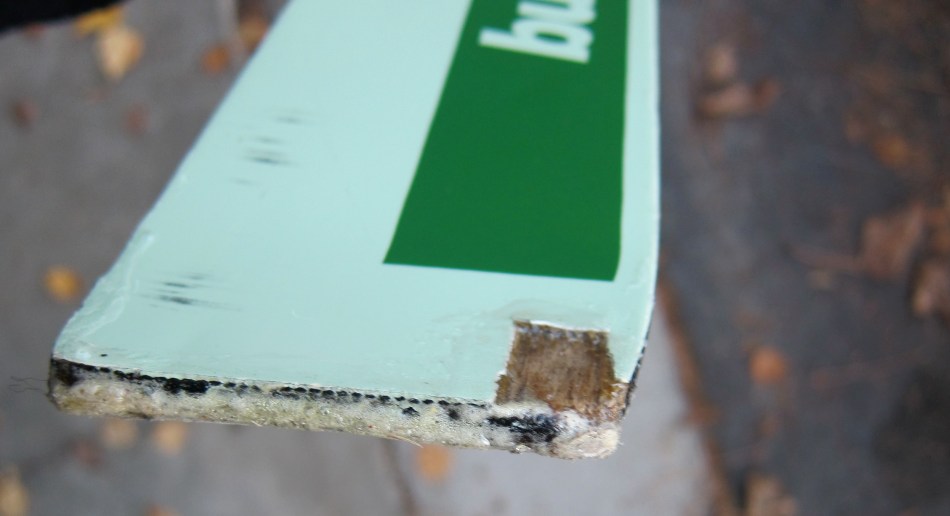 On to the Bushwackers, another recent ski swap acquisition. They were in rough shape, with delaminating tails and lots of chips off the edges, and wouldn’t have been worth the 25 dollars I paid for them were not such a unique ski. They’re wide, almost straight, with a fairly stiff camber and a half, plastic fishscale base (not extruded, actual plastic), and no metal edges at all. I’m not sure what role they will play, but to get them up and running I worked Gorilla Glue into the tails and clamped while they set over night. With the excess trimmed off, the tails and many places on the tips and edges got coats of Shoe-Goo for waterproofing.