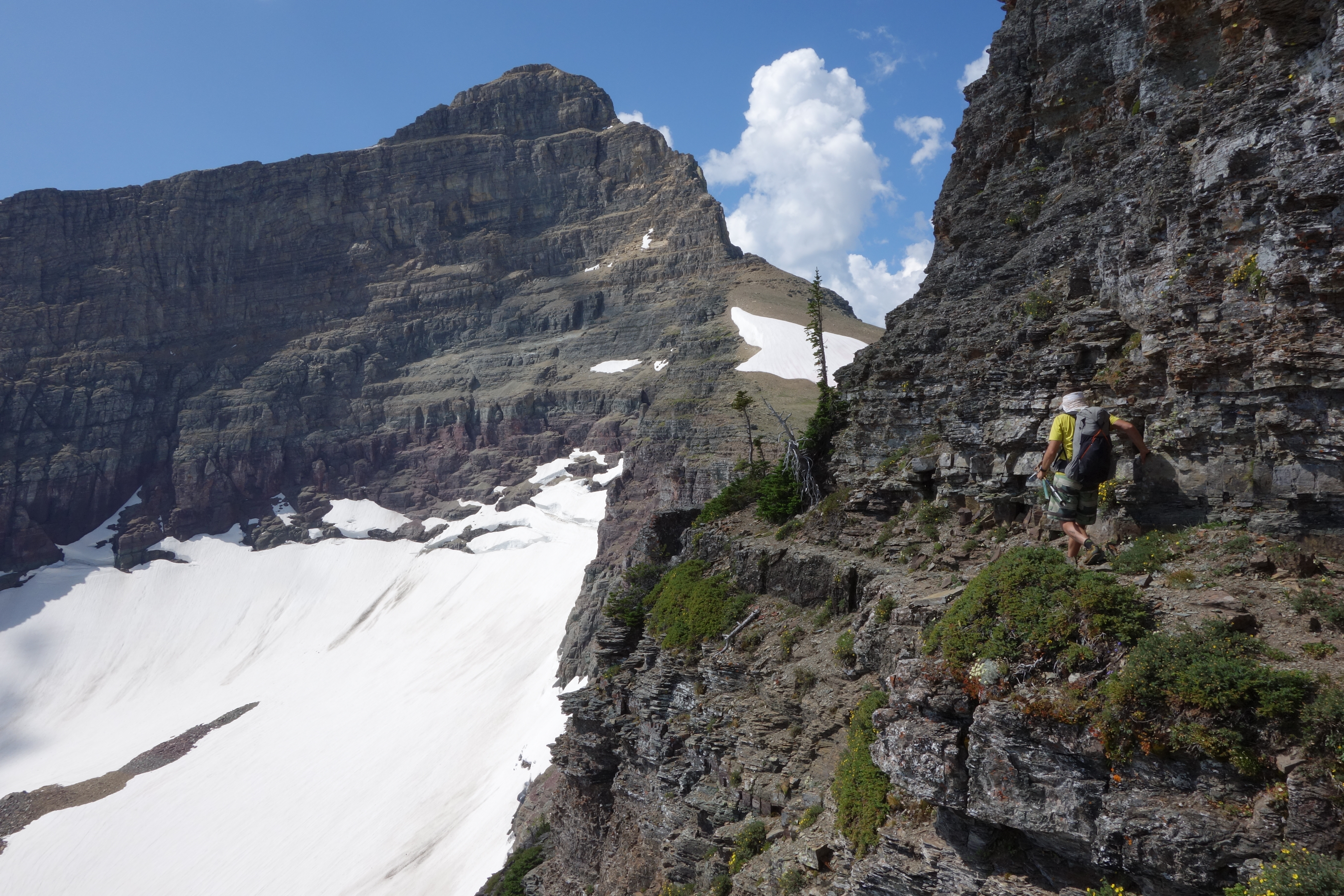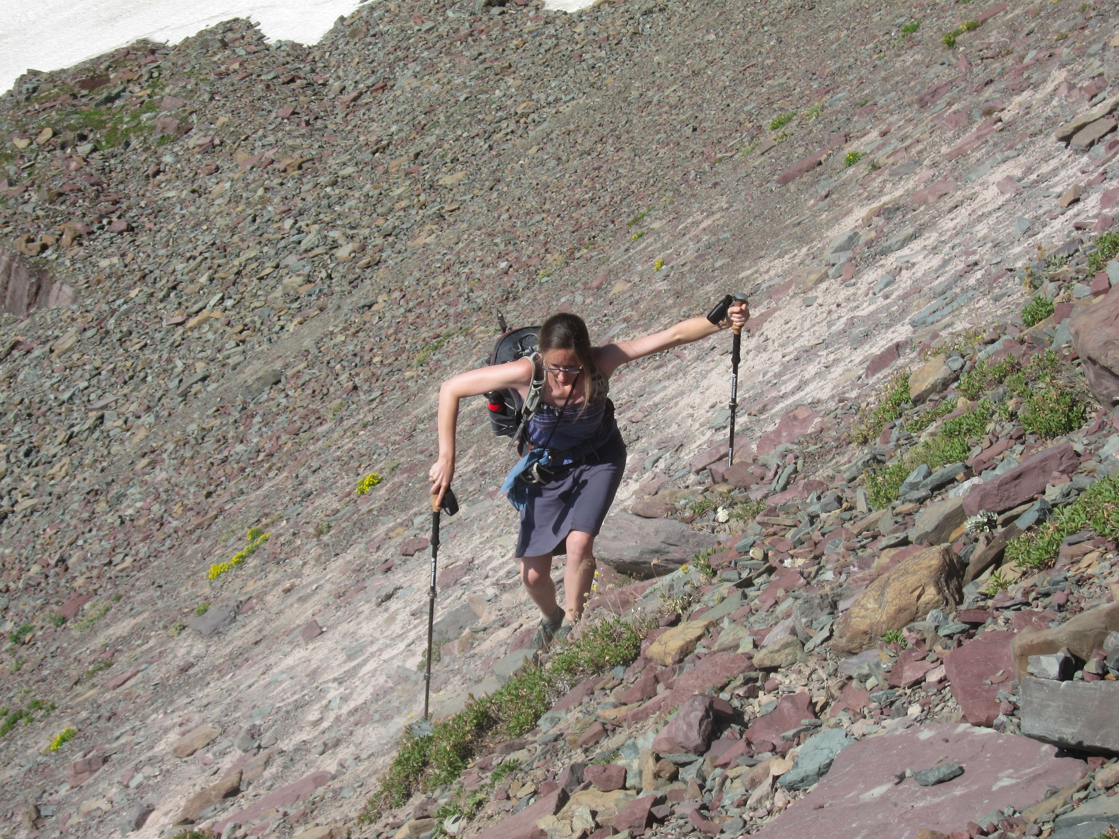 Second, you’ll be using different, much more delicate, techniques. M, above wearing Trail Gloves, is a good example. With mountain boots, the dreaded Glacier scree over rock-hard dirt can be sorted by kicking steps. With minimalist shoes, you’ll be smearing your way across on embedded rocks and minute weaknesses. Once your body gets there this is faster, but you’ll get slapped around along the journey to enlightenment.
