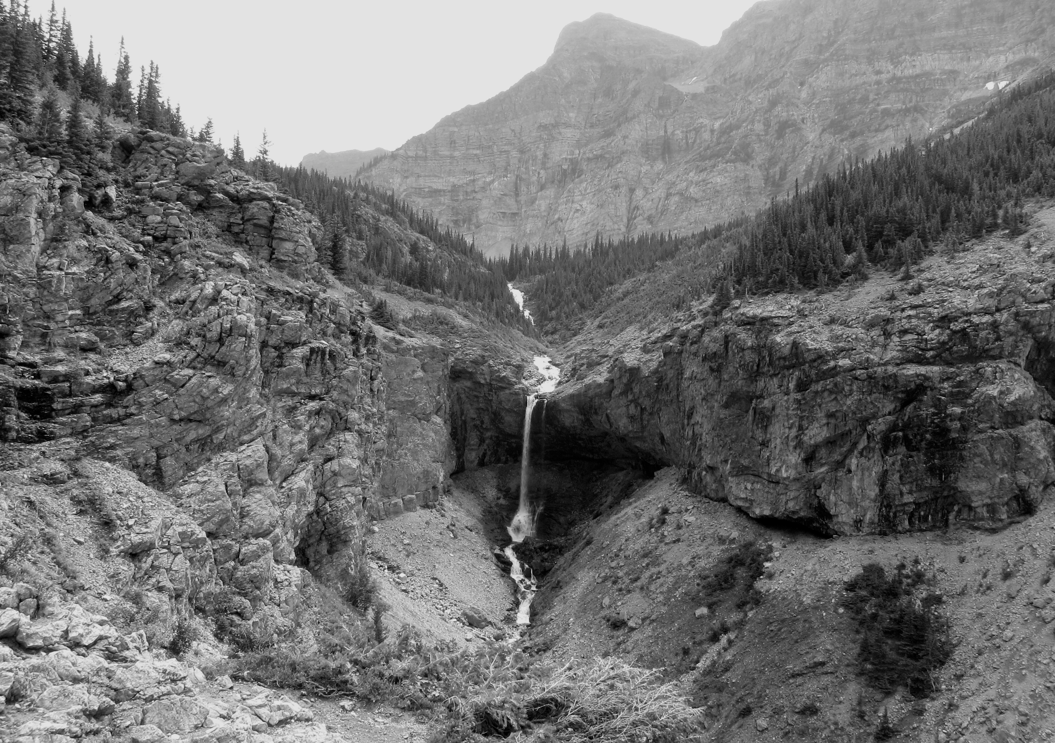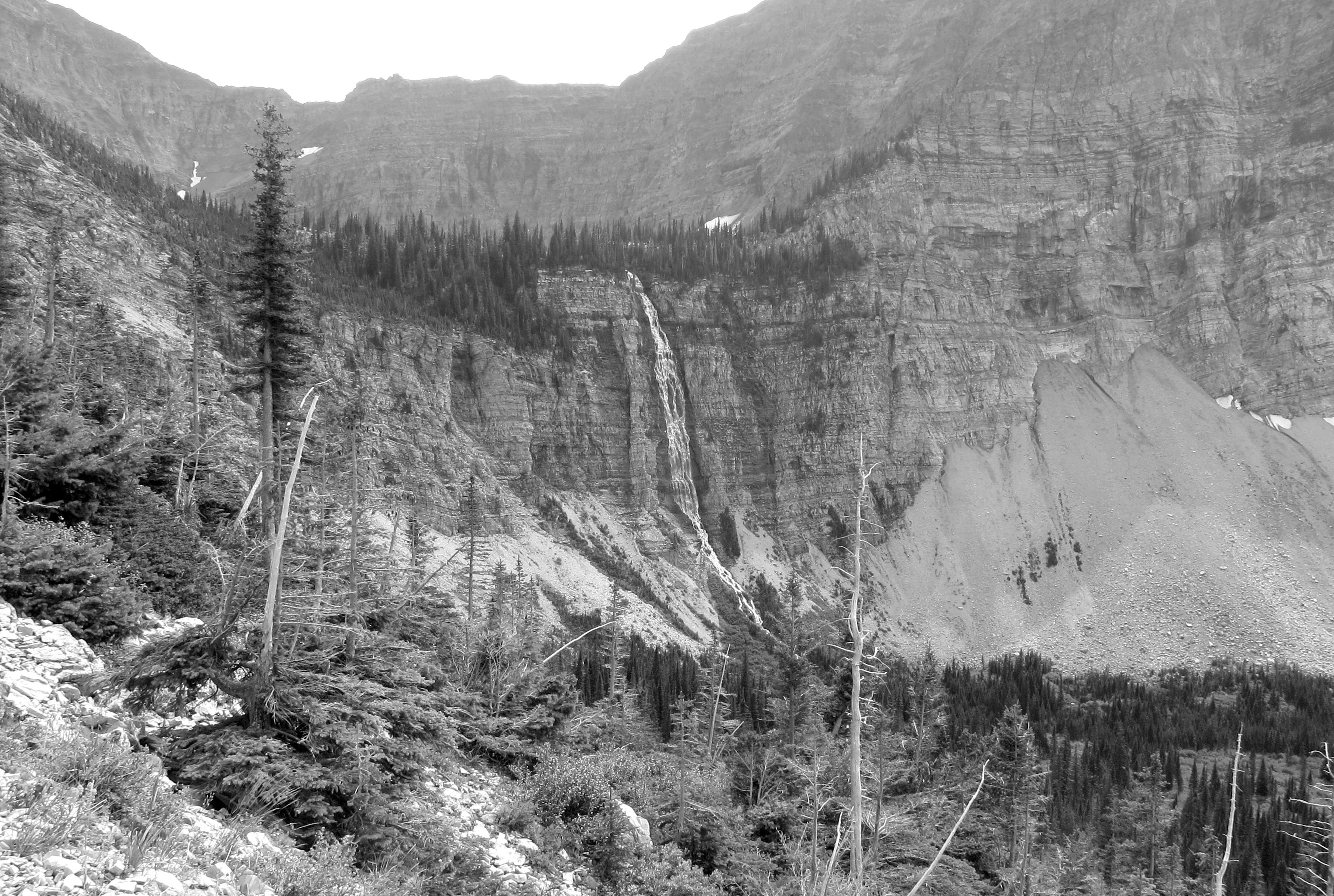 No photo can show the crypt outlet well. The lake was no visible egress, but 200 feet away, and perhaps 40 from the cliff edge, a strong stream issues from beneath a short limestone cliff and in 45 seconds creates the huge, thin waterfall shown above. Earlier in the year, with more hydraulic pressure from snowmelt, it must be quite a sight.