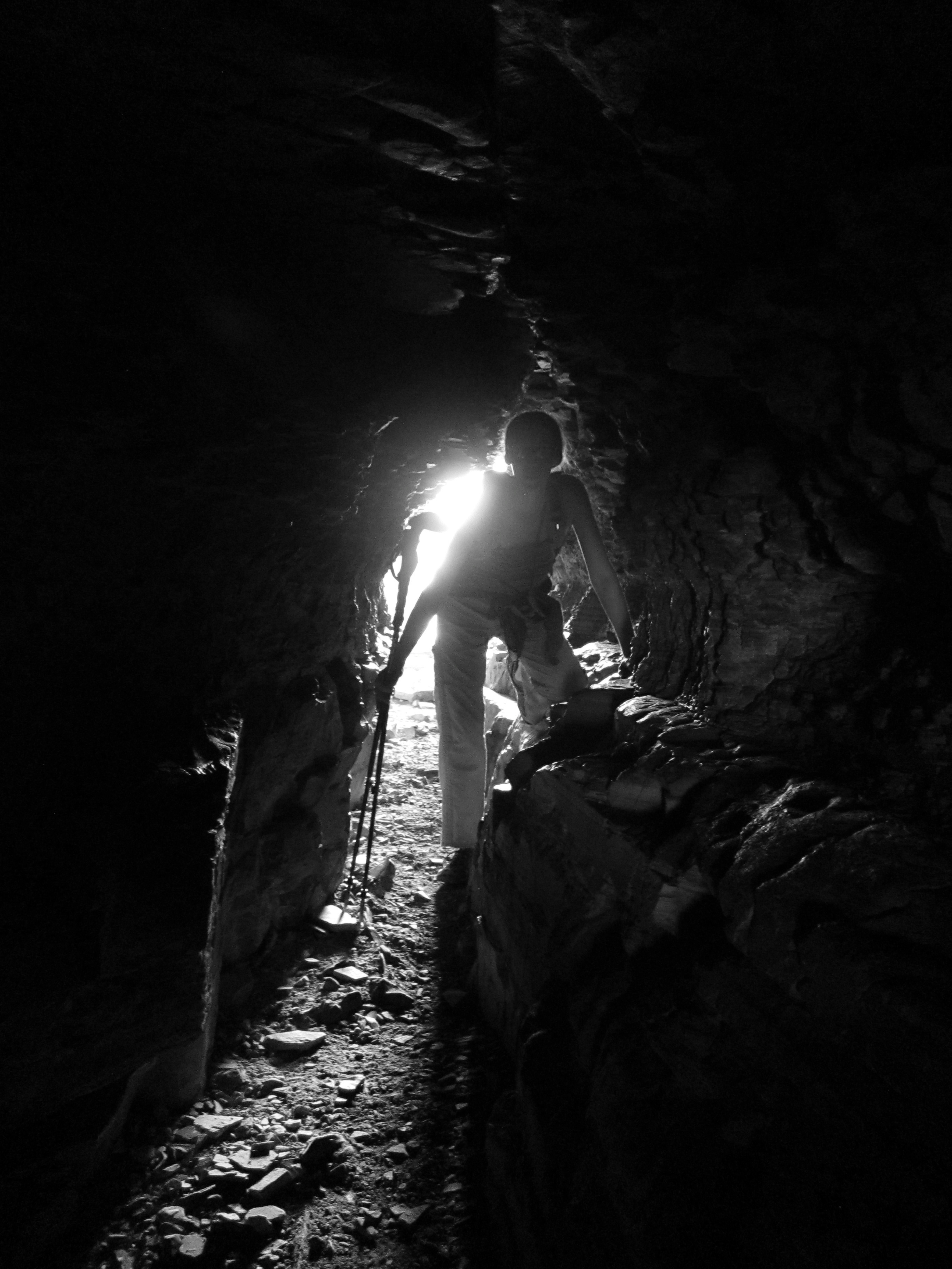 It seems to follow a natural weakness through about 60 feet of limestone, and was made with minimal human work. A ~6 foot human (i.e. me) can fit through perfectly when walking bent double.