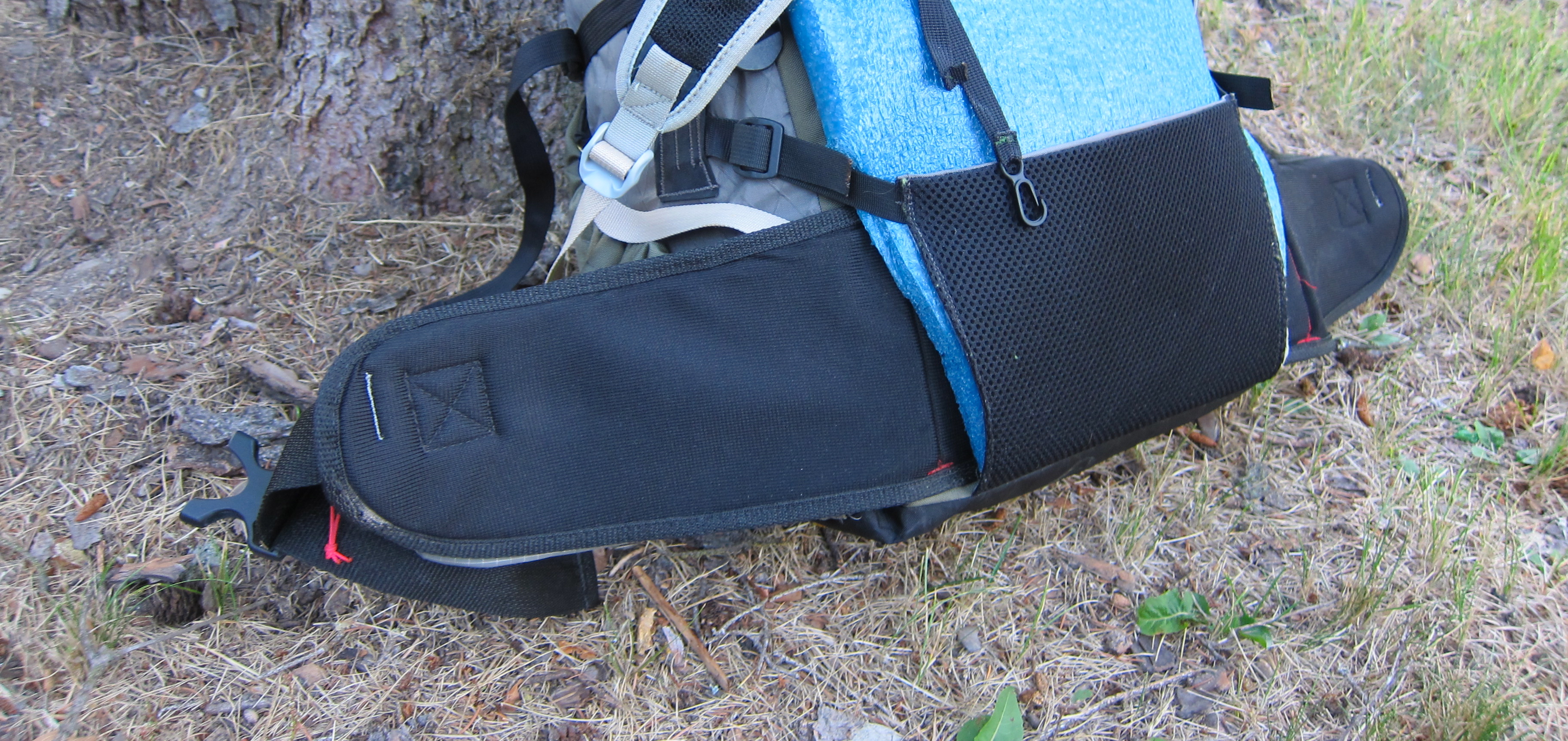 While there will always be a place for a frameless pack, it’s pretty easy to get a ~55 liter pack heavy enough to make stays a good idea. The above system is the cleanest and most effective of which I’m aware. The stays insert into channel (2″ webbing) which runs right up to the shoulder straps. The pockets on the hipbelt hold the stays in place, and the flap buckles over the belt and foam pad making it all stick together. Added bonus, this system is pretty simple to design and sew.