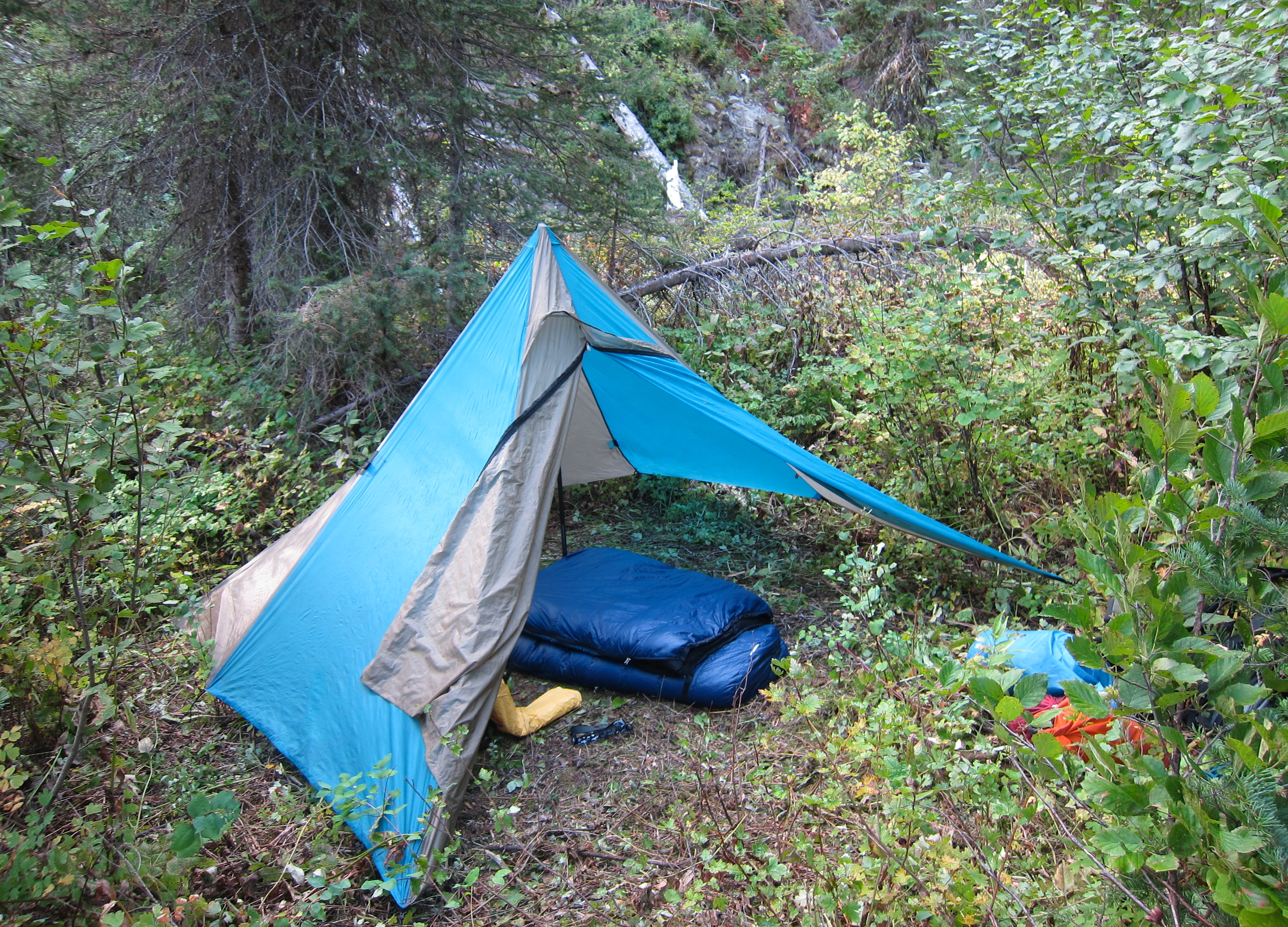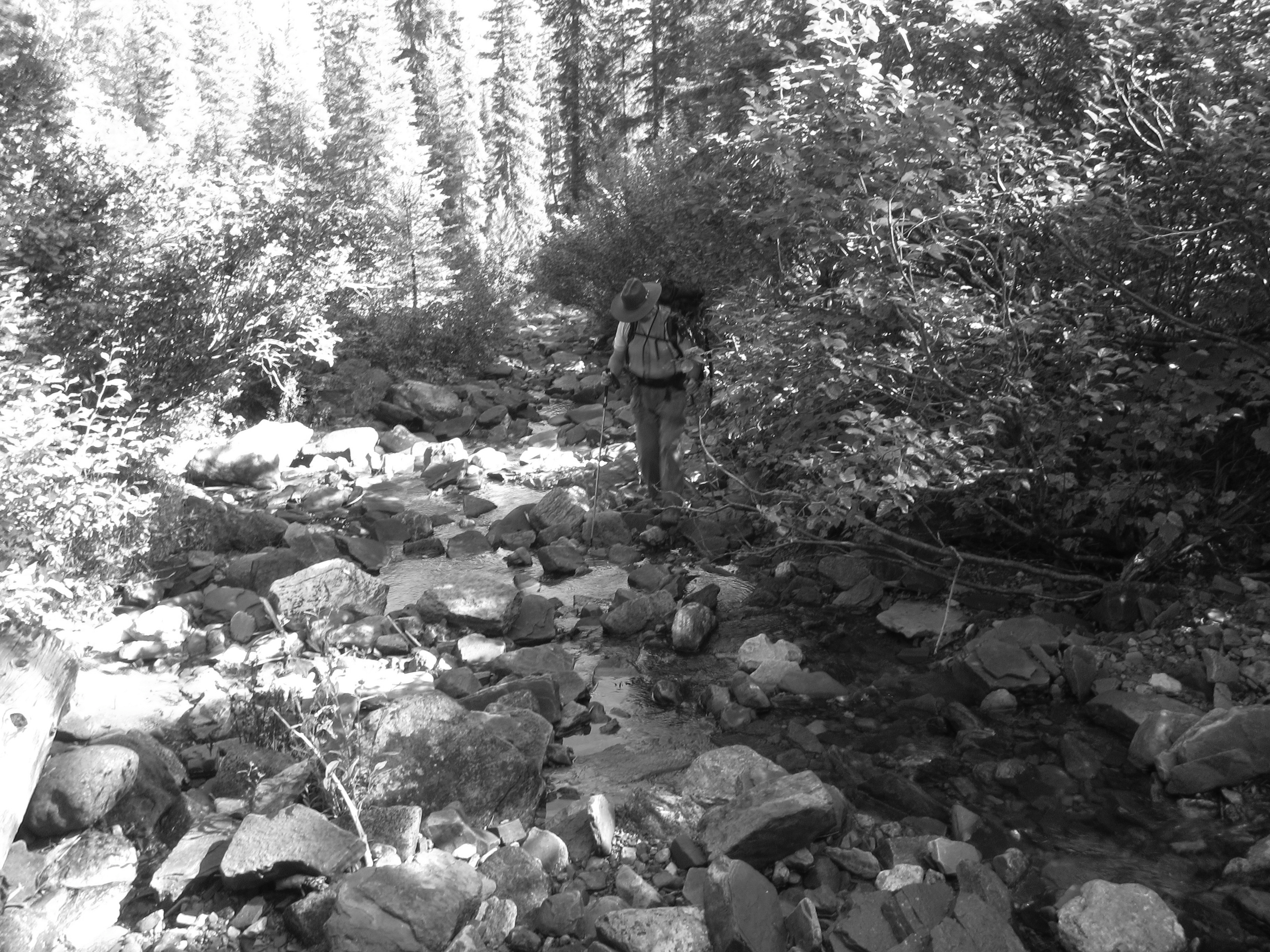 Near the base of an avalanche chute we found a flat area amongst the weeds, one of the few we’d seen, and stomped out a tent sight. Temperatures were up near 80. We hung the food, ate lunch, drank the scintillatingly cold creek water, and took a nap.