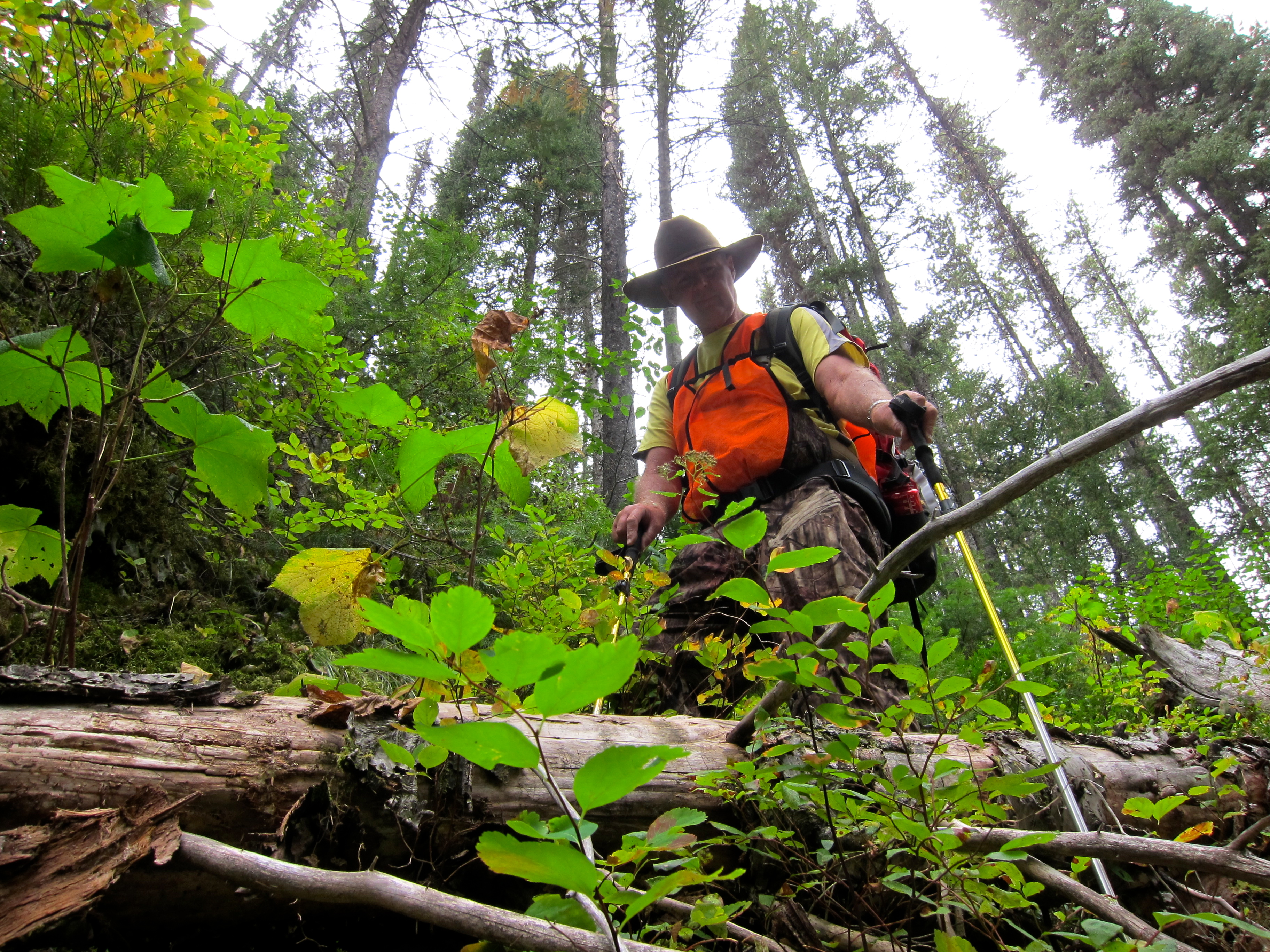 Using our enhanced intimacy with the land, I thought that instead of gaining elevation steadily in and near the creek, we’d contour one of our game trails and see how far it took us. We climbed a few hundred feet above camp to the best one before starting the long traverse, and while the path got fainter a few fresh tracks took us all the way to the ridge where the side canyon in which we’d been for so many hyperbolically protracted gave way to the main river valley. We had to pay the piper with a steep drop through the steep and deep, but it was a better route overall.