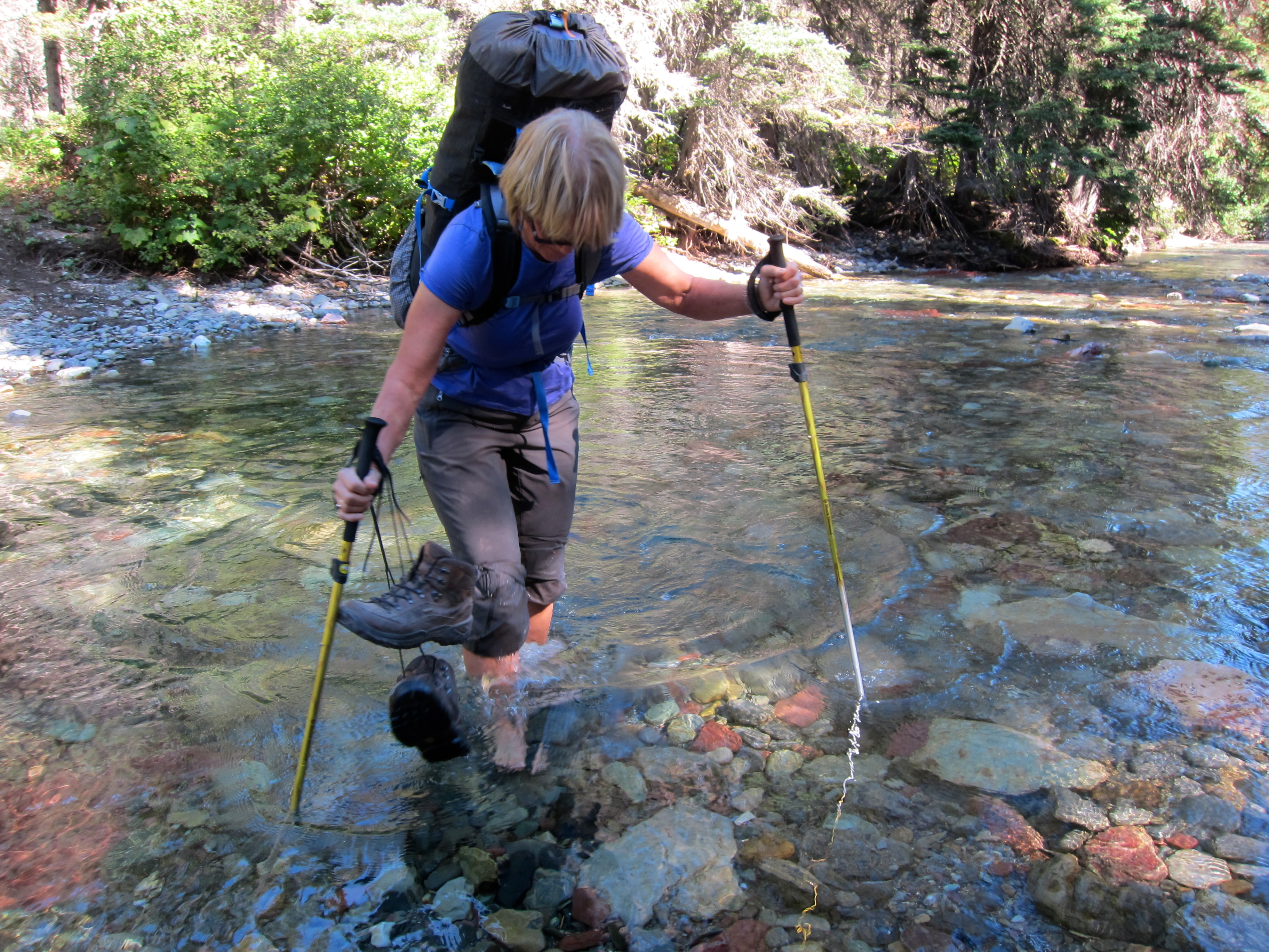 The world cooperated and gave us perfect weather for Gunsight Pass. The first day was crystal, and we saw every distant detail, along with a moose and calf in just the right spot along the way up to the lake. Mid-afternoon the campground was deserted, and we picked the best spot to setup before heading off on the side trail to Jackson Glacier basin.
