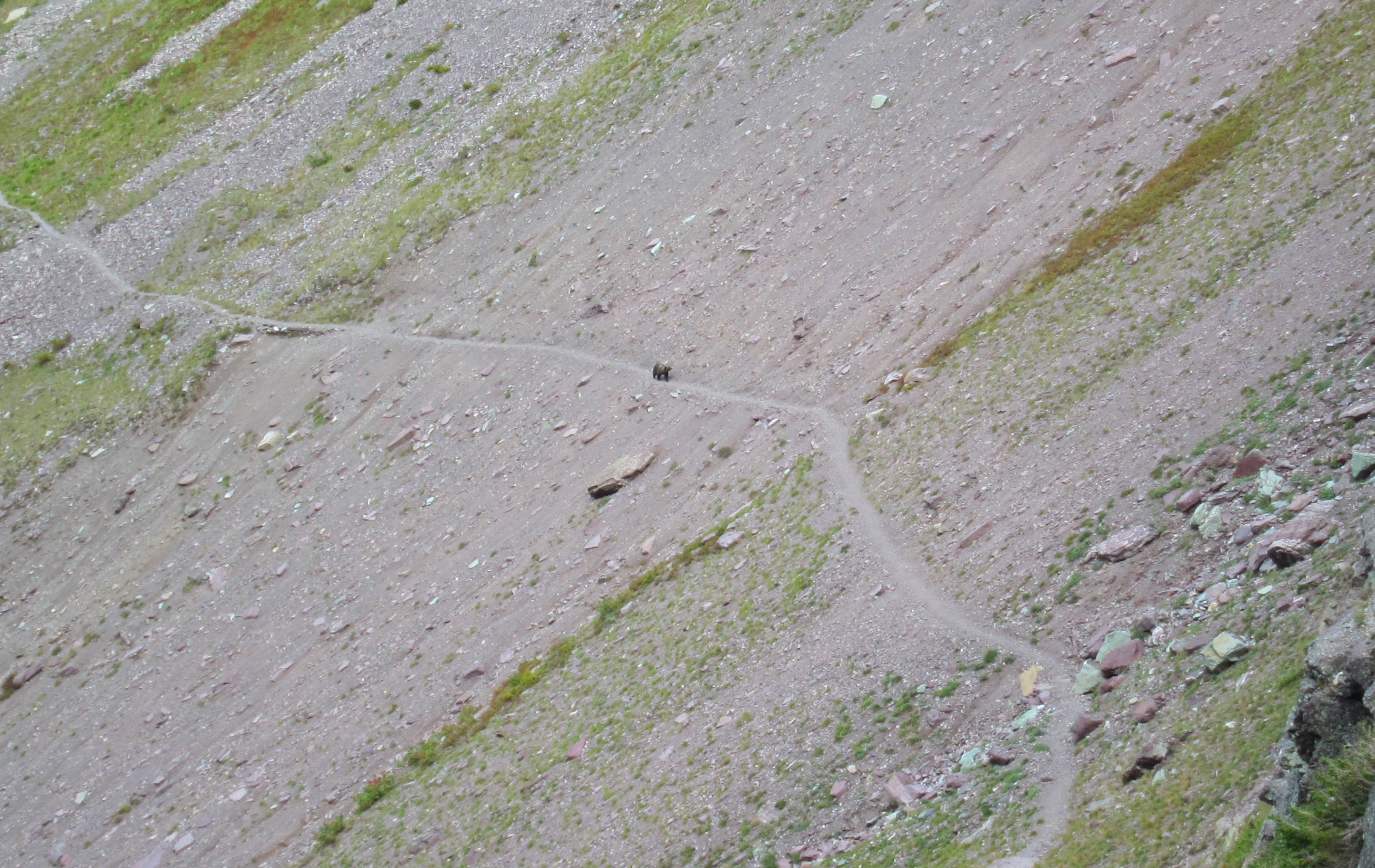 Grizz seem to have two speeds: extreme indolence and resolute purposiveness. This Grizz was leaving the lake for new pastures, and quickly. The big black and silver lump was quickly up on the trail and moving towards us, and we had little time to formulate and act on a plan. We scuttled to the apex of the last switchback, and went 100 yards beyond it out on the steep dirt. I could see no reason the bear would go out there, and expected him to cut the switchback anyway. Sure enough, he made it under the waterfall and with corpulent ease ascended the scree at around 8 mph up towards the pass.