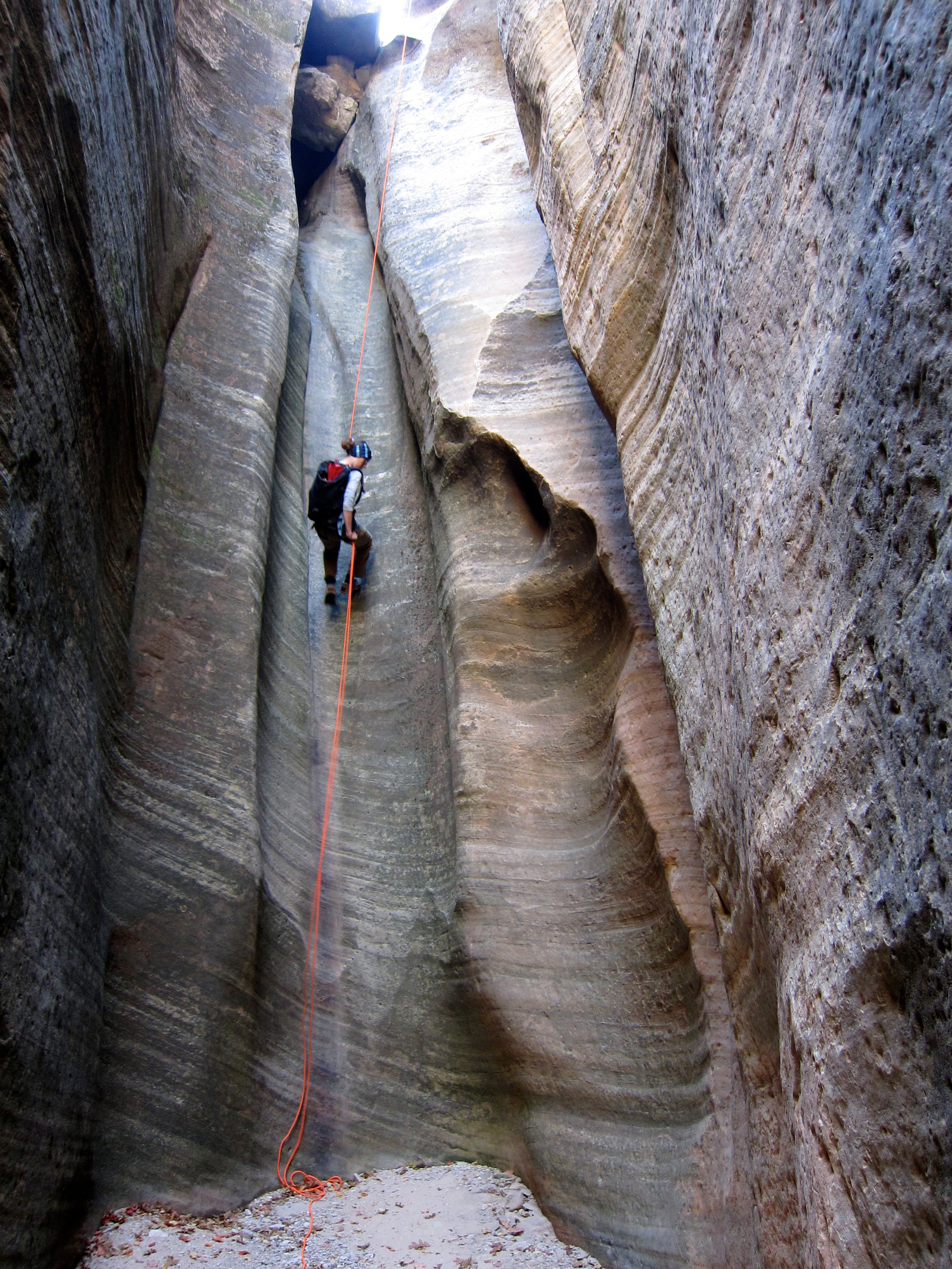Ariel about to go free on the last rap. There are two consecutive raps just as long at the start of the canyon, but those both end on slabby stances, and the rap above feels a lot more intimidating. After a little futzing the ropes were well sorted and we were all back on solid ground, with a short scramble down to the trail remaining.