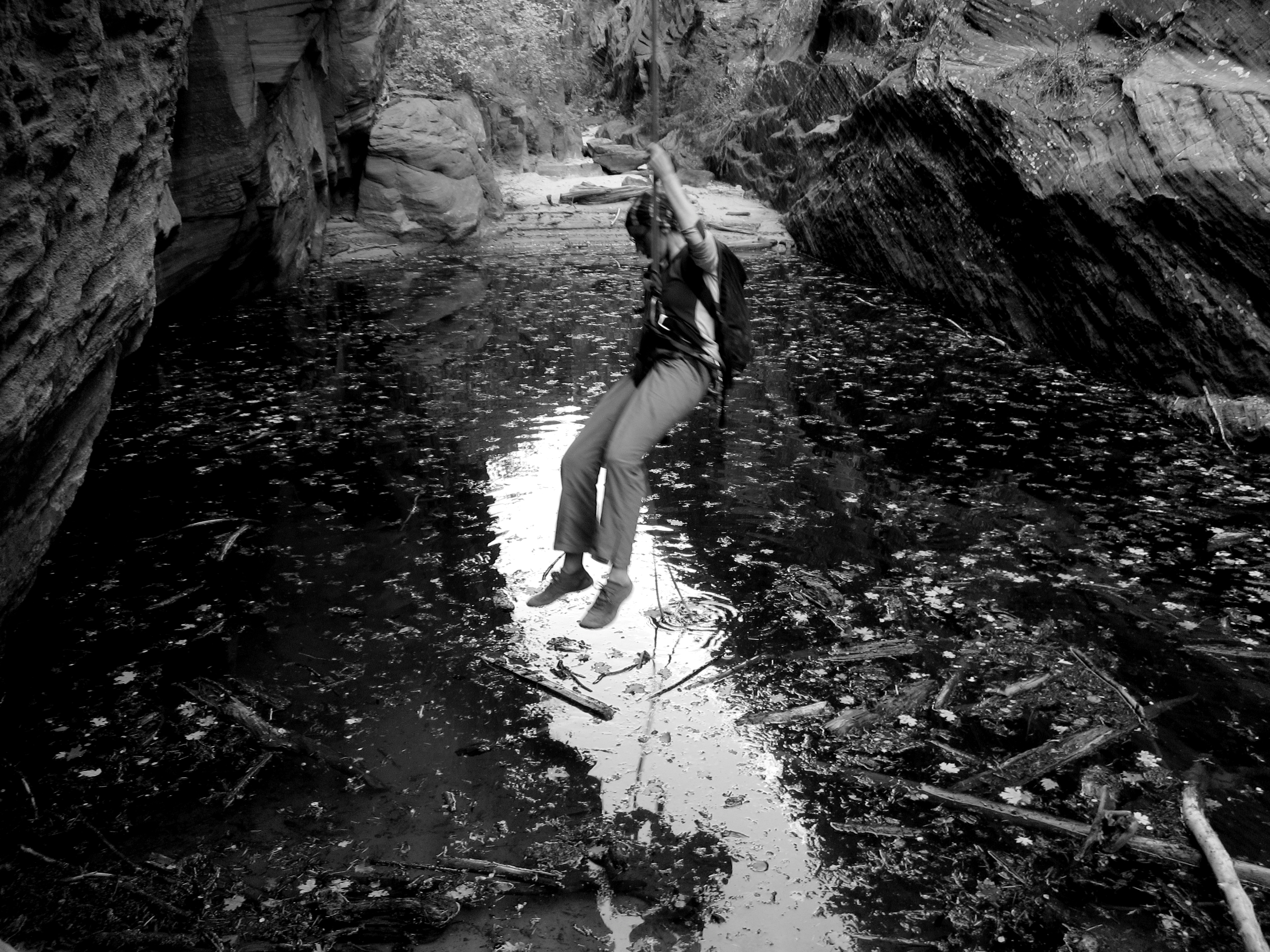 It was cold, but not as cold as one February when I busted in through snowdrifts on the approach and put on my drysuit to swim across the half-frozen lake. Then again, M and I had left the wetsuits behind to save weight. Mystery has a few mandatory deep pools, including a swimmer at the bottom of a 120 foot rap. Try as I might, I couldn’t swing over or around it. Air temps were warm enough that we did fine in soaked capilene, but we were also moving in a sufficiently focused manner that we took no pictures.