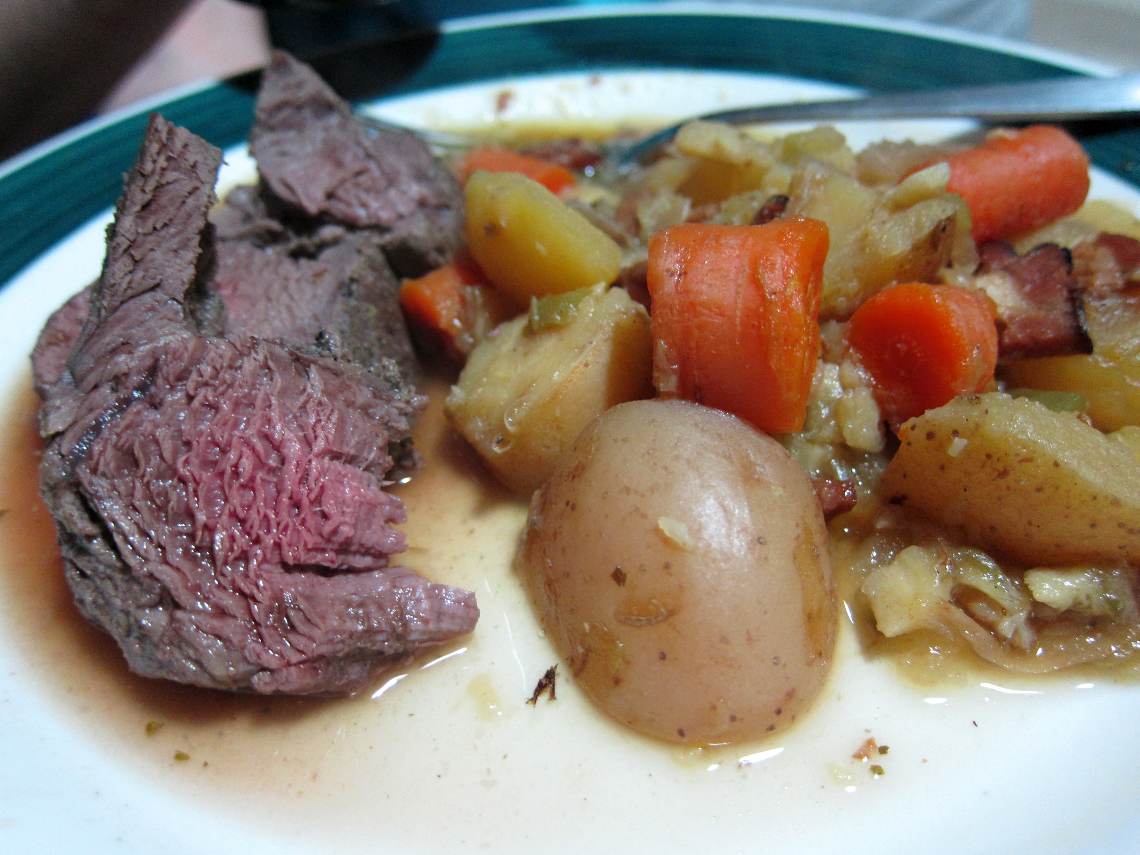 You can, and should, eat prime cuts from deer and their relations at least a bit rare. It was absolutely fantastic; served with a winter stew of new potatoes, turnips, carrots, onions, garlic, ham, and bell peppers.