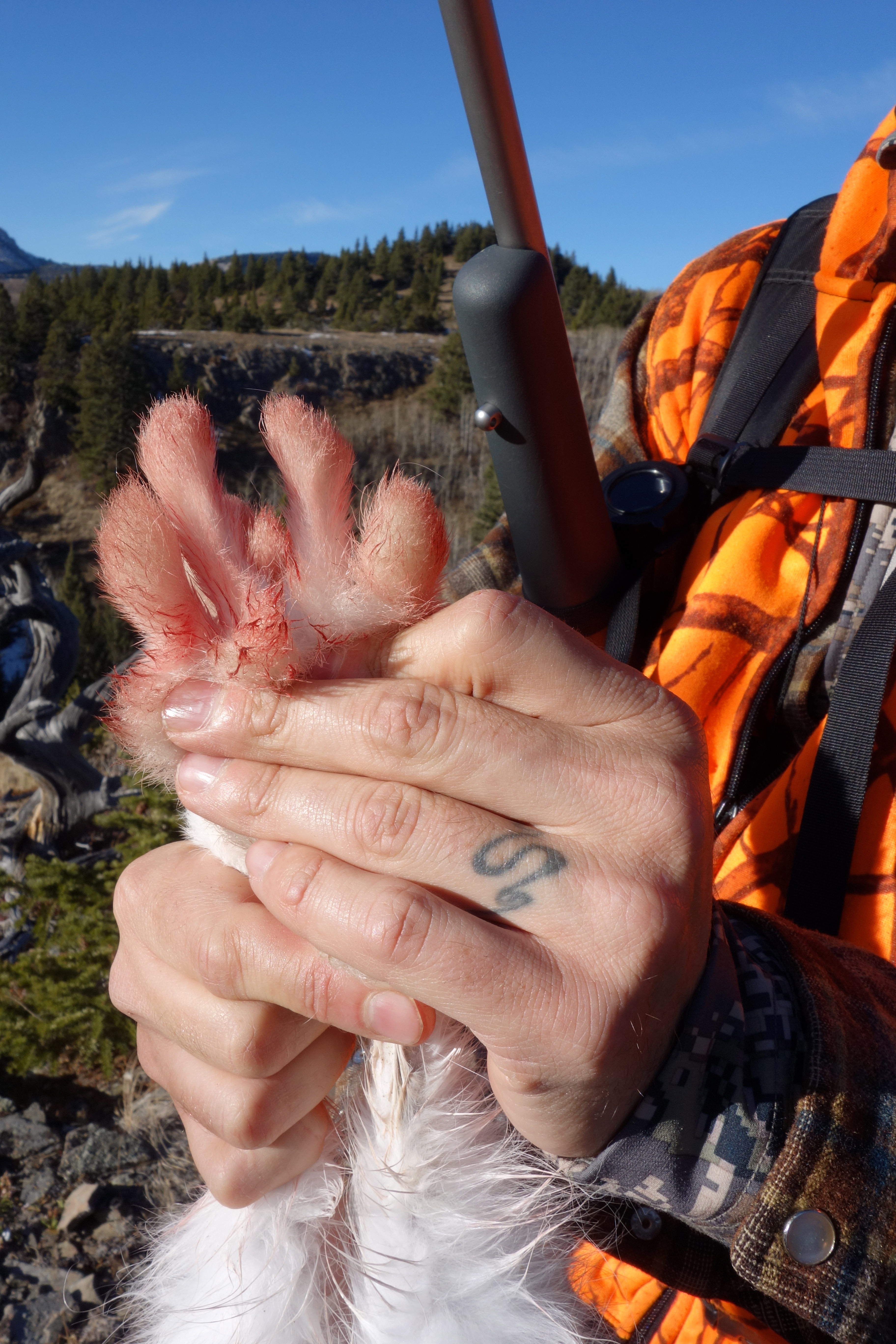 For Thanksgiving, and a last attempt on elk, M and I headed east for the plains along the foot of the Bob Marshall. Well into the first day out amongst the limber pines we were following a thread of a game trail up a steep hill when I saw a white dot ahead of us. A snowshoe hare. It took three attempts to get M’s attention. It just seemed like common courtesy to ask her if she minded me shooting it, before I took a seat, set the Kimber on the top of the Paradox Evolution (which works very well as a rest), and blew the hares head off at 20 yards.