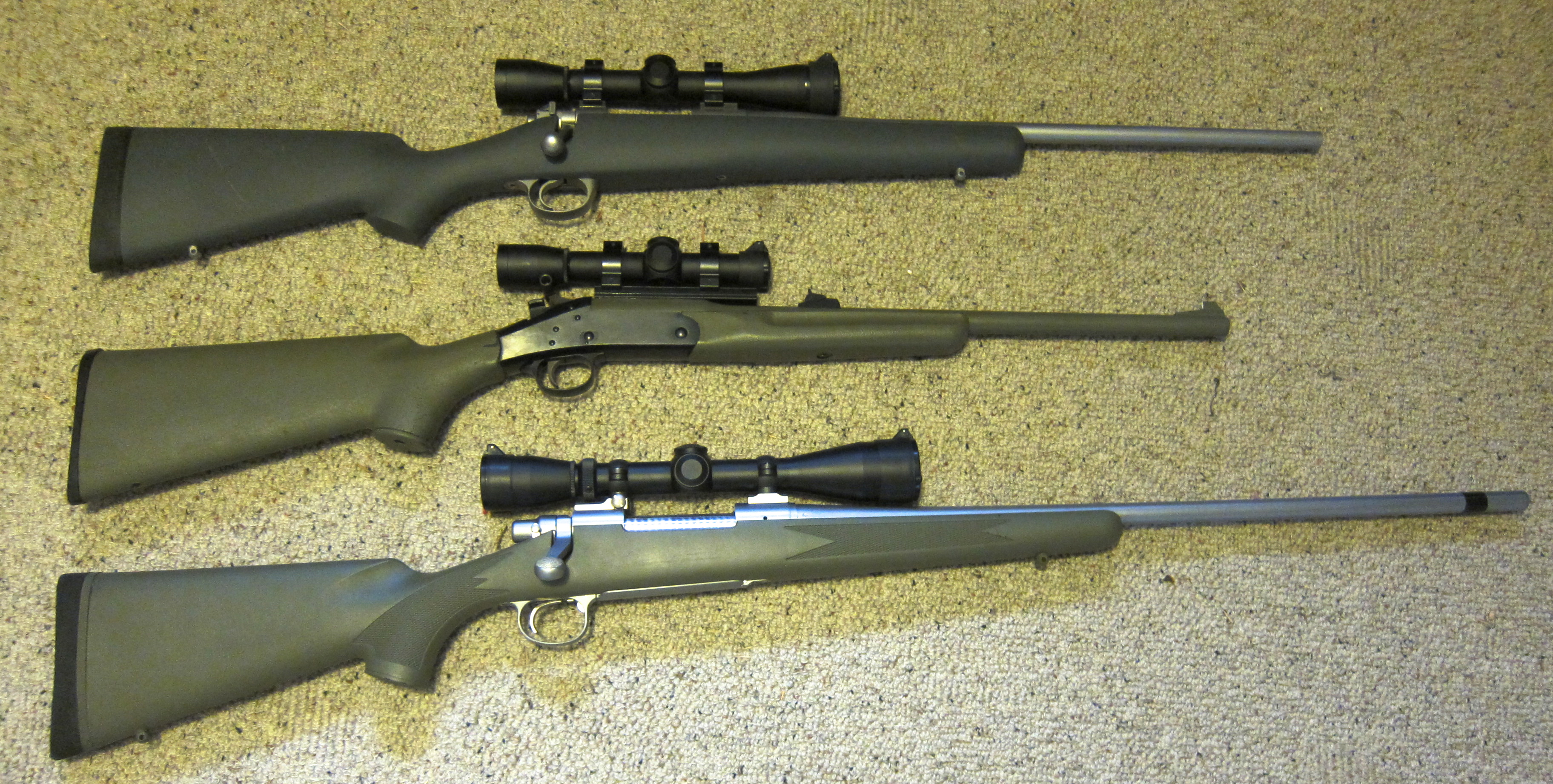 Top to bottom: Kimber Montana in .308 with 20″ barrel and 4x Leupold; H&R Superlight Handi-rifle in .243 with adult sized stock and 2.5x Leupold; Remington 700 in .30-06 with 3-9x Leupold.