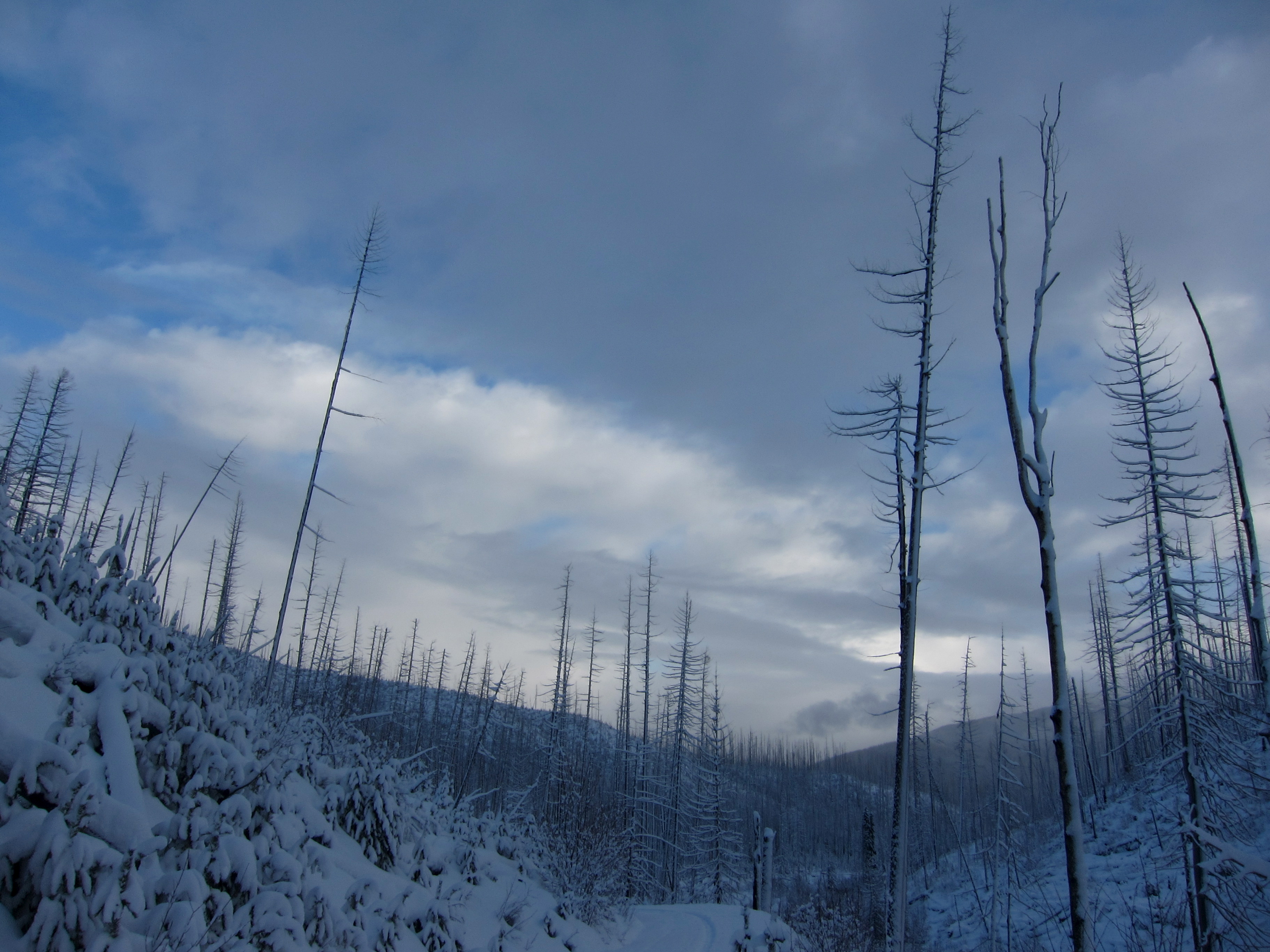 The above lake was covered in 2-3 feet of snow, and frozen very solid. Yesterdays fresh sat on a hard 2 inch crust, under which sat a foot plus of faceted junk. About forty feet after the photo was taken the whole crust settled down under my weight will a rolling, all-encompassing, reverberating whomph. It was intimidating, no matter how sure I was that the ice was thick.