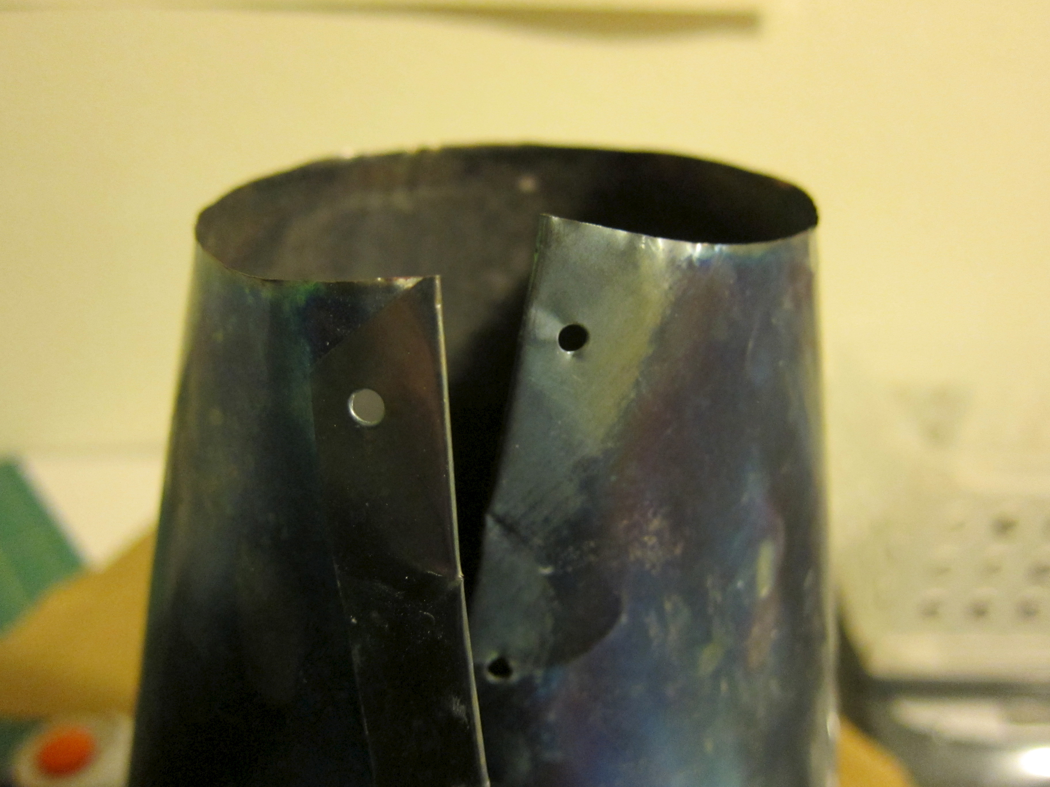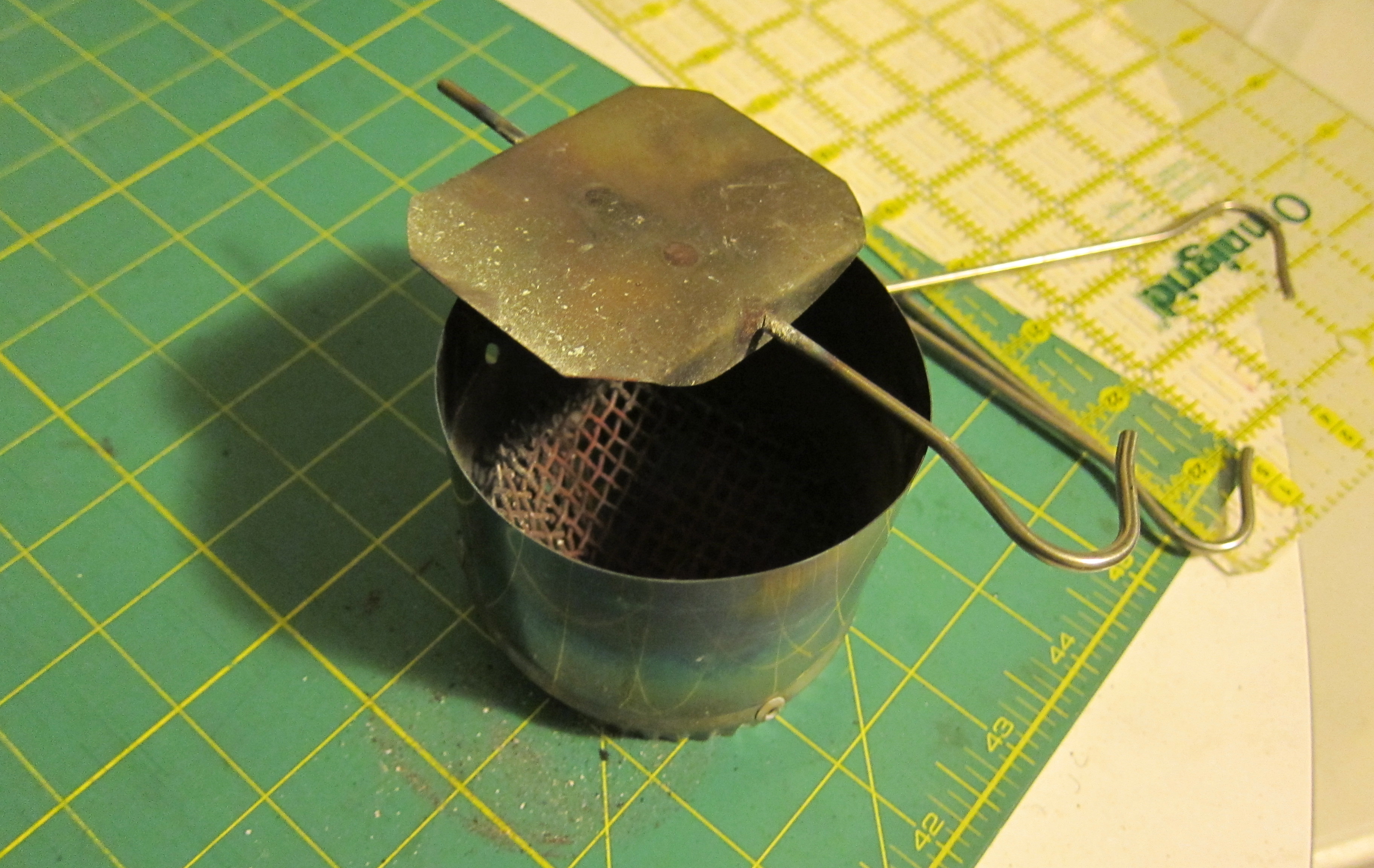 The damper has a wire mesh screen in the bottom, to act as a spark arrestor. The damper flap is welded on to a ti stake. Getting the flap assembly into the body of the damper requires a bit of trickery; thread the curved end of the stake through the hole on the side, slide all the way to the flap, then squeeze the damper body to flex it enough and allow the far end of the stake to get through. Easy and obvious once you’ve done it once.
