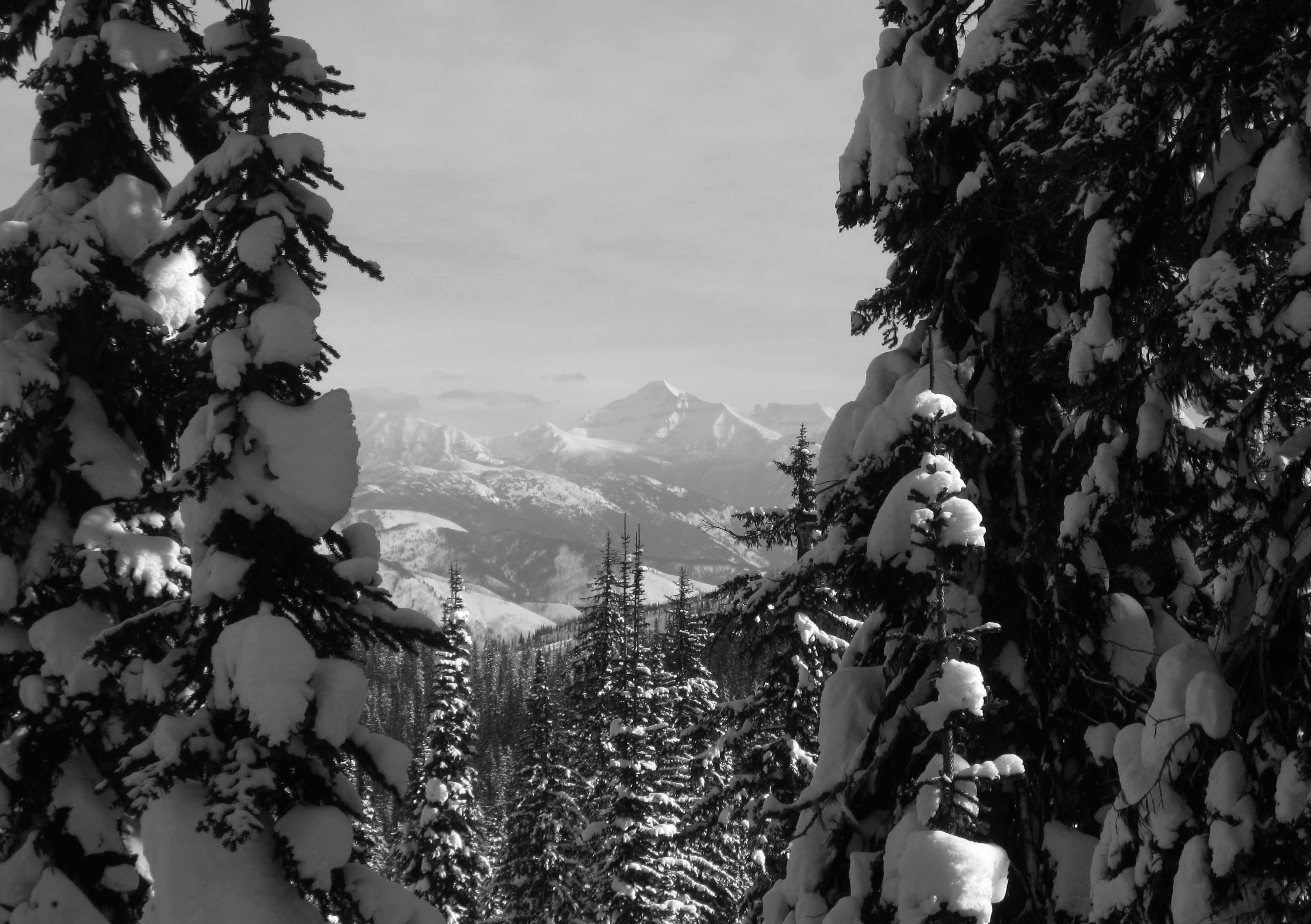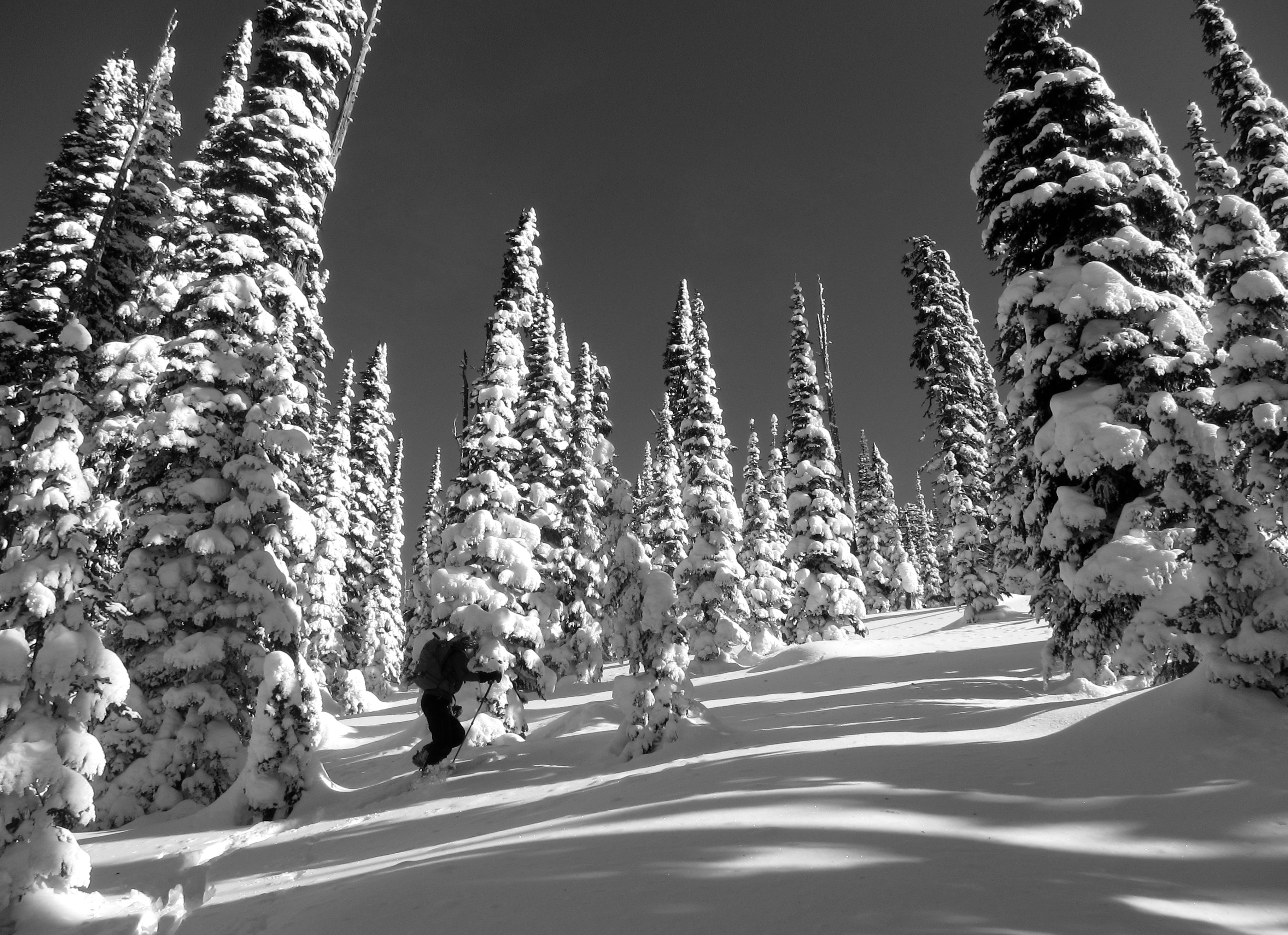 We leapfrog out toward the valley, taking a line over the finger-ridges designed to maximize elevation gain and loss. On the ascent we’re just cool enough, thanks to the wind, that it’s easy to not sweet. The descents continue to be dream perfect. The angle is steep, but not intimidating or hazard-prone. The trees shelter the snow and keep it undisturbed, but are spaced enough for fast passage and diverse line choice. The wind rattles rime clumps in the tallest snags, some forgotten prayer bell crafted by alpine sprites.