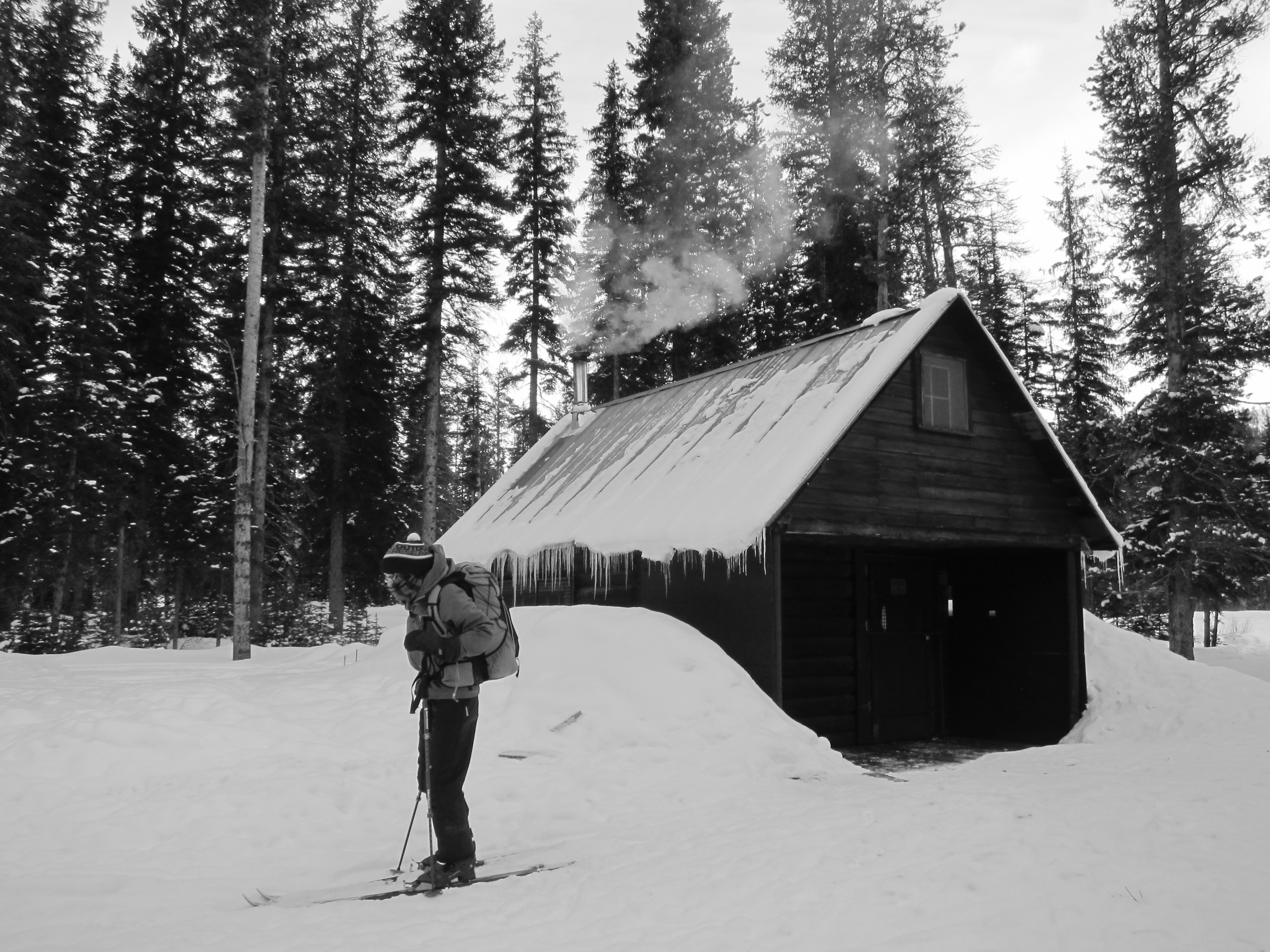 For the record, our cabin was Challenge up in the western shadow of the Continental Divide, and it is a very nice cabin, only rented Dec 1 thru March 31st. It is the best of both cabin worlds, being 7 miles from the pavement, and road accessible in the summer (ergo it has a propane stove and lights). The road in is trafficed by snowmachines, and groomed regularly. We had cold, grainy snow which gave poor glide. Under similar conditions, it would be an ideal fatbike destination. Bike to the cabin, backcountry ski from there.
