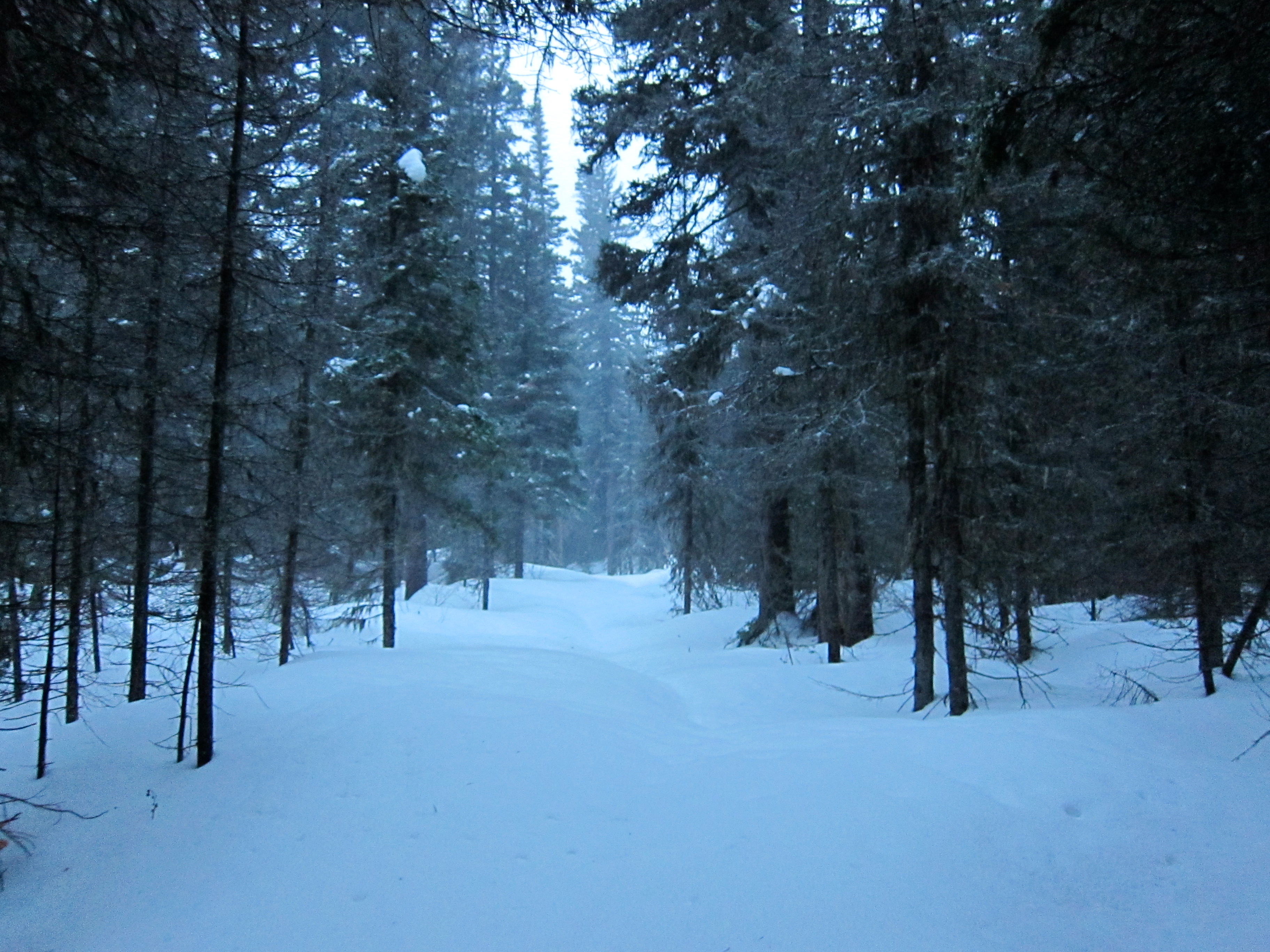 An hour later, and 500 meters down the trail from camp, I came upon this tree, freshly fallen across my tracks from the day before. In summer, you’d be right there and psyched to make the last 20-30 minutes back to the pavement. In winter, the same spot felt way the hell out there.