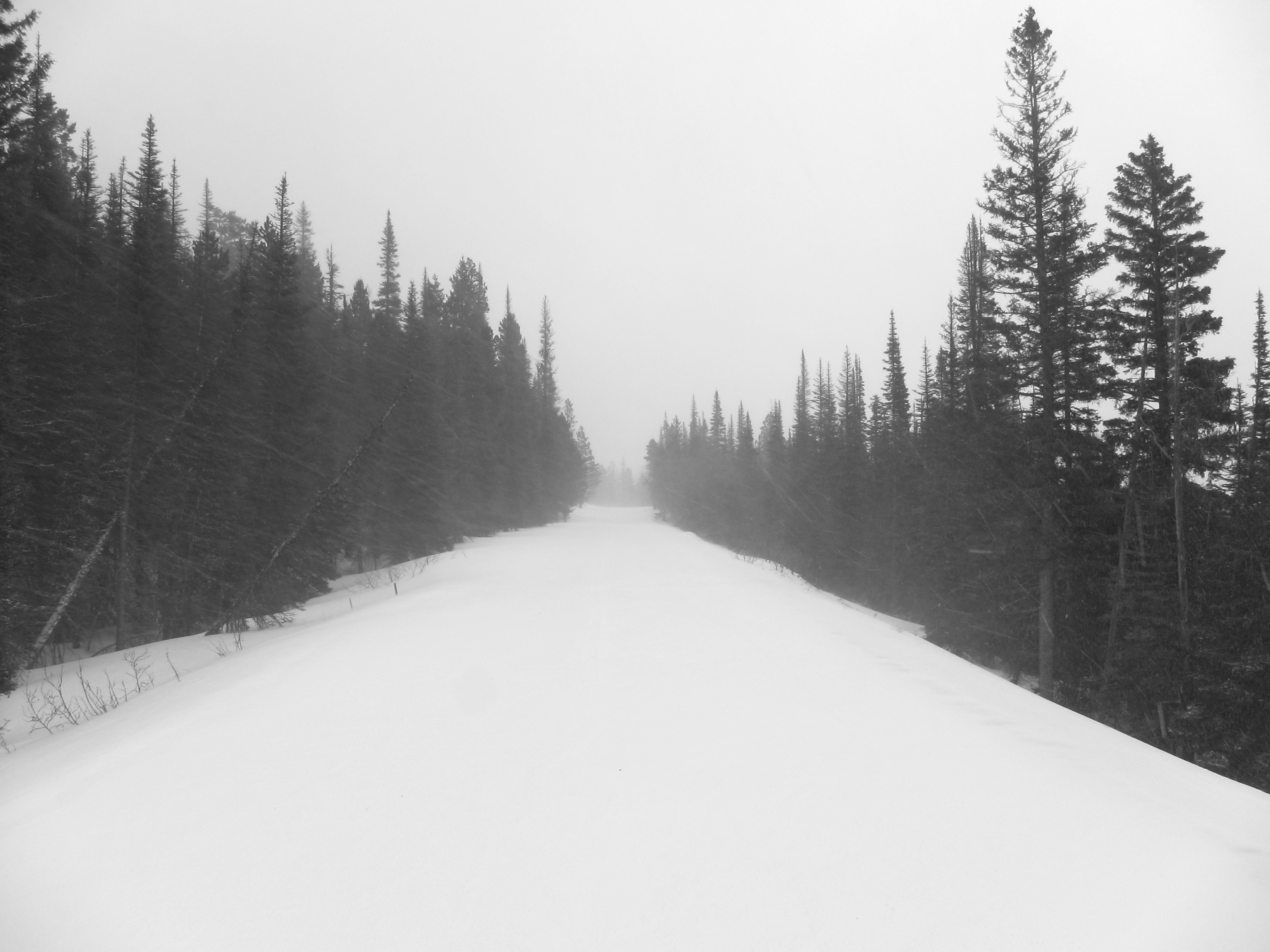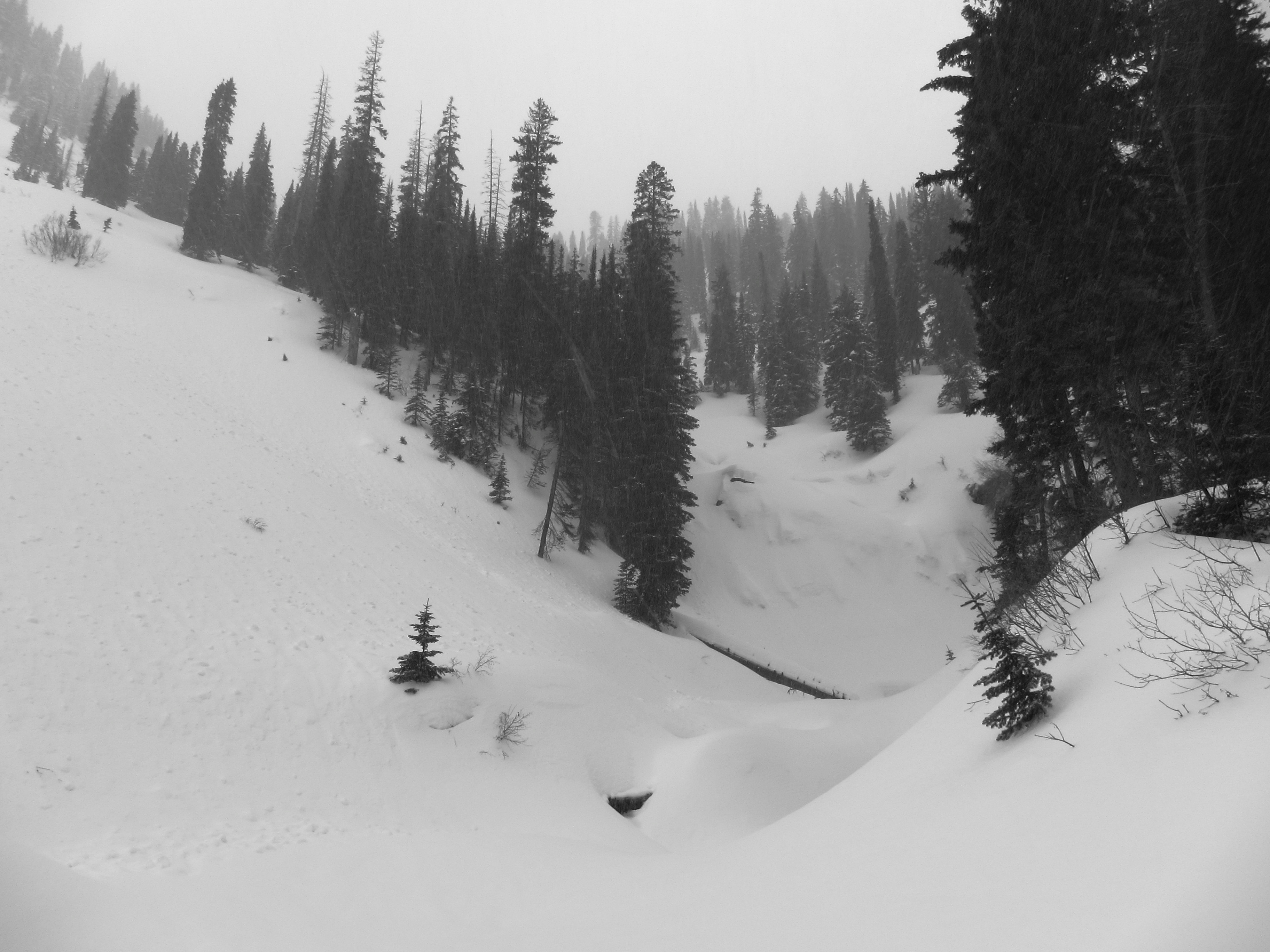 The world started to go dark by mid-morning. Temperatures dropped 10 degrees F between 7 and 9am, the snow picked up, and the wind rose until it was steady at 30 mph. Putting on skins to get up a sub-alpine lake seemed a bit pointless if I couldn’t see anything, and avalanche exposure was a relevant question. I puttered around the woods, the skiing ever better as the swampy, waterlogged garbage under the surface froze solid. I selected a waterfall as my final destination, though it was so well covered in snow that it was invisible.