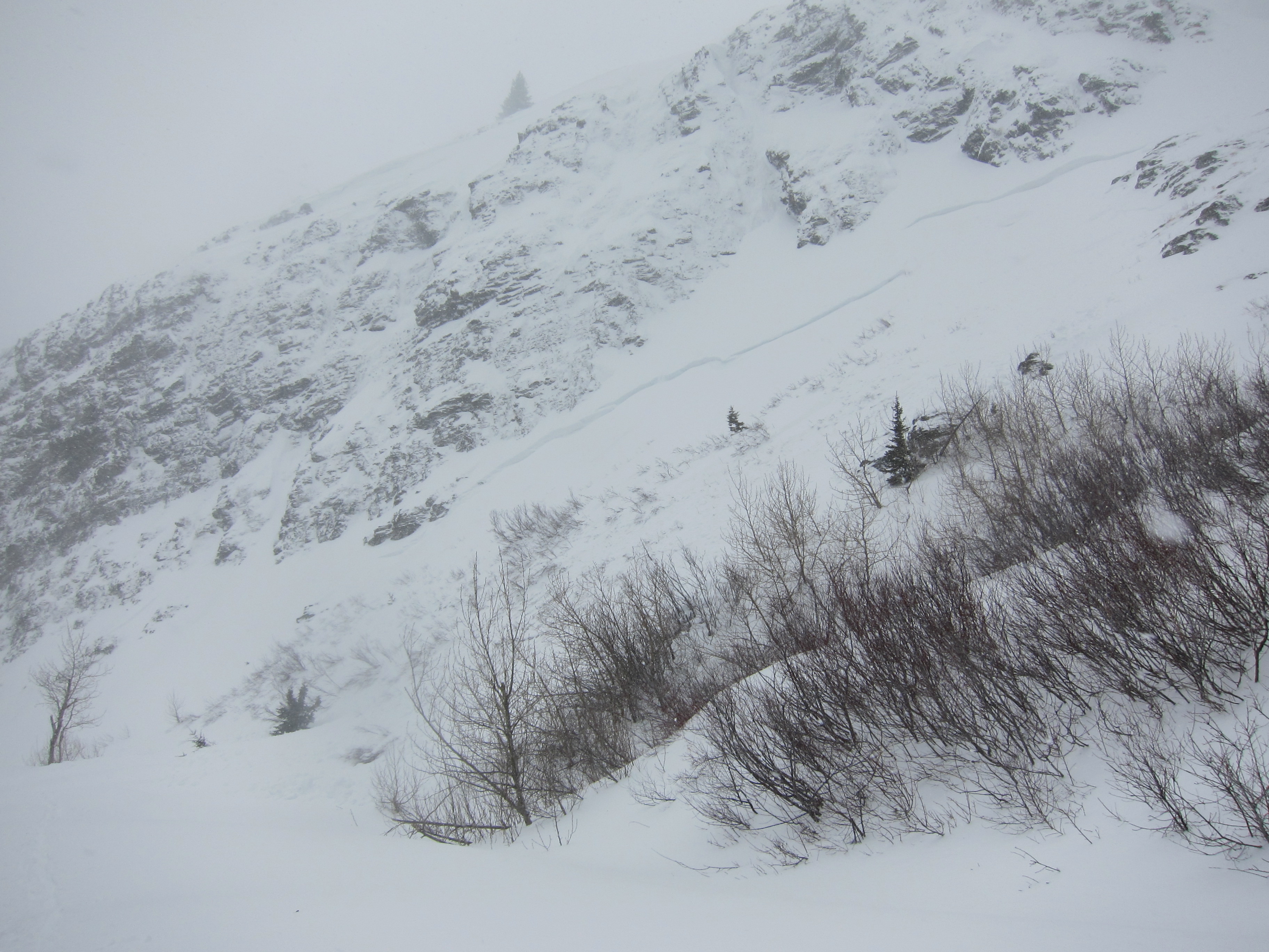 The wind relaxed slightly as I went further east, away from the heart of the alpine. Snow no longer tried to infiltrate my hood with so much insistence. When I reached the aforementioned avy zone, I saw that it had indeed slid in the last 24 hours. Colder temps made me less nervous about a repeat offense, and I didn’t have to ski across the debris themselves, but I still went quickly through to the other side.