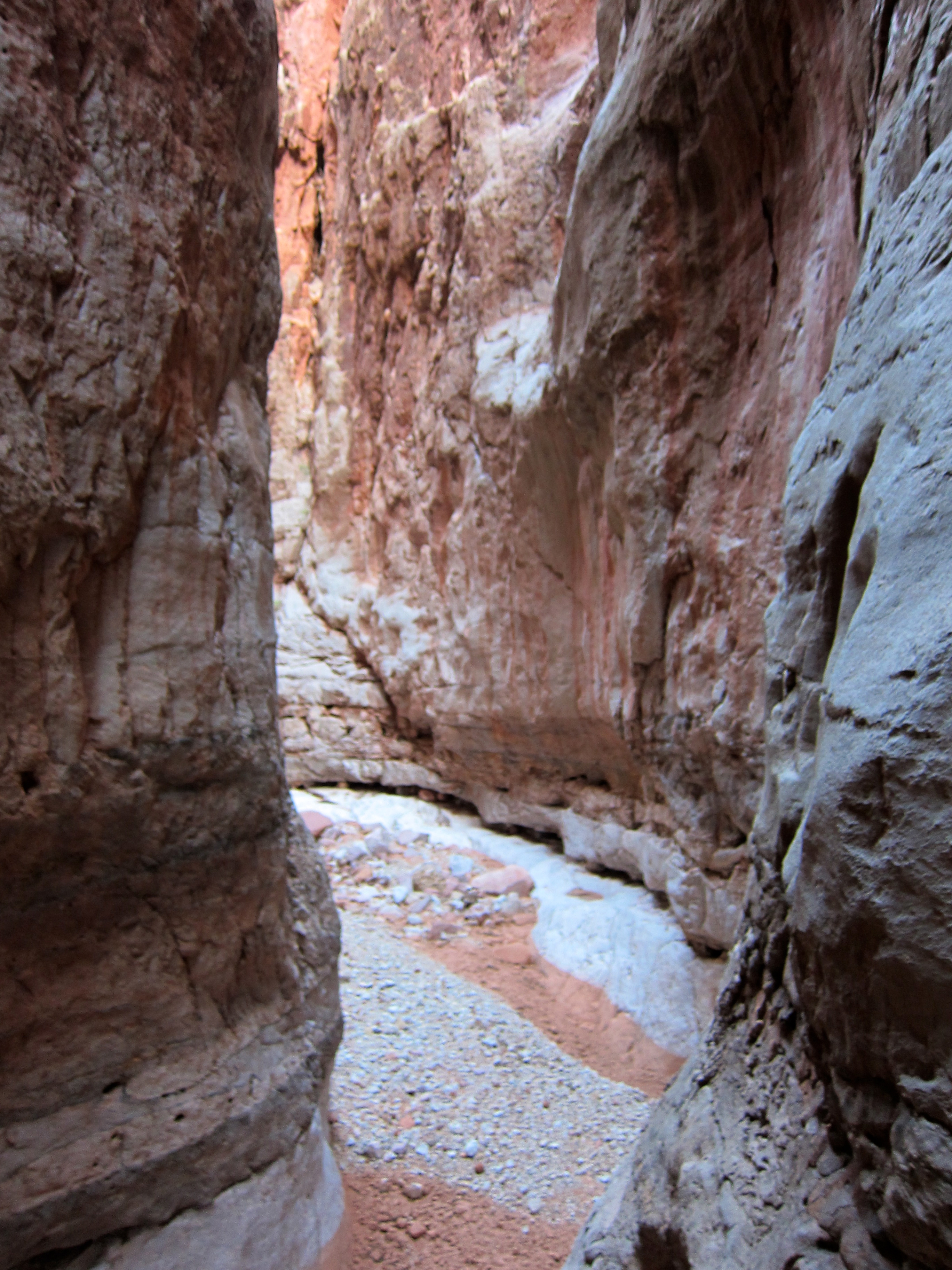 The going was even tougher the next morning. The middle reaches of lower Kanab feature a few WTF sections, where office building sections of the walls have collapsed, creating mazes of house sized boulders through which the way is not obvious, and the only options strenuous. After three full-on days, we were feeling the accumulated effects, and it was quite obvious that fatigue was not going to abate. We were too deep in debt, and the remaining terrain too likely to remain unforgiving. We would also have to do the toughest section twice, as our route had us ascending Kanab again to climb out Scotty’s Hollow in the final days.