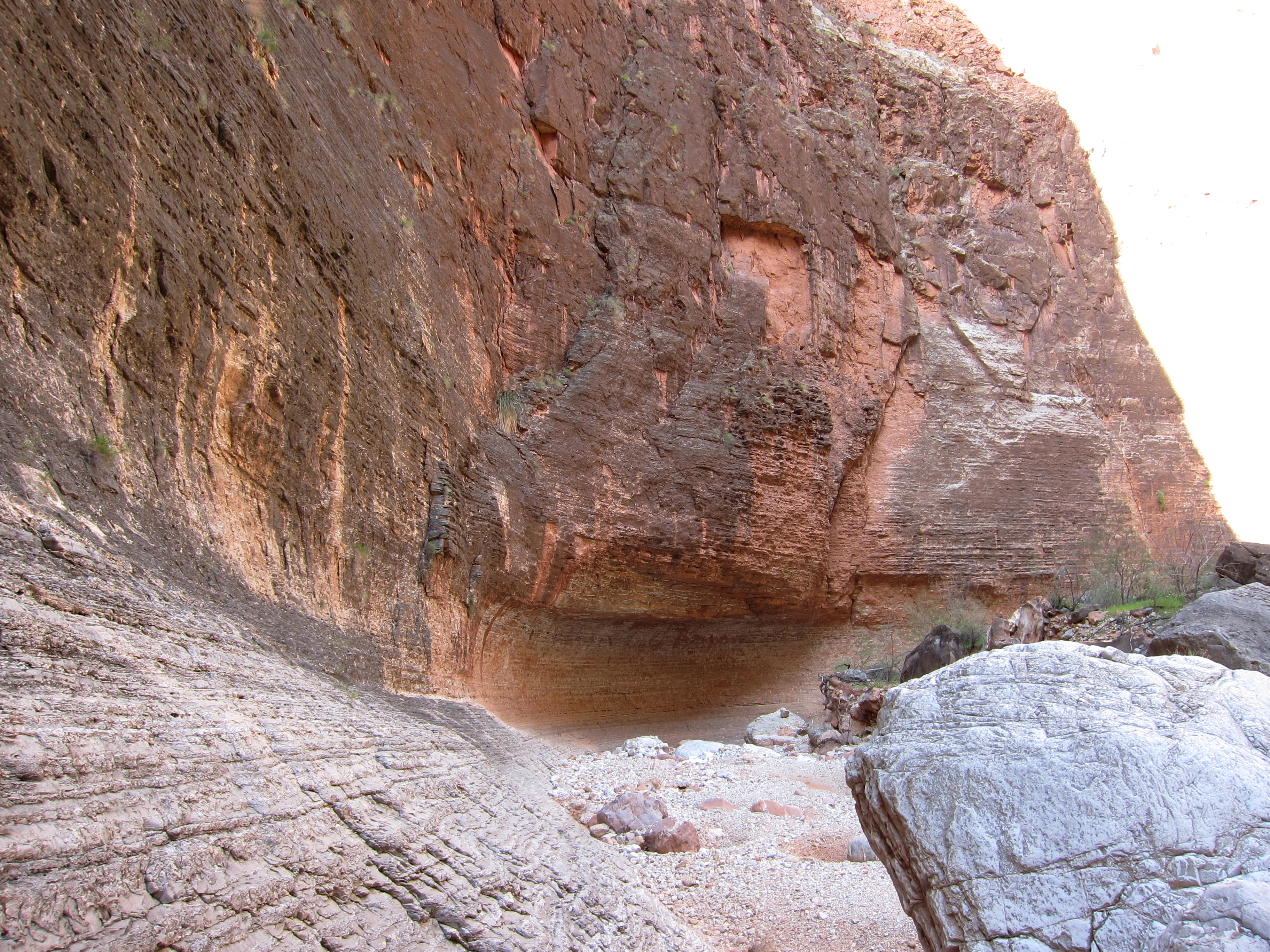 Waking in a narrow defile was a great way to start the day. As was the case every morning of the trip, it took a little encouragement to stand up and get the legs and feet functioning normally. We immediately rapped the short chockstone drop, did a few more downclimbs, and popped out of the Redwall slot into a more open wash.
