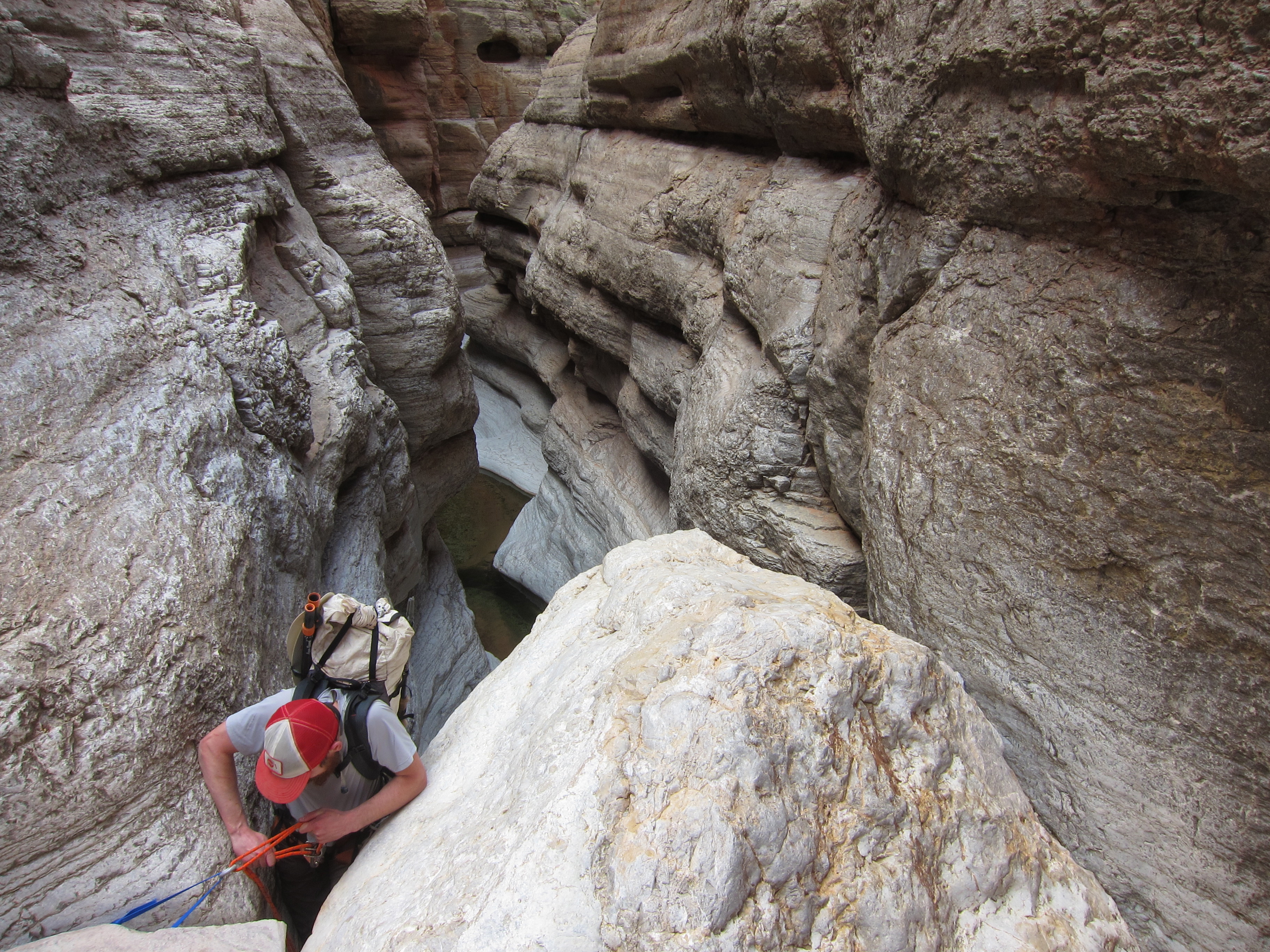 A rafters route up some sketchy-looking rock accesses the hanging bowl below this rappel, but the narrows above can only be gained by a very long walk; something which should serve to keep Olo’s aura mostly intact.