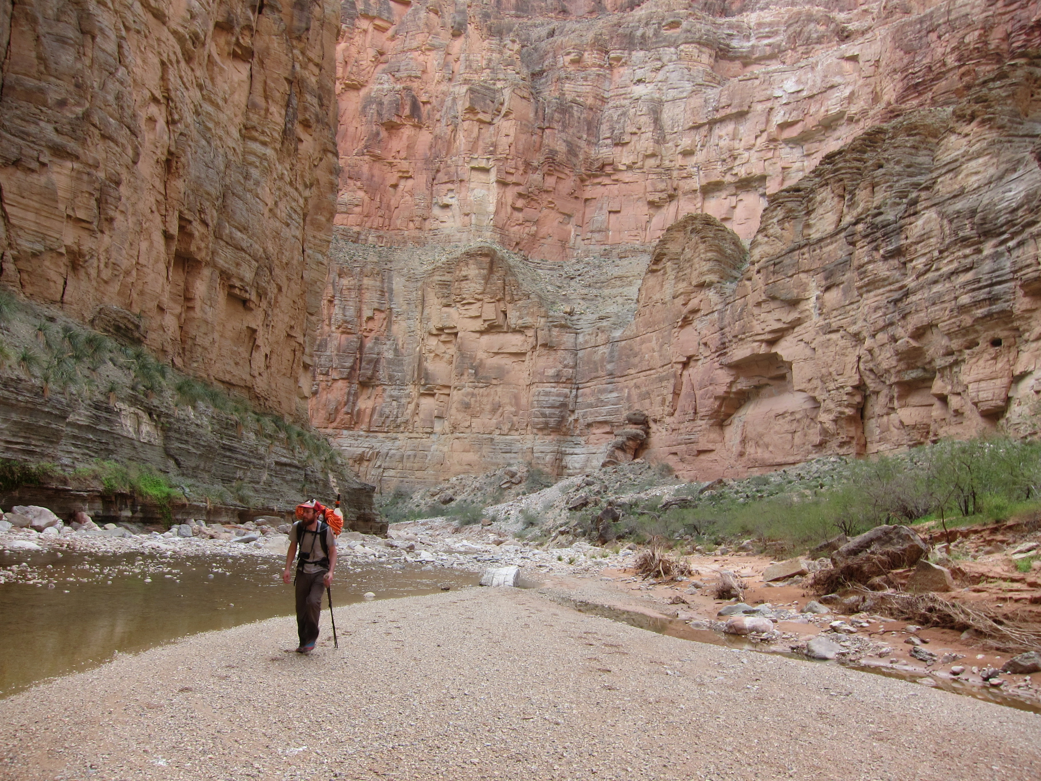 The lower few miles have enough established gravel bars to provide pretty fast walking, but soon enough things get more serious, and the going slow. With too many boulders, it’s hard to find a line which maintains a rhythm. We just kept going until it got late enough to stop, then collapsed on the first convenient flat bench.