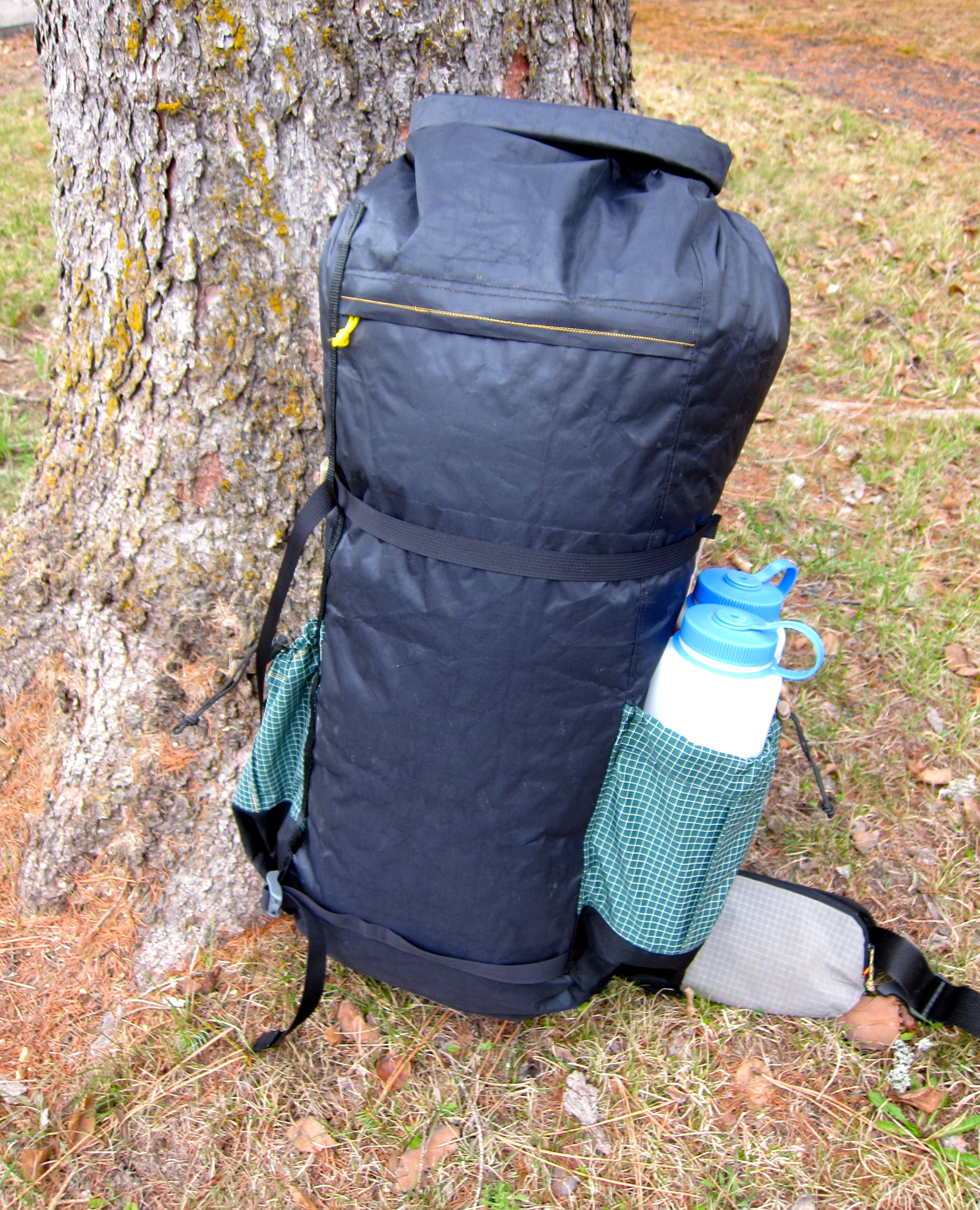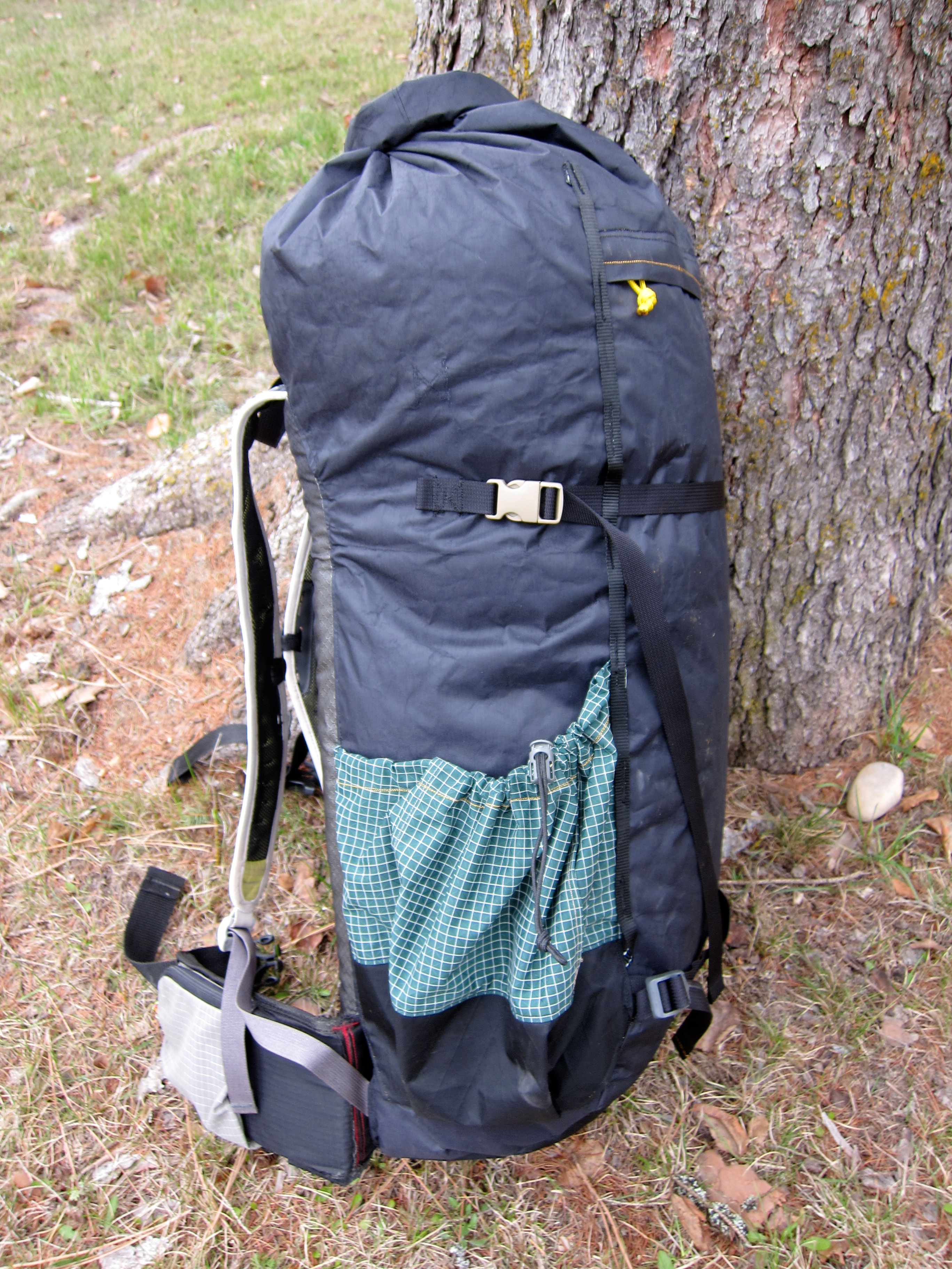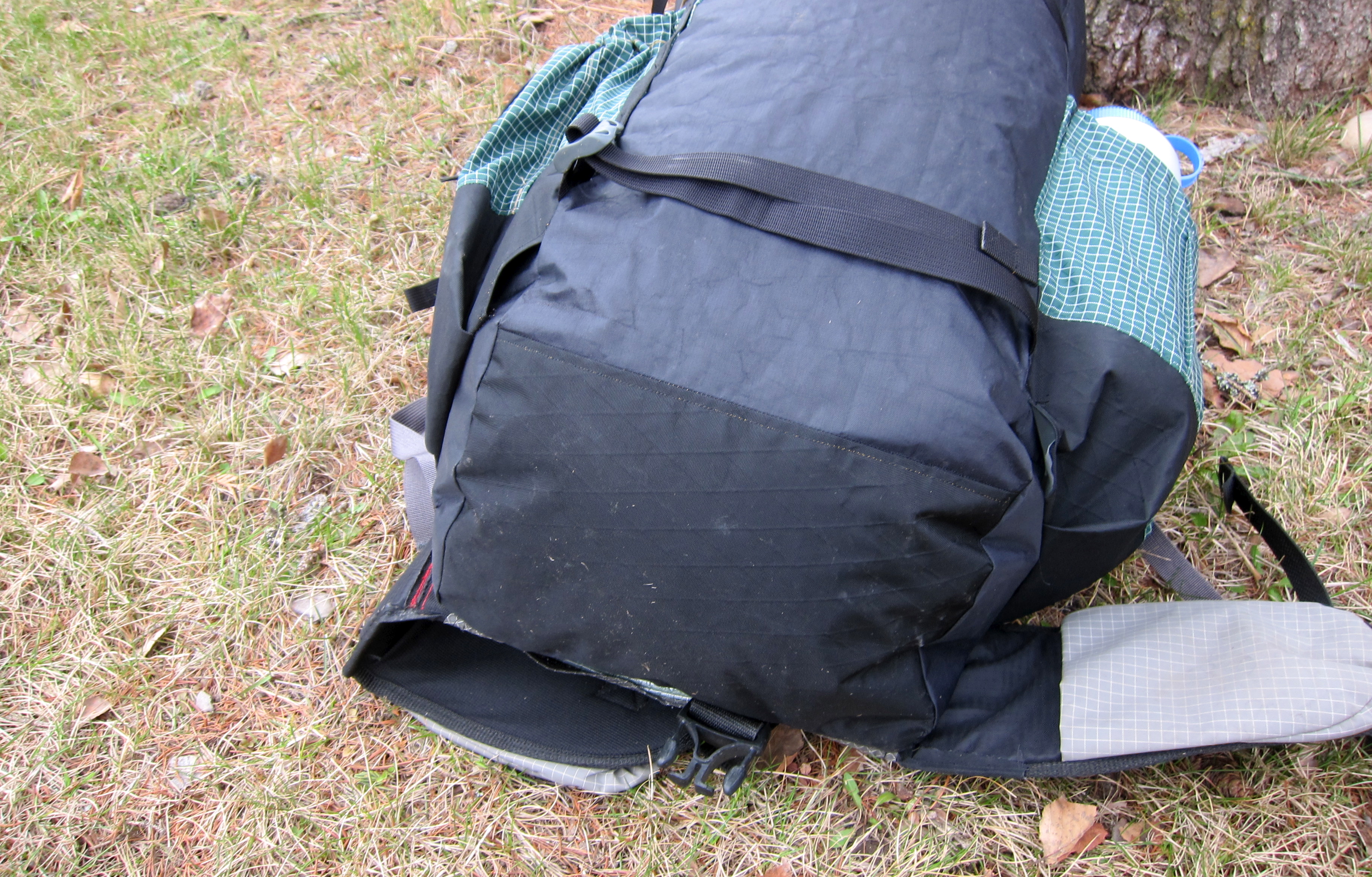 The bottom and bottom of the pockets are VX42. I also used a double layer patch of VX42 inside the bag as reinforcements where I attached the upper compression strap. The outer layer of the pad sleeve, and the very top of the rolltop, are 300D diamond ripstop from Rockywoods. I hoped it would be a lower-cost alternative to Thru Hikers 210D gripstop, but it is not as tough, and has a shiny sheen I do not like. Not a bad fabric, but not great. The upper part of the side pockets is said gripstop; everything else is hybrid cuben. Which was very easy to work with, by the way. I felled most seams, and will add some seam sealant to the bottom seams for durability. I’m interested to see how it holds up.