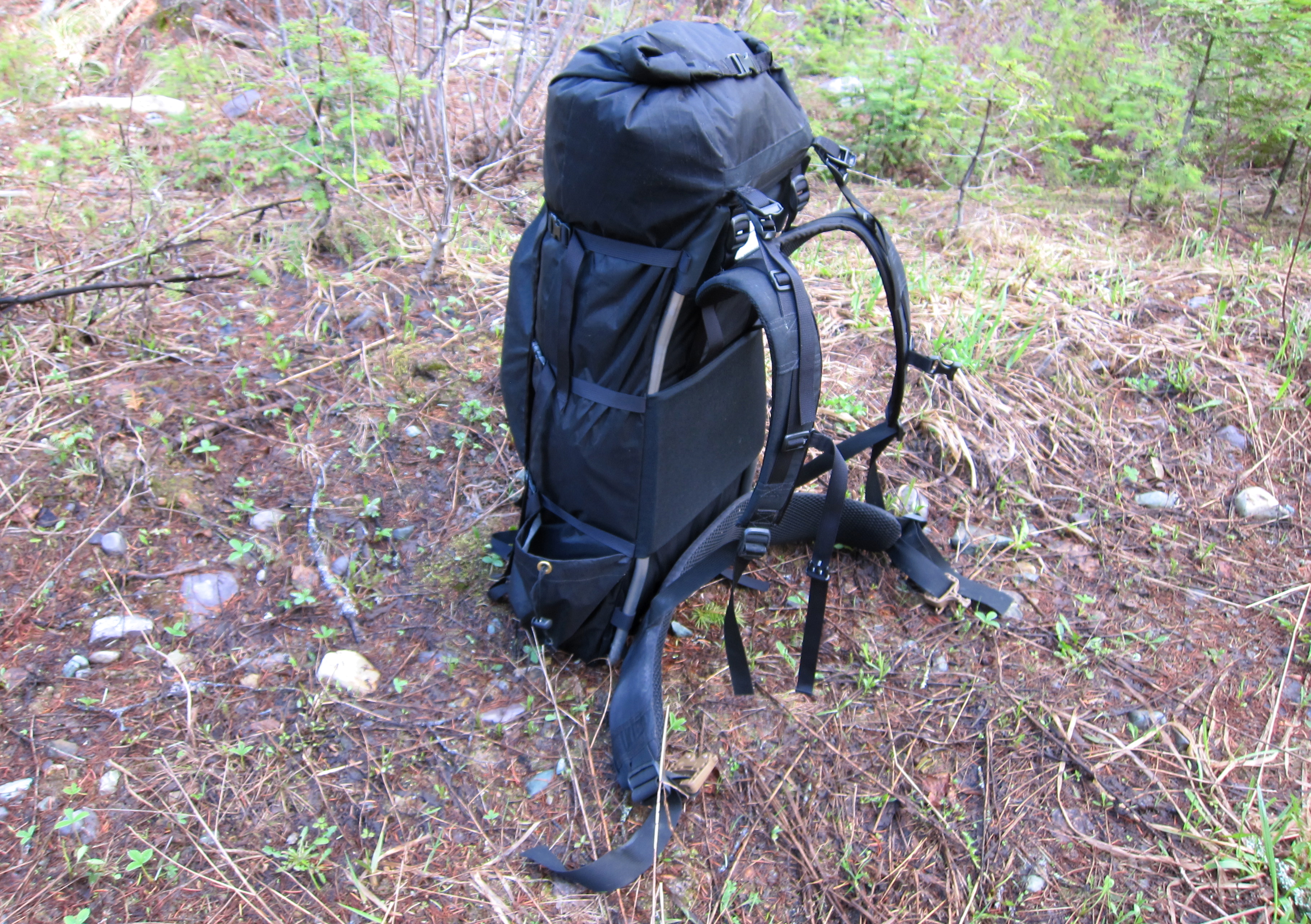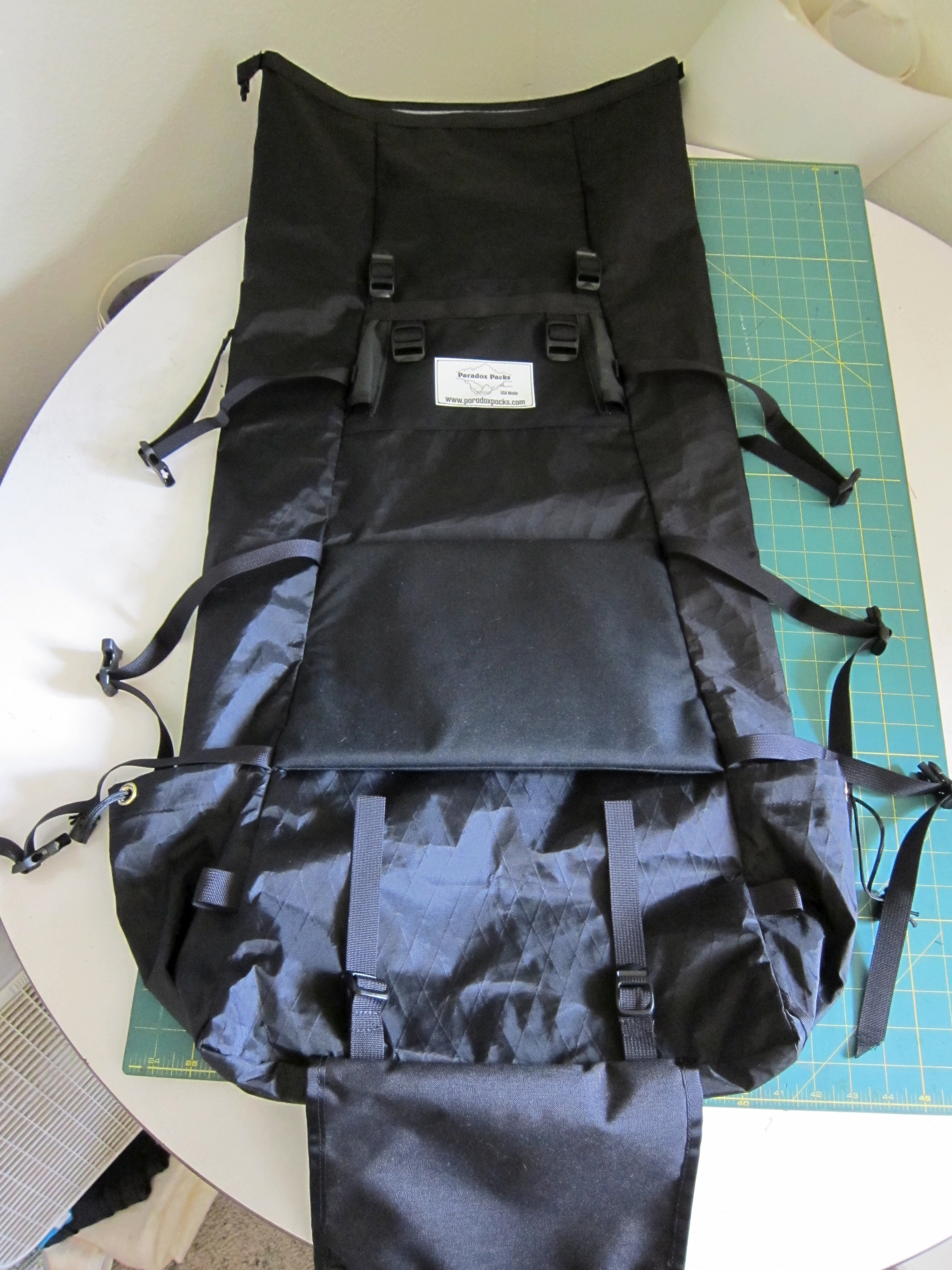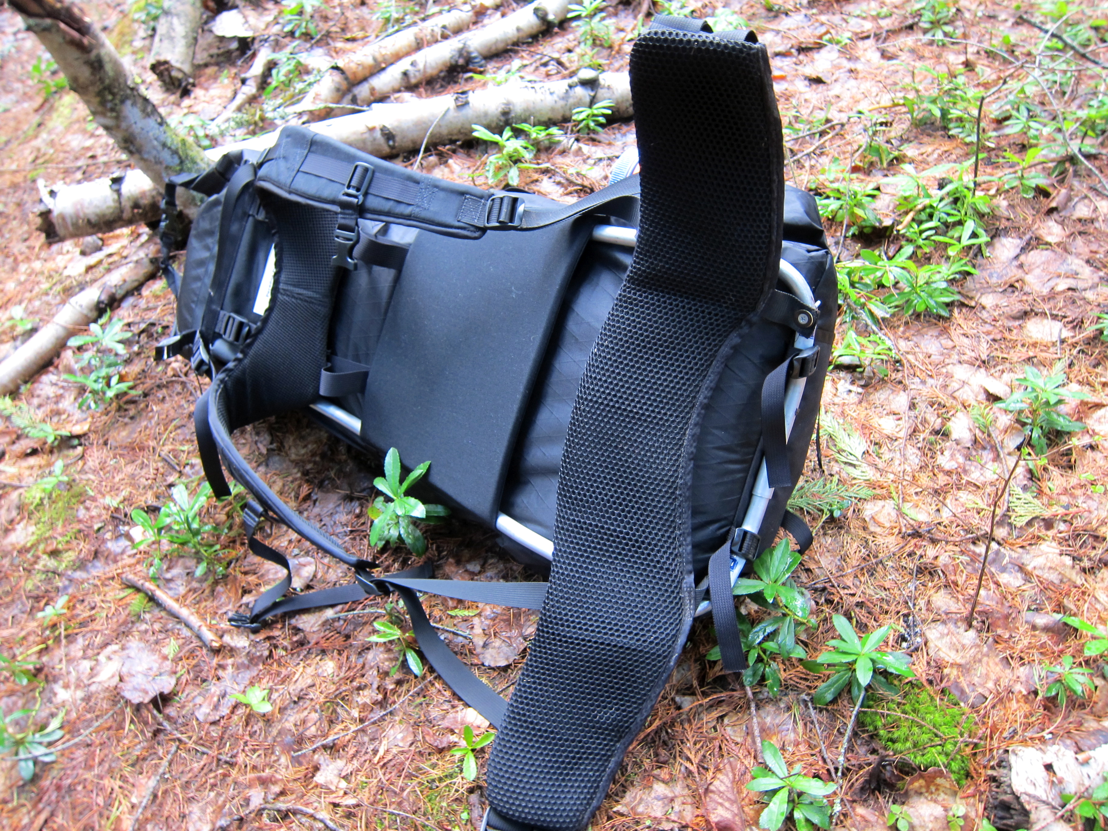 This is the 3900 size Paradox Unaweep, done entirely in VX-42 because I like to break things. The frame threads through the webbing loops low in each side seam, behind the padded bit in the middle, and into the hypalon slots near the top.