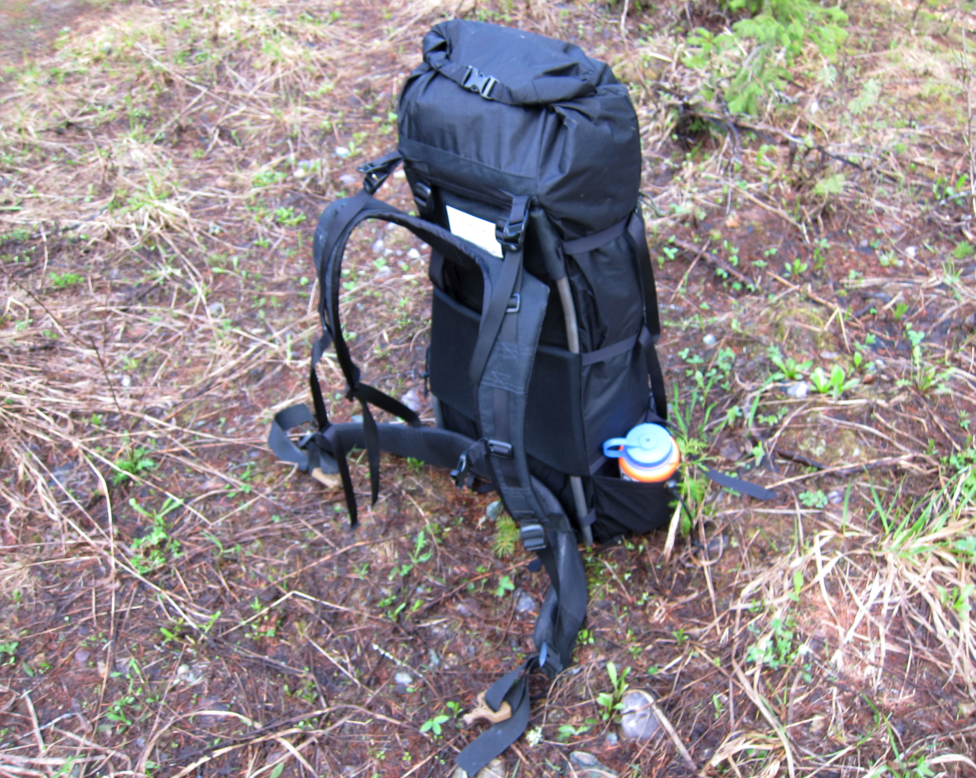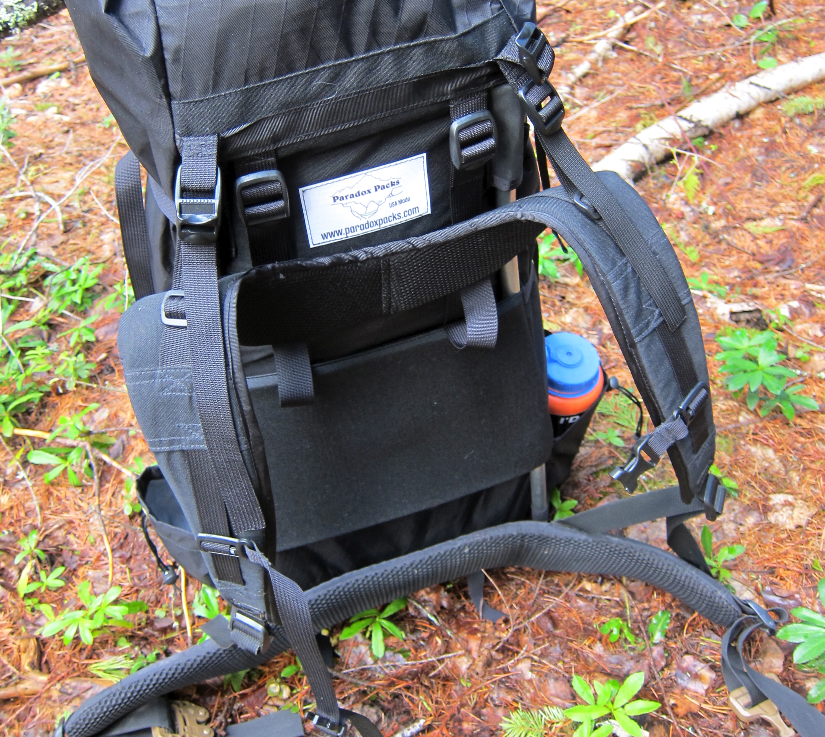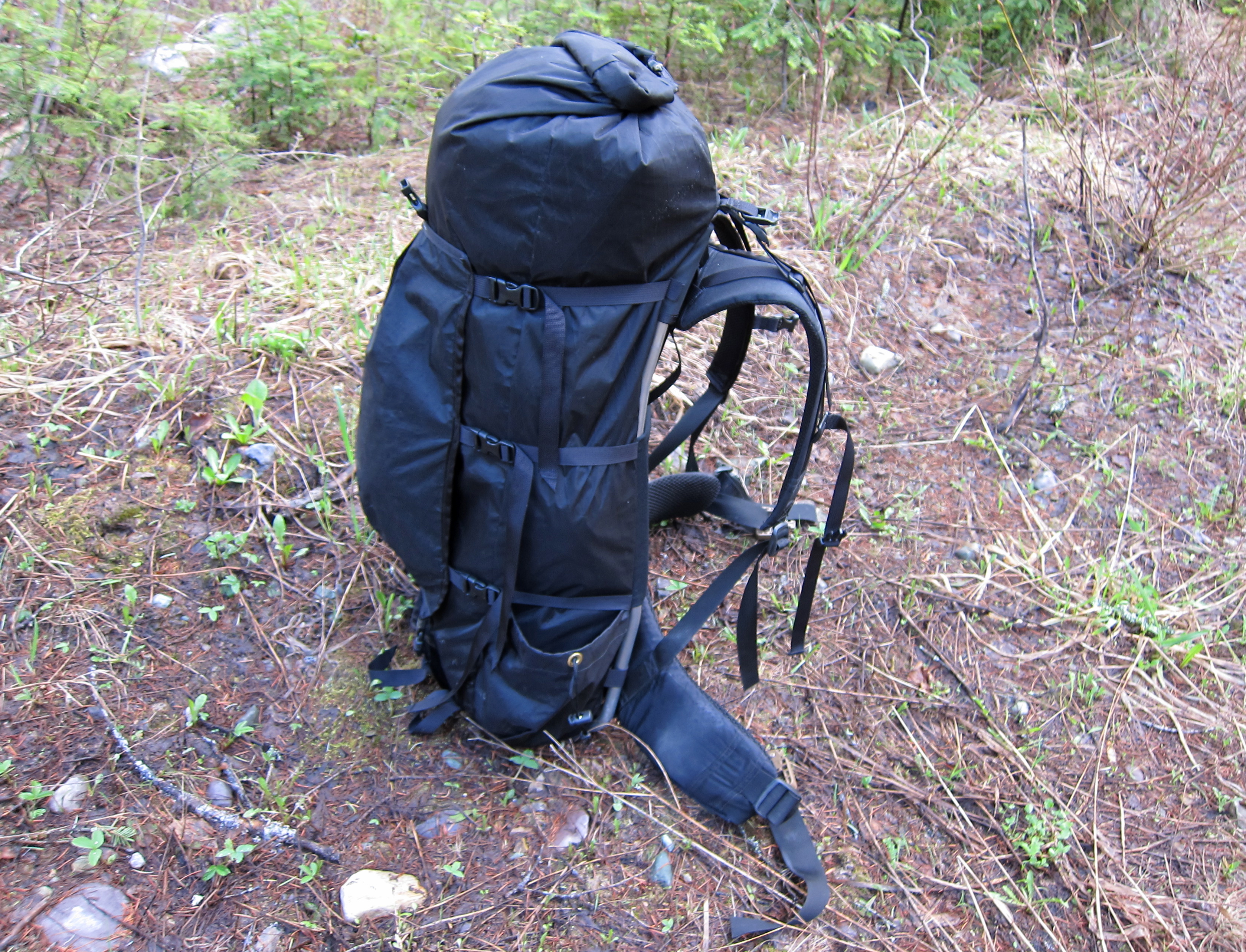 This is the 3900 size Paradox Unaweep, done entirely in VX-42 because I like to break things. The frame threads through the webbing loops low in each side seam, behind the padded bit in the middle, and into the hypalon slots near the top.