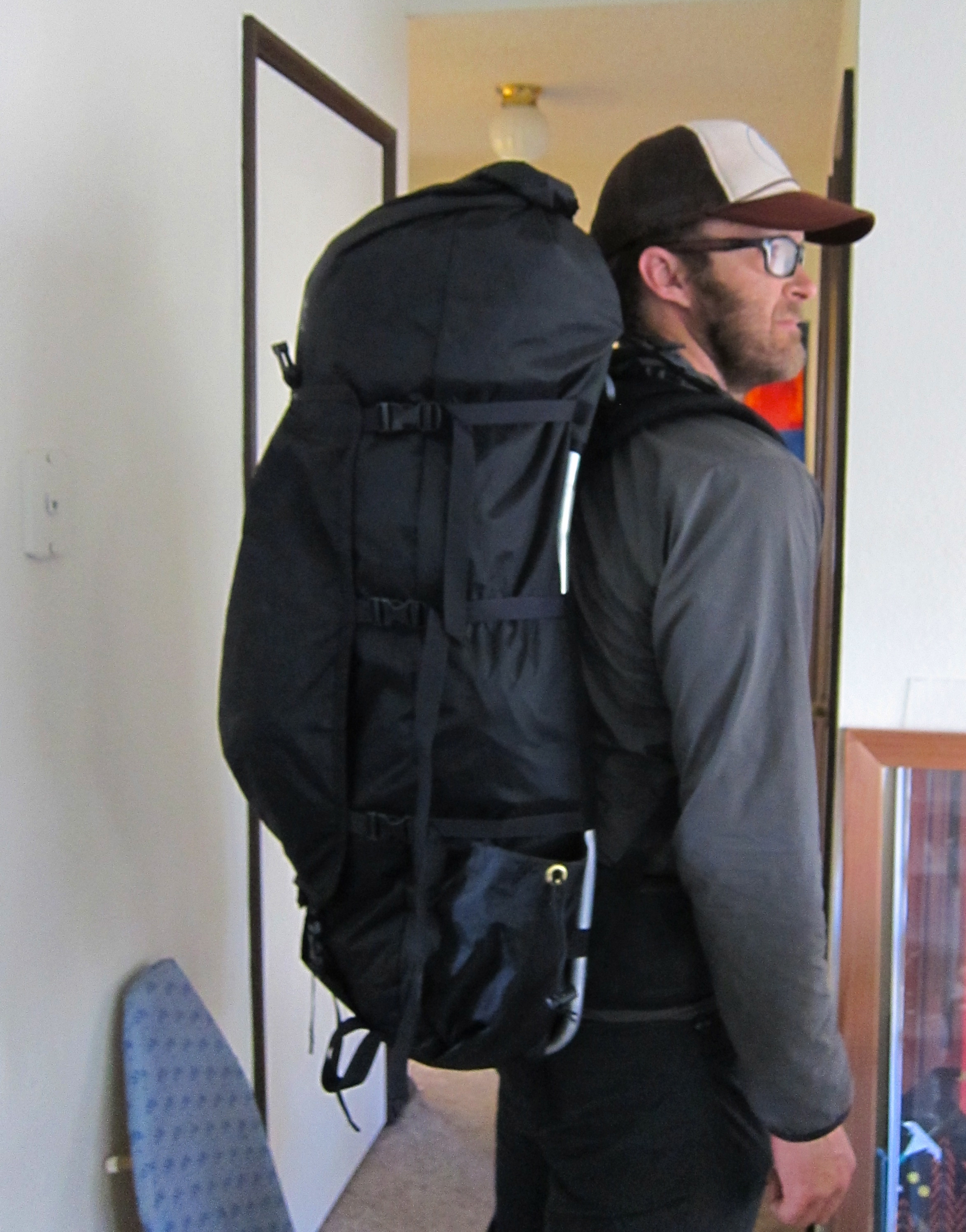 The Paradox frame is 14 inches wide at the base, narrowing to about 8 at the top. The back panel follows this taper, while the front panel remains the same width, and the side panels get wider towards the top. The result is that the bag is wide and narrow at the bottom, and gets deeper and more cylindrical as the shoulder and above. The way this bag shape tends to distribute weight is awesome. Overall, I could not be more excited about this pack. It’s a hair smaller than the similar bag I built for my Grand Canyon trip back in March, but in a fabric and with a slightly altered feature set which makes it more suitable for year-round use up here in Montana.