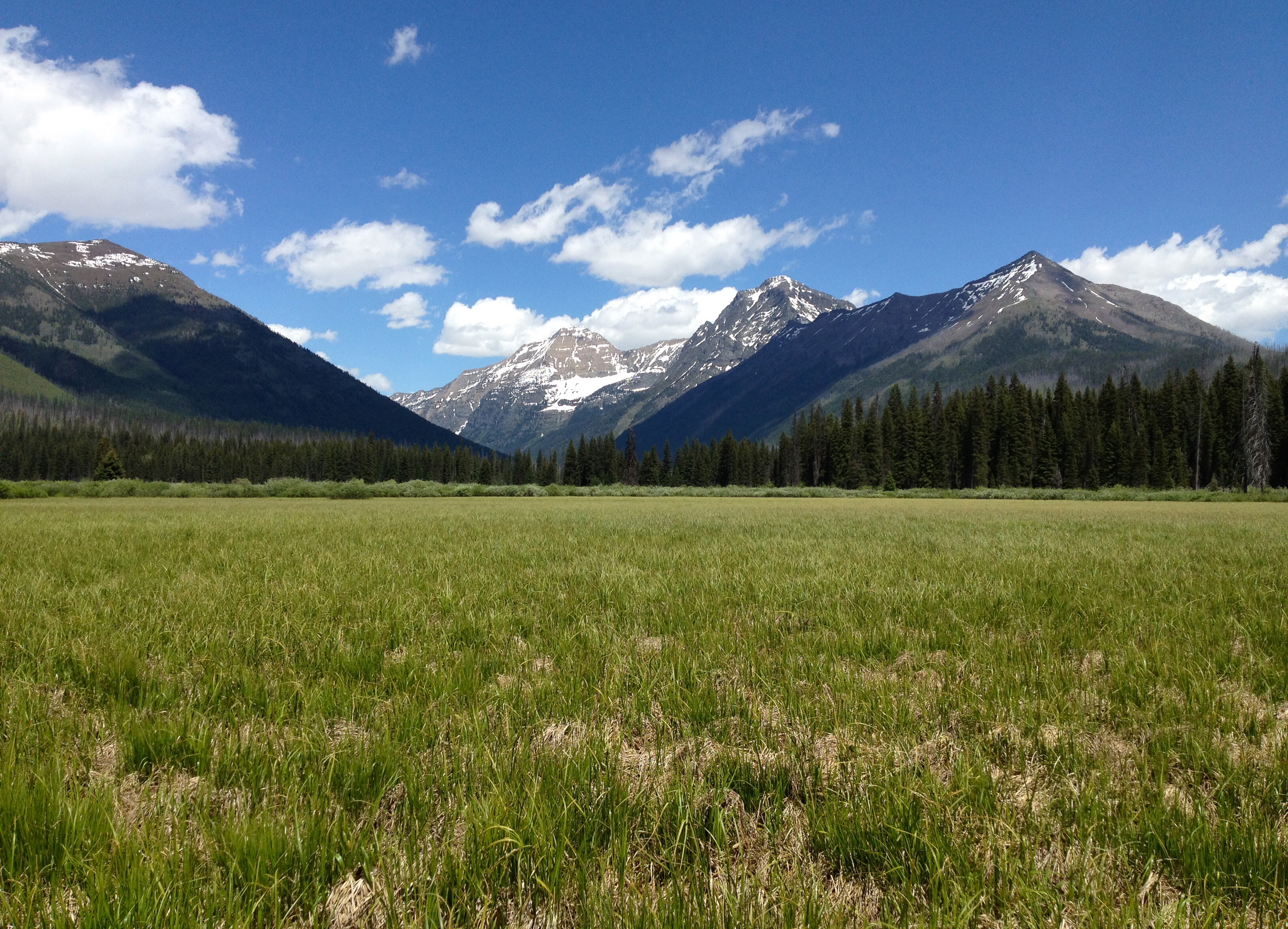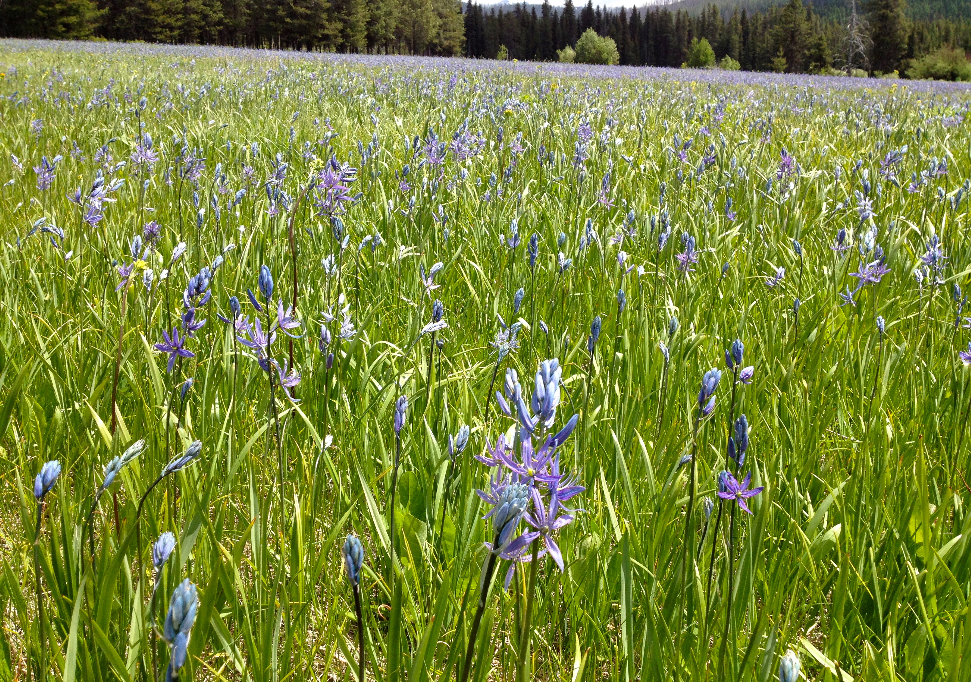 The past two weekends have been the most fatiguing consecutive ones in memory, so for most of this one I contented myself with sleeping in, working on an article, and reading a 700 page biography of FDR. But summer is here, and the call was too much to resist. A fairly harsh winter and a long, cool spring have given us what promises to be an exceptionally luscious summer. The Camas along the creek of the same name was running riot, I saw many sleek and happy deer, broods of Canada Goslings, and bear tracks. Further up Camas Creek is the lake where one of the two Night of the Grizzlies attacks took place half a century ago, and every biologist I’ve spoke to about the subject confirms that this exceptionally wet and brushy drainage has a correspondingly exceptionally large number of bears. I saw at distinguishable tracks from at least five different bears in mud patches during the first few miles, and all of those tracks were no older than 48 hours. Humans don’t walk this trail often, as a burly creek crossing further up makes a loop or point to point difficult until later in the year. As a result the winter’s deadfall had not been cleared, and only bears had made trails around the larger snags. In a few spots the pigeon-toed postholed they had left through the grass could not have been more obvious.