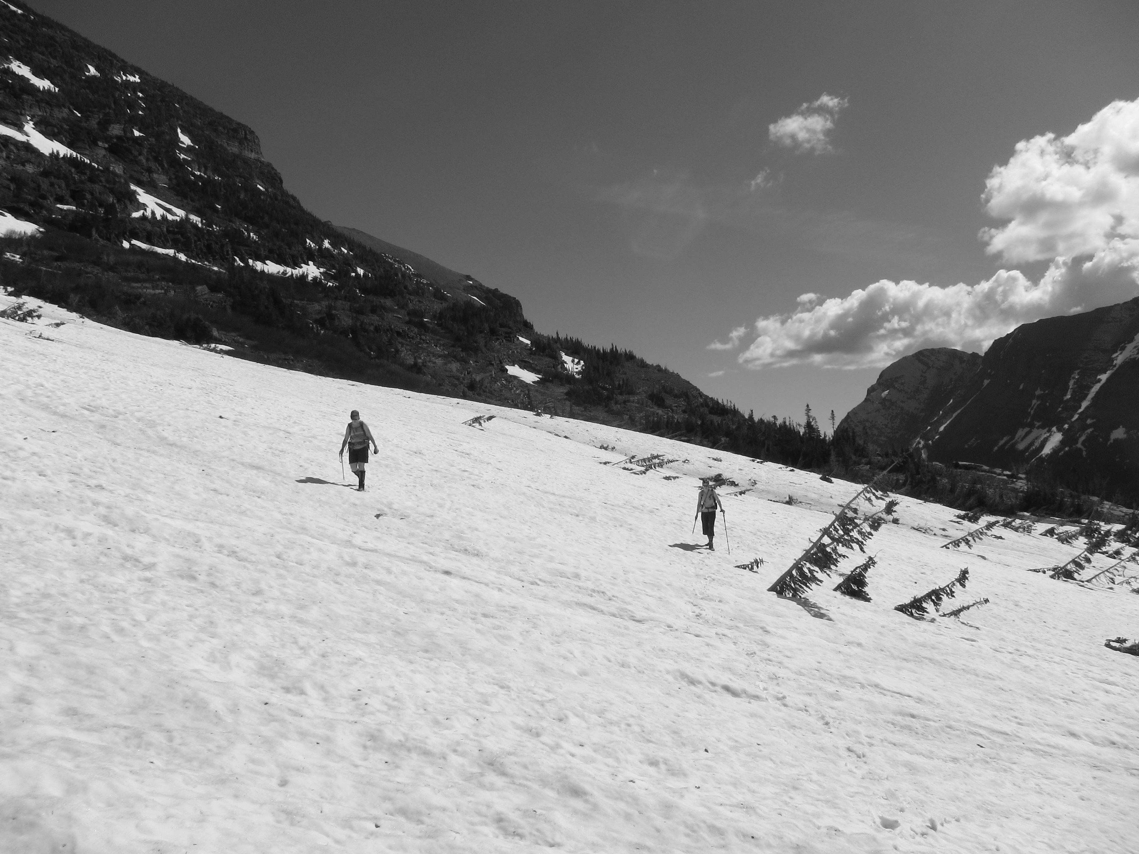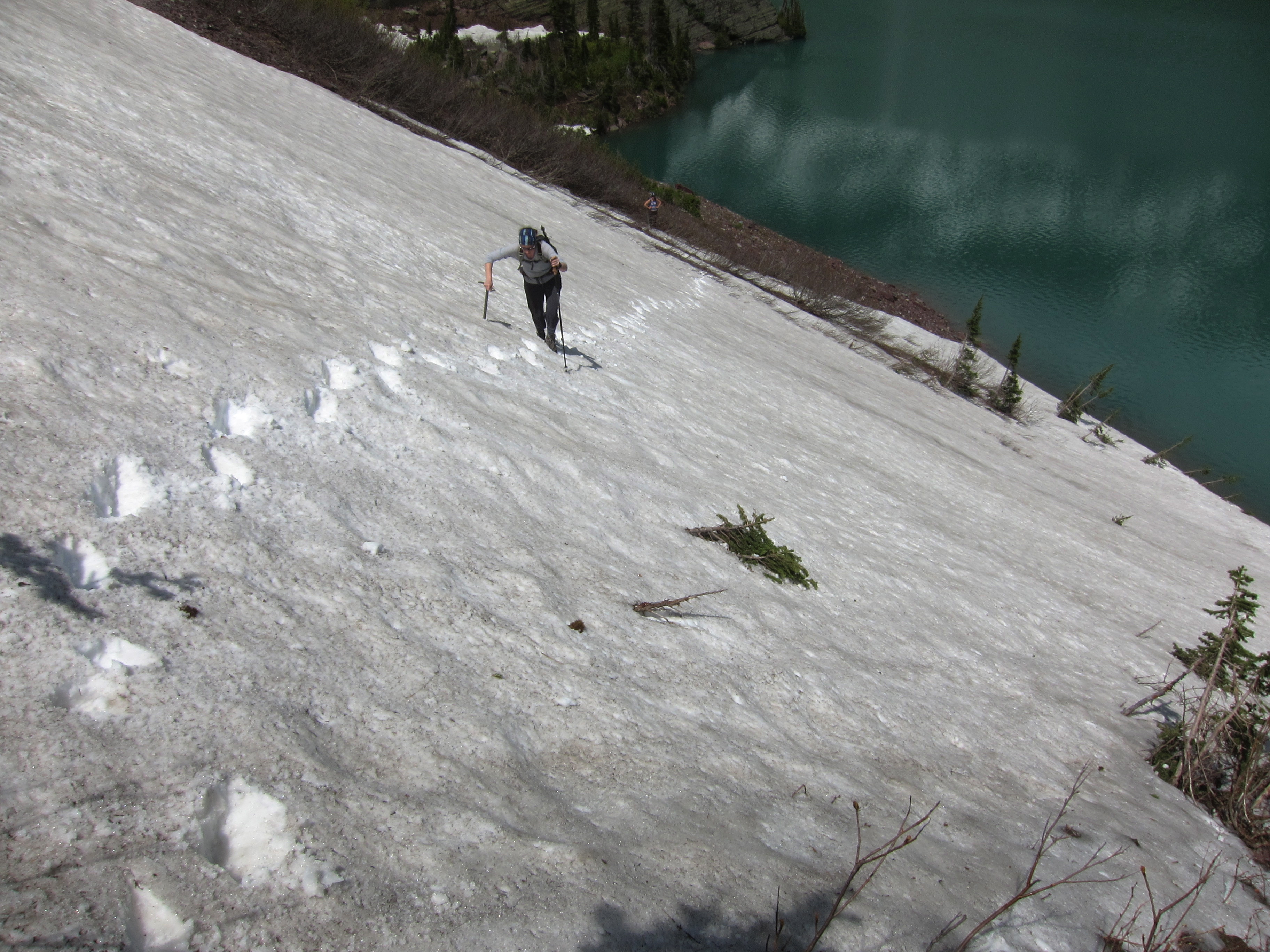 Plan B turned to Plan C when still more snow sent us down and around the first lake, rather than up through the cliffs to the second lake.