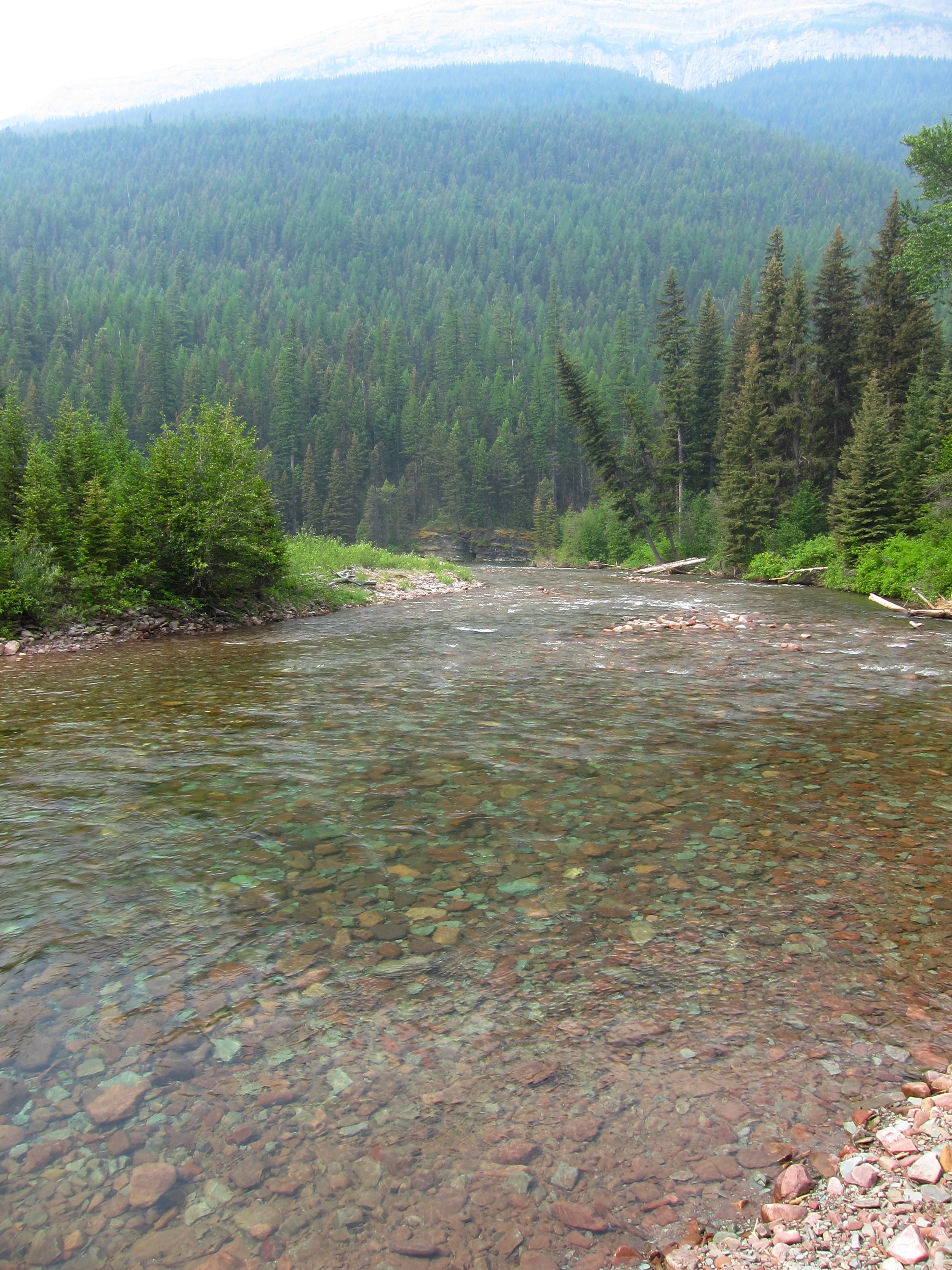 Chatting with the guys at RMO the other day I repeated for the upteenth time, to myself and others, that one of the greatest virtues of packrafting in these parts is getting you out of the forested-in trails along valley bottoms and out in the middle of streams and lakes, where you can see things better. A lot of the most multifaceted, spectacular valleys in the Glacier/Bob complex, like the Waterton and Middle Mokowanis, are only visible occasionally from the trail. In a boat you can see things well and constantly, at least when looking around won’t immediately get you stuck on a rock.