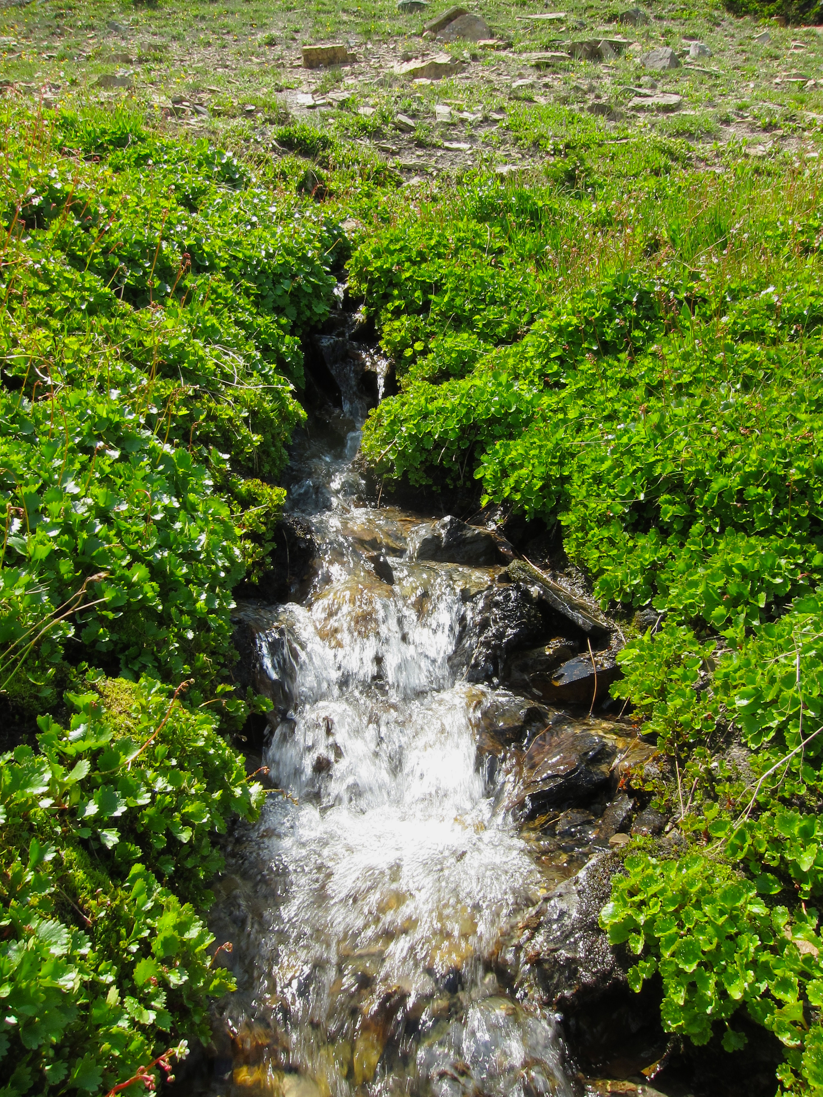A vestigal terminal moraine collects snowmelt and directs it under the talus and dirt. It re-emerges as a series of springs 200 meters downhill.
