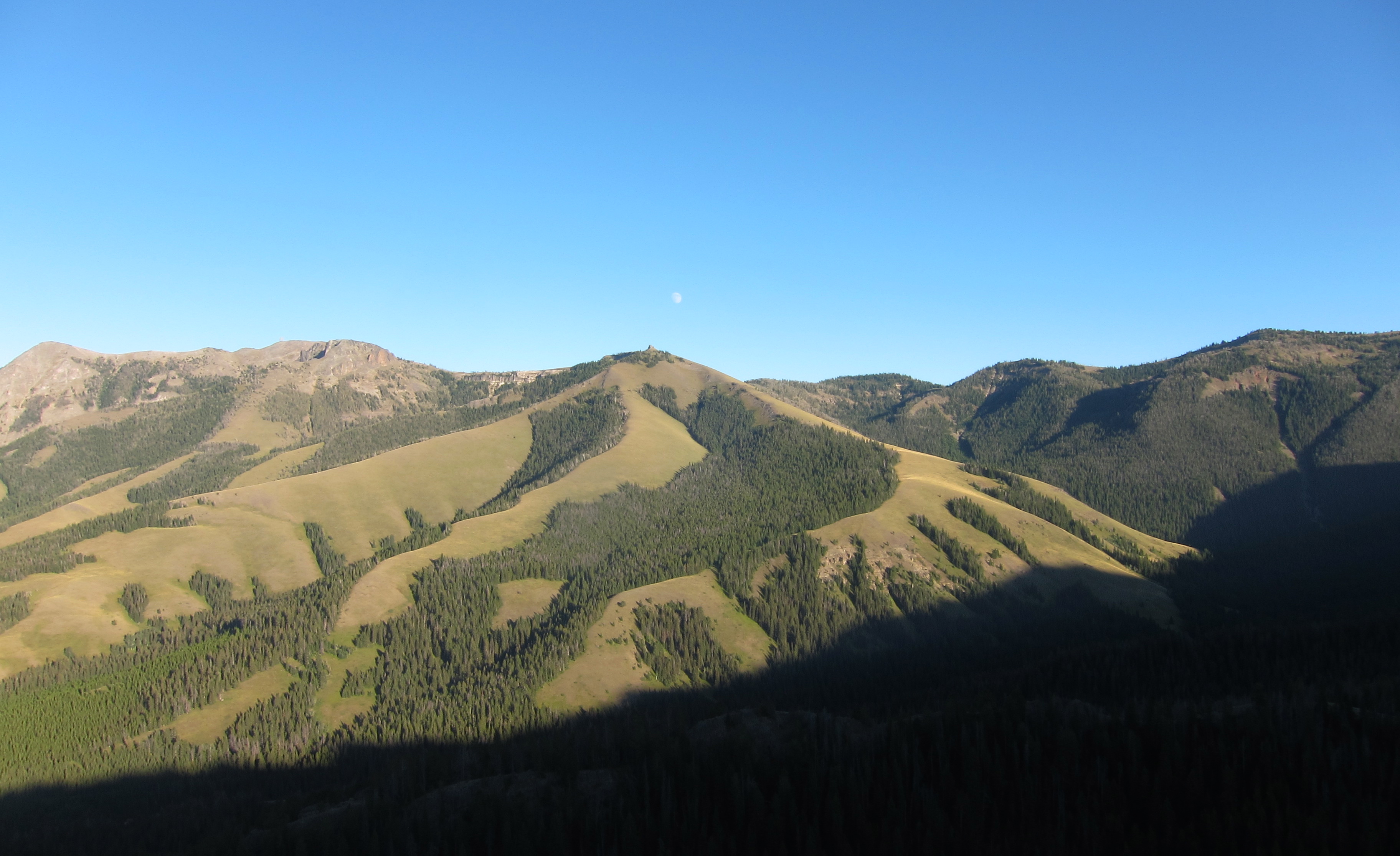 Soon enough, a clatter in the trees below; hooves on talus. Sheep! The trail I had been hiking was the border between the national forest and Yellowstone, and the sheep were on the park side, but animals are always exciting. To be diplomatic I left my pack and rifle against a tree, and crept back down the trail before slowly edging into the woods where I could eyeball the herd I’d spooked. Over a dozen bighorns, mostly ewes, with a good crop of lambs, and one ram who was miles away from 3/4 curl. This was a relief, as I could just relax and watch the sheep feed away around the ridge. Going back up to trail, I could see by their tracks I’d gotten within 10 feet, just over the ridge, before they saw or heard me.