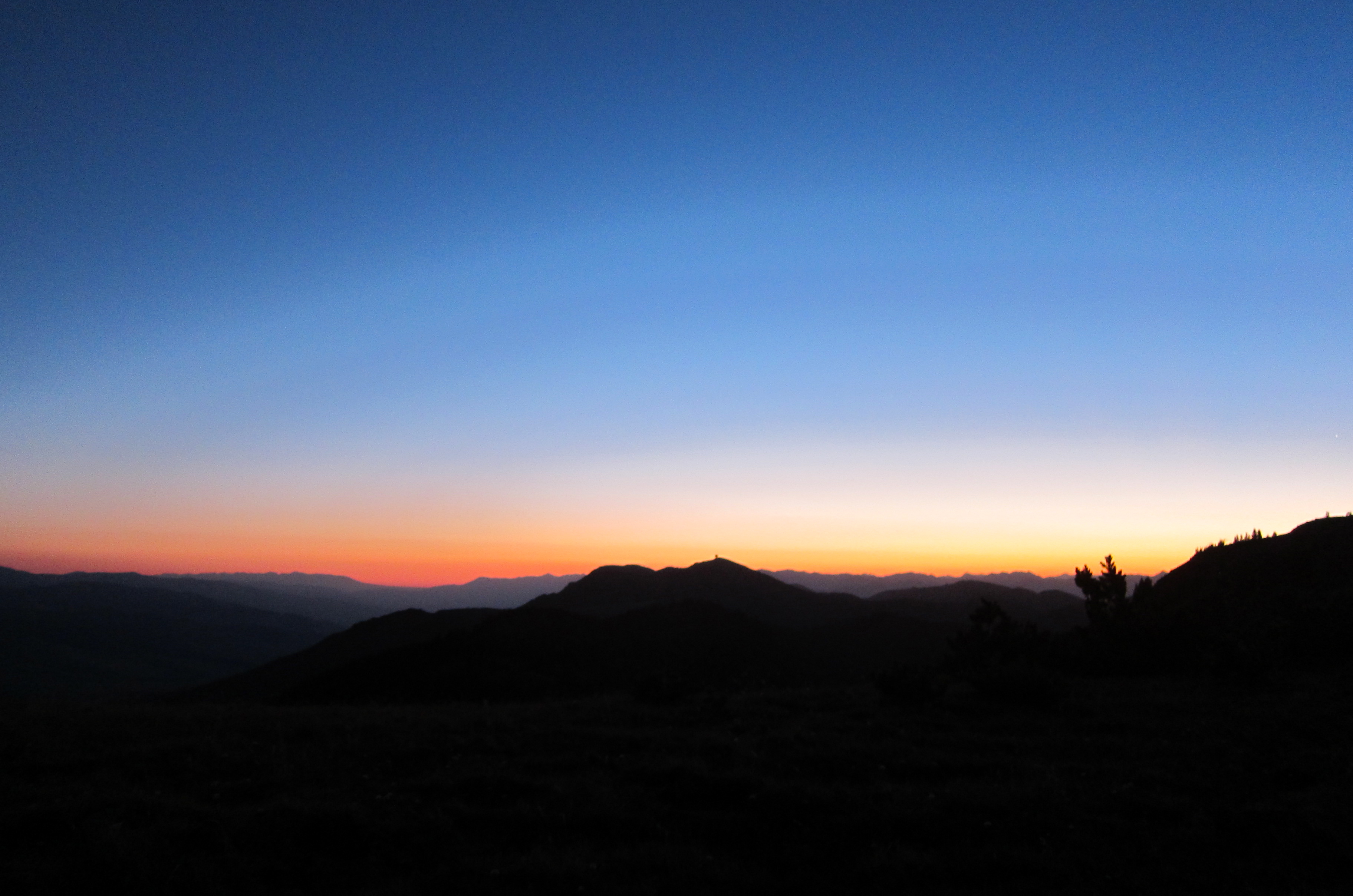 With limited water in my pack and none up on the ridge, I dropped down through thick timber in the dark and after much sidehilling on elk trails, made camp on the edge of a meadow, positioned to drop to the creek the next morning.