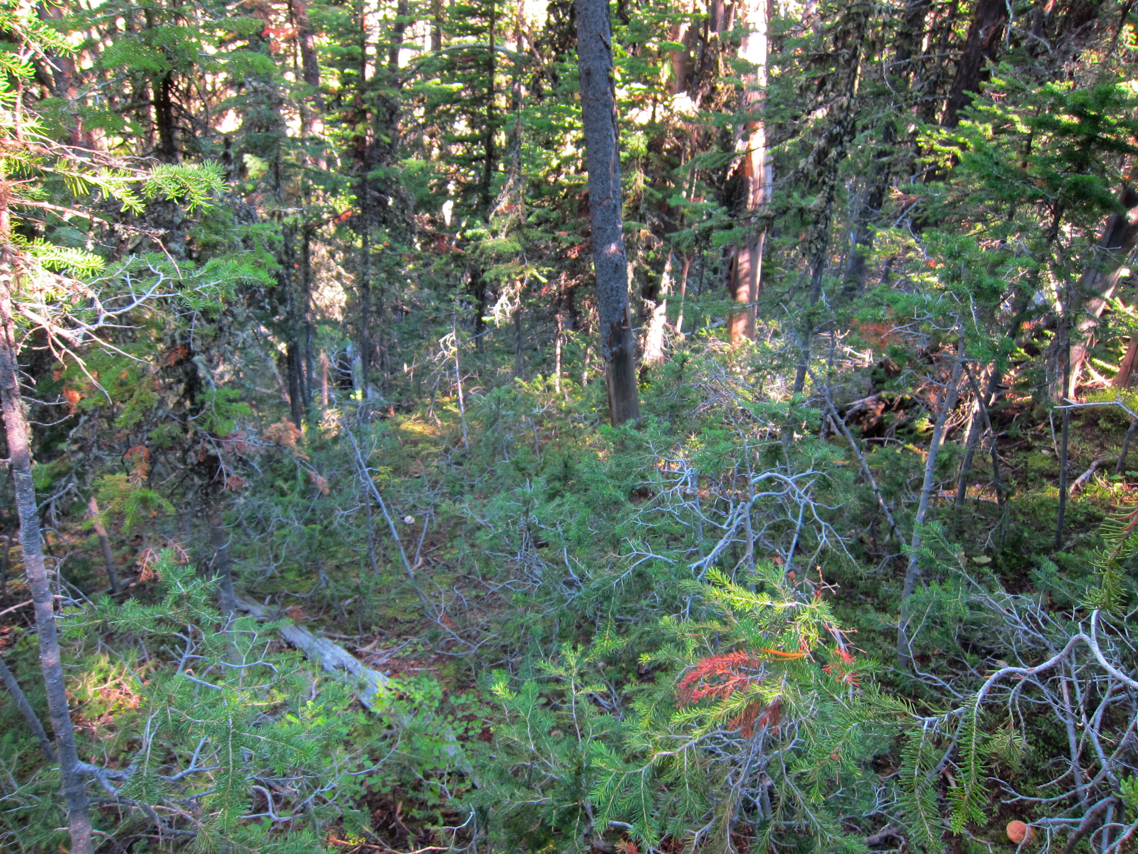 As I contemplated my strategy, wrapped up against the very cold wind, a mountain goat wandered across the nearby cliff, eventually bedding in the far right patch of vegetation. Right situation, wrong species, as the wind would have been good for stalking him from above. Instead, I decided to hike back past the goat on the ridge, and drop down the slope, contouring down to the valley floor on a path which would take me through as many high alpine tree groves and open patches as possible. The sheep I had seen yesterday had been in the trees, and much of what I had read about these areas emphasized that sheep lived in the forests, so down I went.