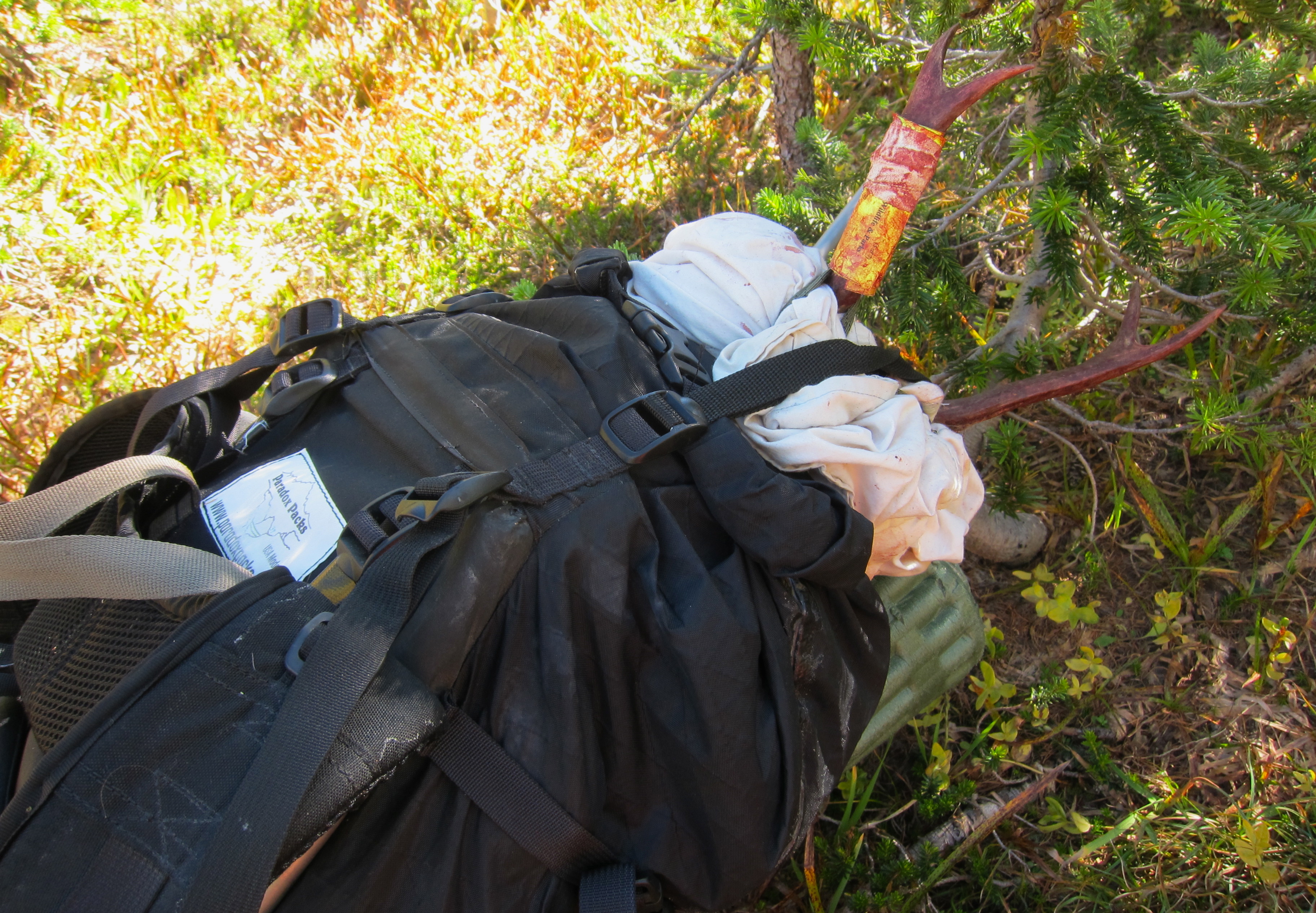 Camp gear and spare clothing, in drybags to keep it clean, goes in the bottom on the Unaweep. Snacks and everything else I’ll need and that can fit goes in the two pockets of the compression panel. The two thankfully quite cool but very heavy bags of meat, bones still in, go on top of the camp gear. Rifle and sleeping mat go under the compression panel, which I cinch as tight as I can several times over. Skull is wrapped in a game bag and tied on top.