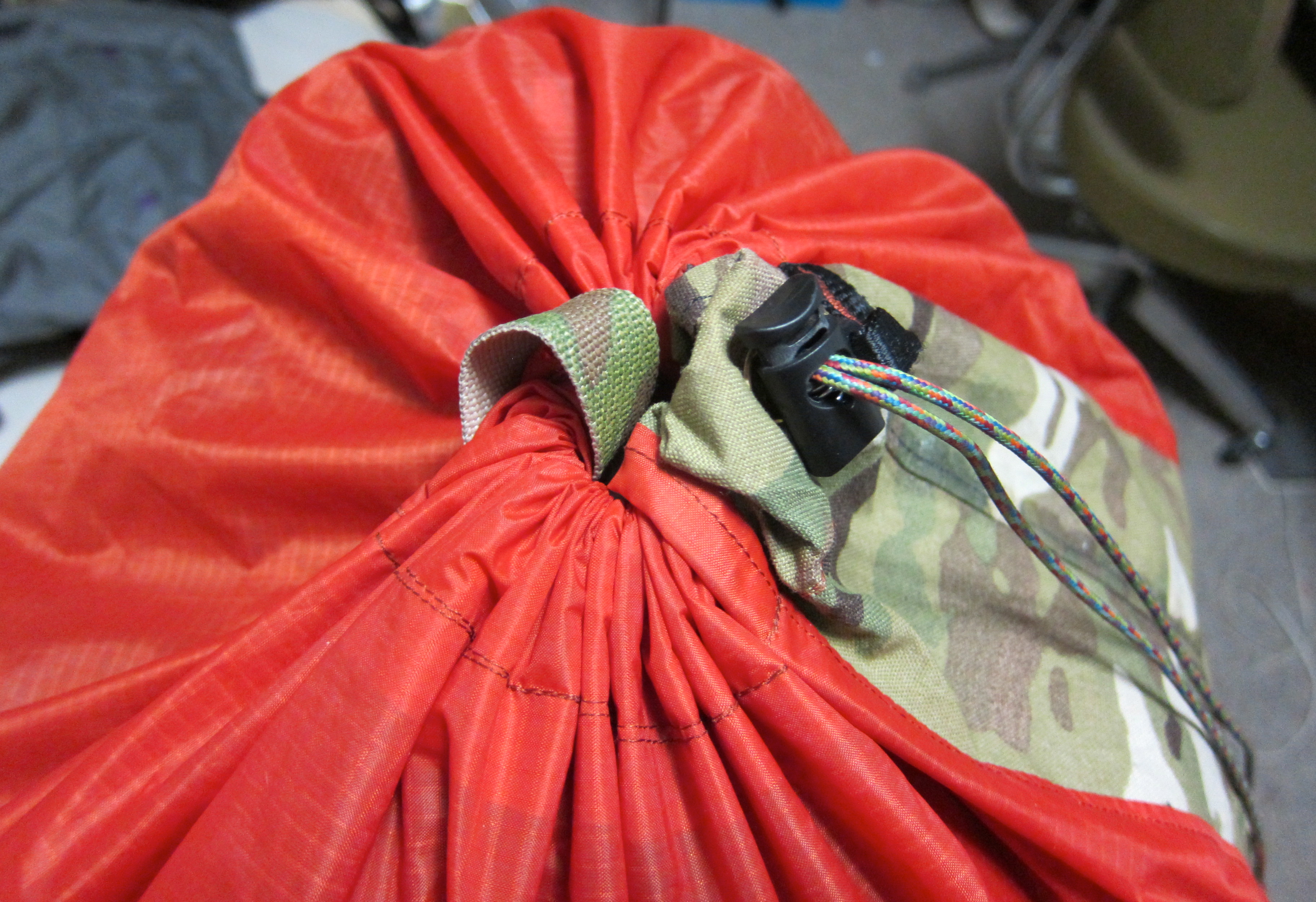 For reasons mentioned earlier this week I like drawcord cinches. When you attach the cordlock to the bag and provide a grab loop on the opposite side of the collar, this system is very fast. I used some orange 40D sil/PU I had hanging around for the top 8 inches of the collar, to save weight, seal better, and provide a bit of safety during hunting season.