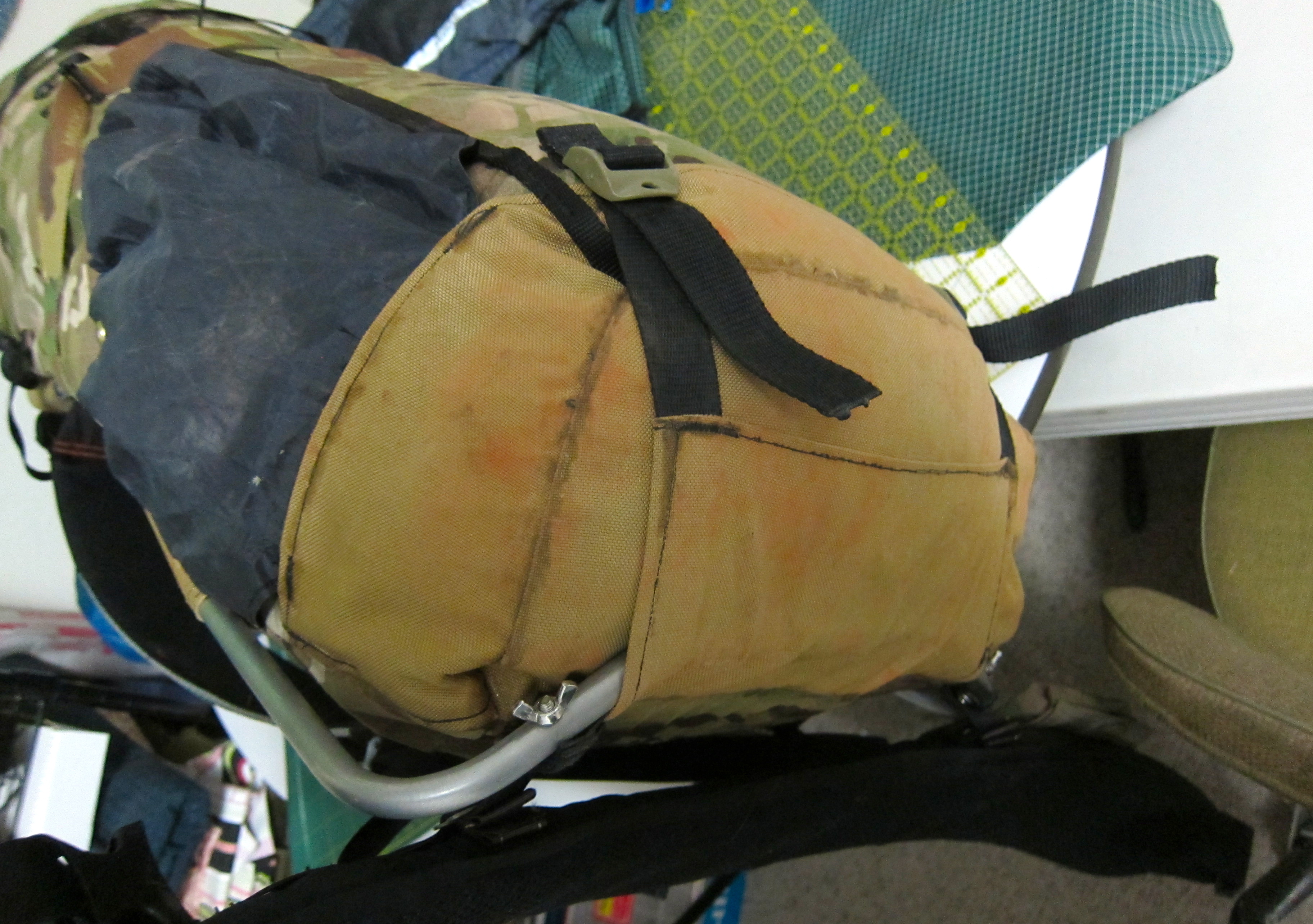 Big packs get more abuse the midsized packs (because a heavy load added to a tired hiker equals less care), but less than small packs (which get used most often, and for the most abusive things). Therefore the bottom of this bag is 1000D cordura. The sides are double layered cordura over X33, while the bottom is just a single layer of cordura. A double bottom is largely unnecessary with the bottom flap, and starts adding enough layers that my machine has a hard time stitching it all. Plus over the year I’ve most consistently gotten holes in packs right above the bottom along the sides.