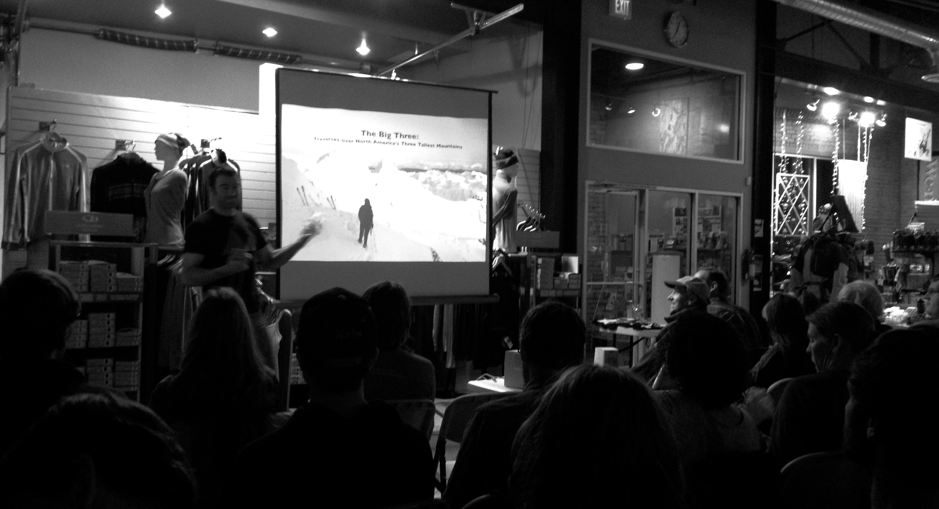 I’d not seen Luc speaking with a capitol P until a few days ago, and was not surprised that he did exceedingly well. He has fantastic photos and video, and as mentioned above a great way of telling us about them, to say nothing of a story very much worth telling. He framed the journey of Wilderness Classics to Denali to Logan to now in terms of Csikszentmihalyi’s work on flow; that an ideal wilderness trip takes a space somewhere along the line between control and flow, with occasional sojourns into arousal. This is a moving target as skill (and one’s ability to consistently operate closer to the actual ceiling thereof) is constantly changing. Optimizing reward on and of a trip is tied up in two parallel processes, maximizing flow by matching terrain (challenge) to skill, and best understanding as exactly as possible where your control/flow boundary lies. Do these things and you’ll have a lot of fun, in the deeper sense.