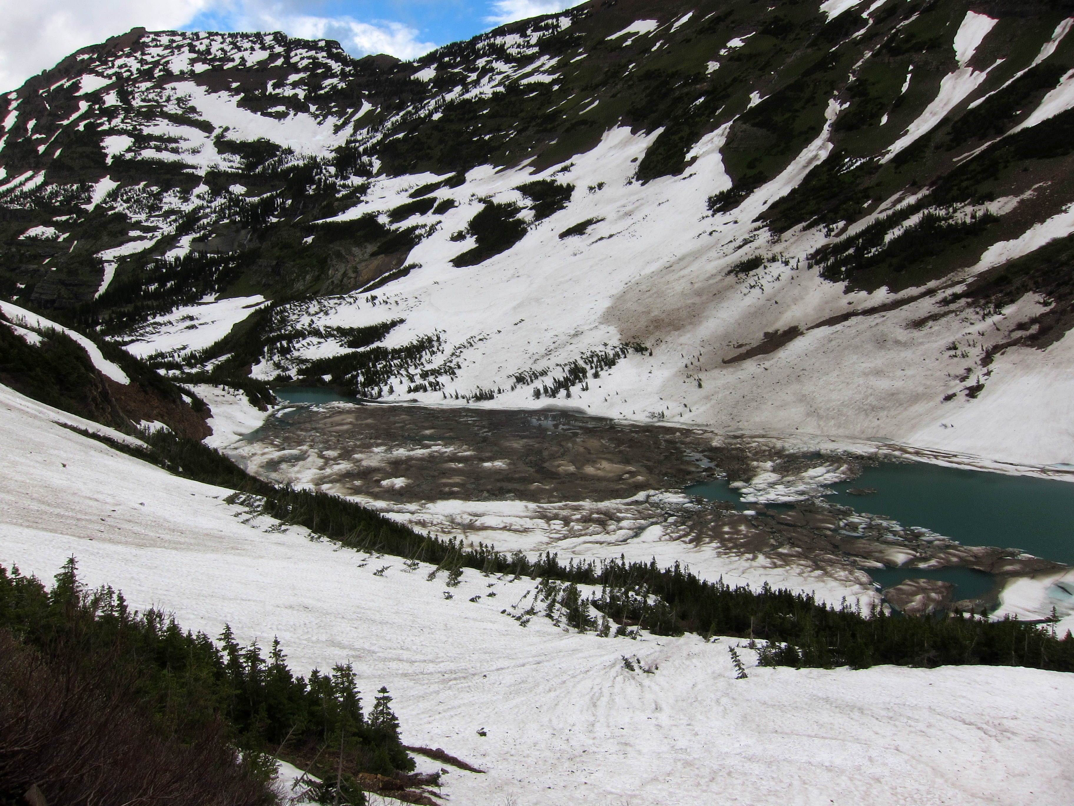 I hiked all day, through rain and mostly over snow, to get up to the campground which sits just of the sight to the left, at the foot of the lake. The campground was still under 5-7 feet of snow, and I was left with the task of arranging my tarp out of the driving wind on the flattest piece of snow I could find. I slept on my deflated packraft and stuck my empty pack into one end of the tarp to keep the rain out when the wind shifted, and took a long time to fall asleep with my body heat slowly drying damp clothes. I was greeted the next morning with warm sun, a brilliant crampon crossing of Stoney Indian Pass, and the rare sight of Stoney Indian Lake full of avalanche.