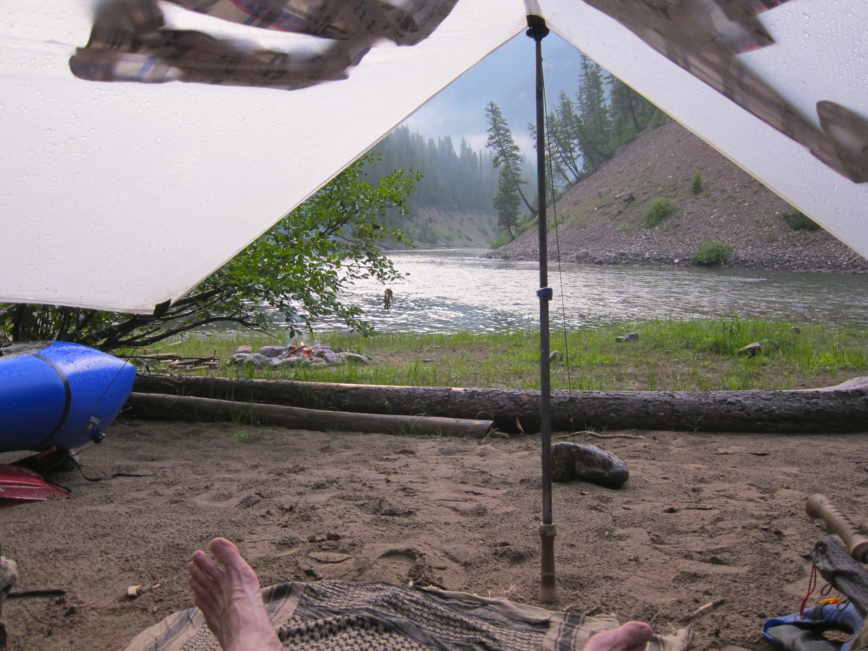 Somehow between M and I the best photo we have of a truly great camp on Danaher Creek is this one, of the LBO and the stacked rocks necessary to pitch it. After a long first day of hot hiking and fun rafting M, Luke, Spencer, and I were close to the confluence with Youngs Creek. Ryan Jordan and Scouts had been down days earlier, and thanks to sat blogging we knew to expect a big wood portage. We found it late, right before we lost the sun and the cold set in. It had plenty of flat sand camping, good water, firewood, and a few fishing spots all close at hand. When I roosted a big bull Moose out of the willows scoping the place out I knew we had good mojo, and called it a day. I caught 4 fish with my first six casts, and we had a fantastic night roasting and eating them around the fire. This trip, sharing a great loop in the Bob with folks mostly new to wilderness rafting, was one of my favorite trips of the year, and this camp was equal to all the good stuff which came before and after.
