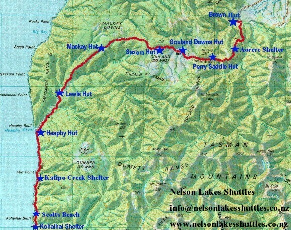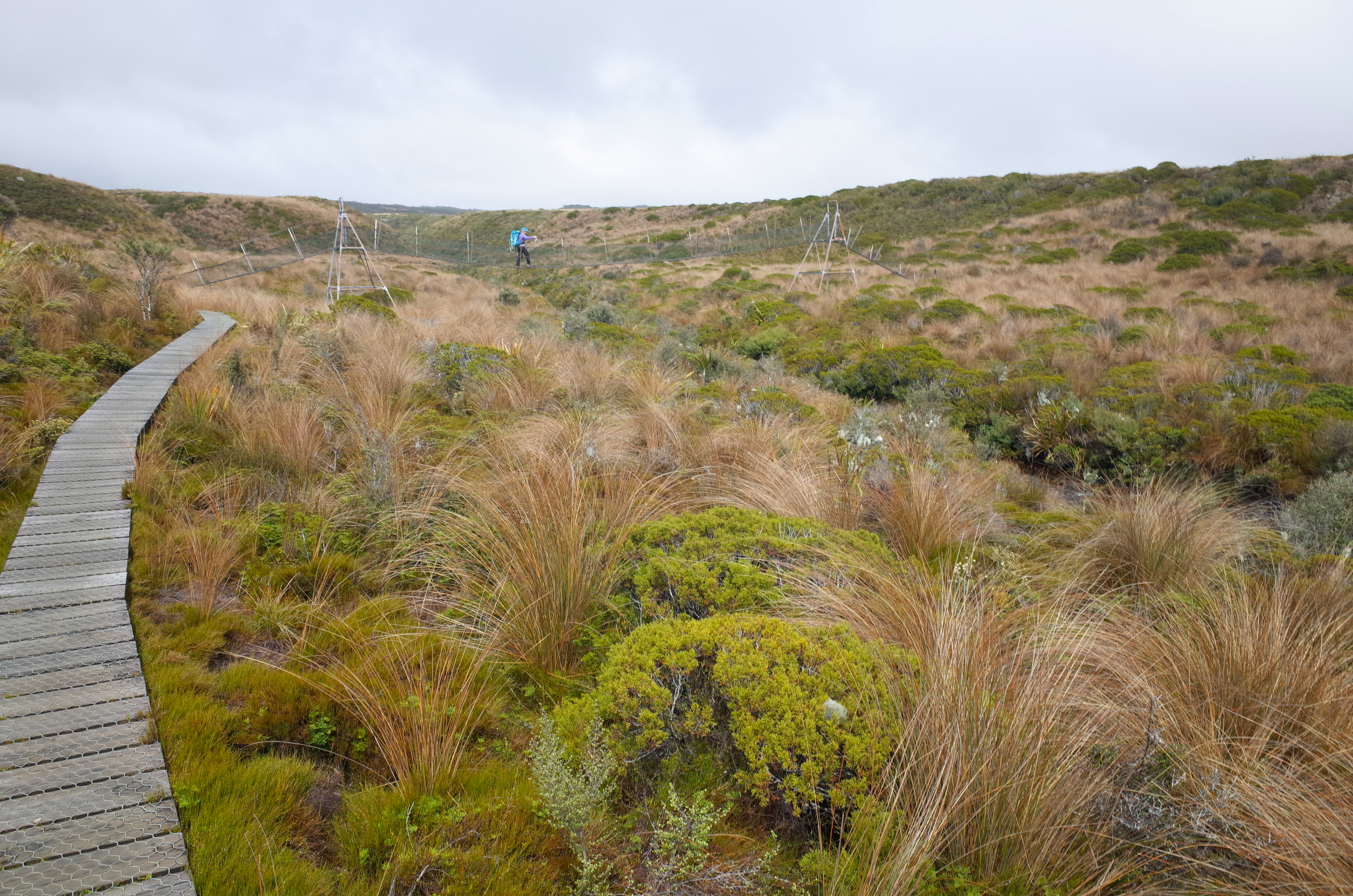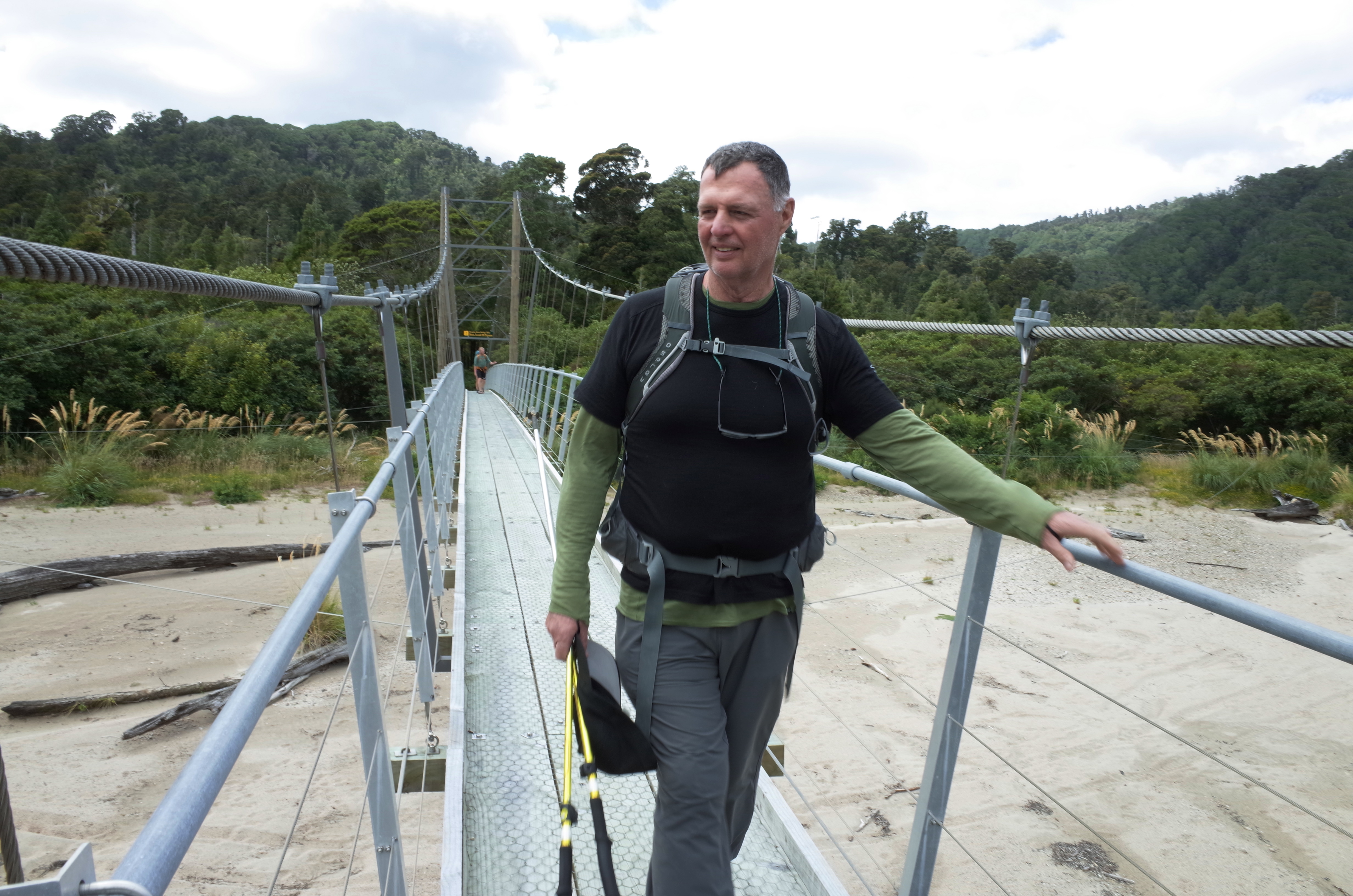 Day three featured two distinct sections; a long descending traverse down to the suspension bridge across the Heaphy River, and a flat track through the thick woods alongside down to the Heaphy hut, within sight of the ocean.