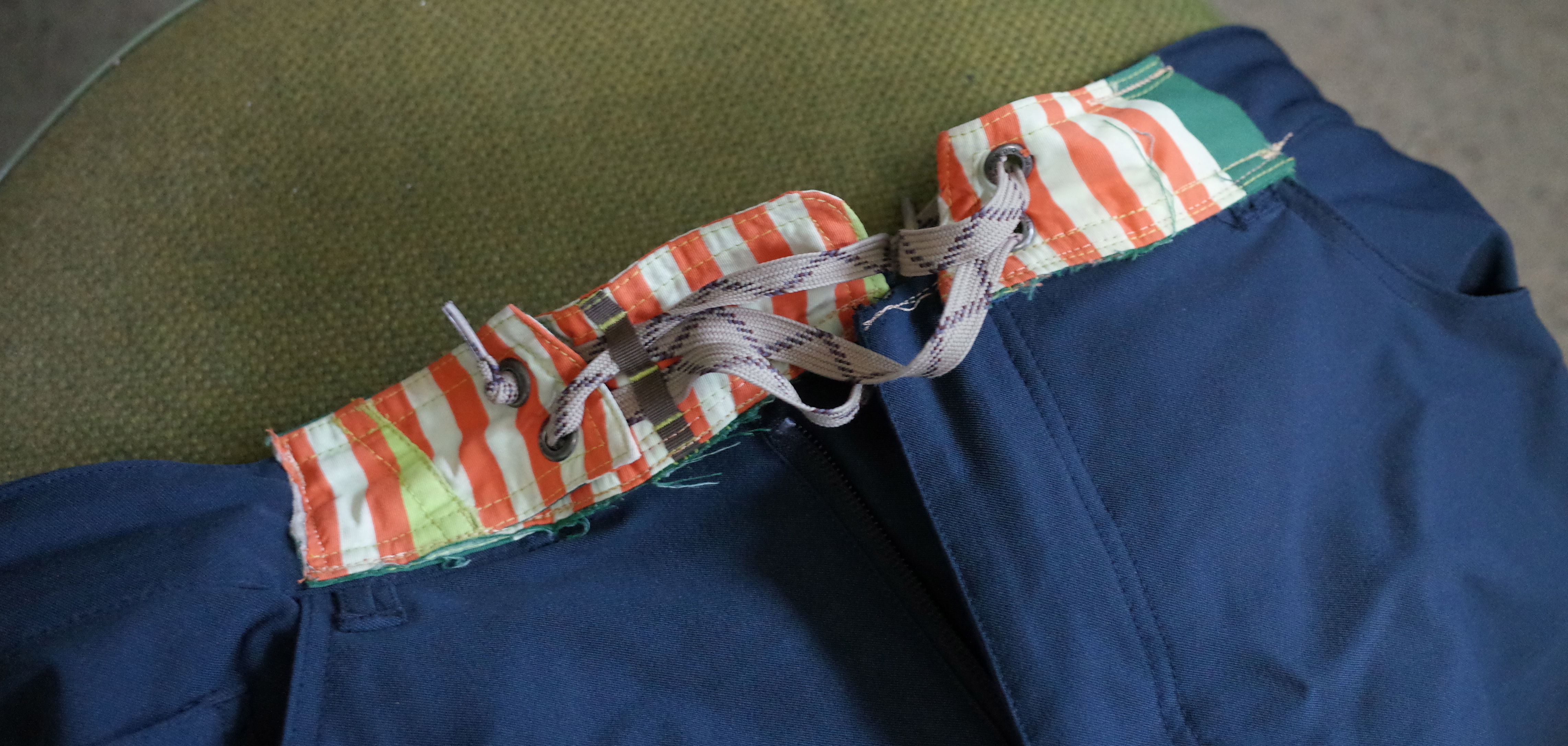 Lace closure from a destroyed pair of Patagonia board shorts added to BD Rock jeans. The best pant/short closure, in my book. I also removed the belt loops from these pants to eliminate all possible pressure points.