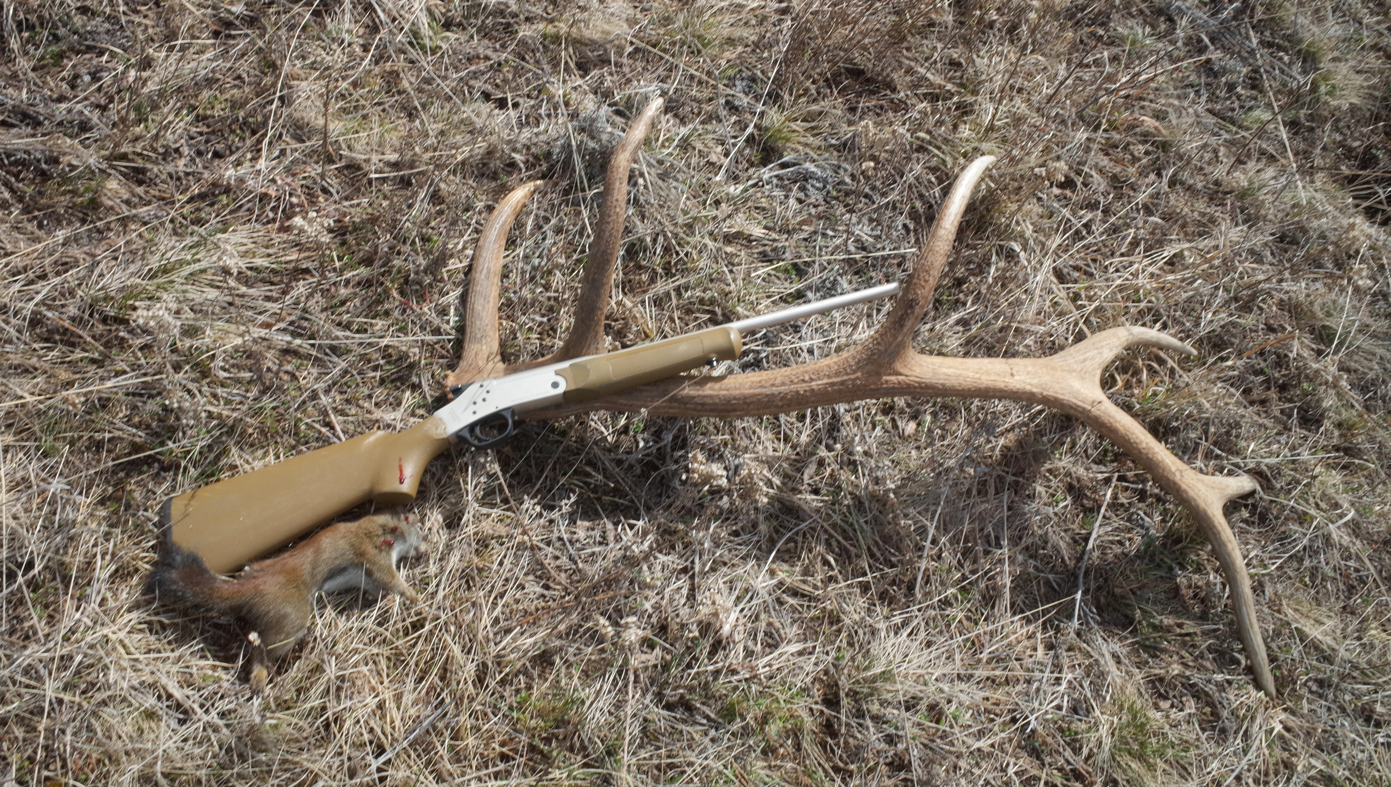 I brought my toy shotgun along to hunt small game, and ate fried and braised squirrel and onion the first night. After stalking the sheep I was back up the hill at my pack eating chocolate when a squirrel trilled in the woods. After some hurrying and some standing and listening I located the little fellow. Walking over to retrieve the carcass, I found an impressive elk shed.
