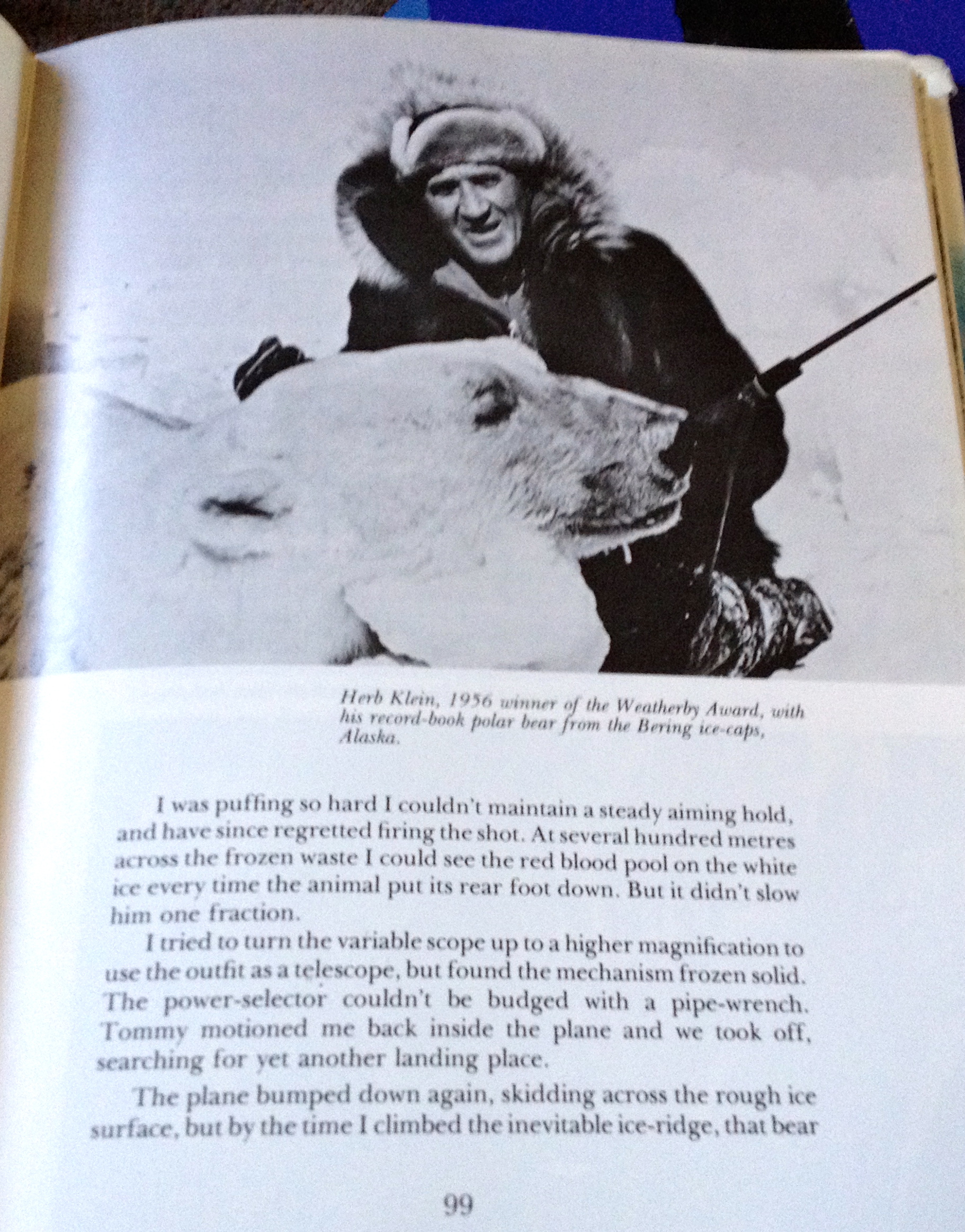 Roy Weatherby, famous rifle pioneer, contributed a story of polar bear hunting in Alaska, shortly before the practice was banned in the United States. Weatherby and his party are guided out ofthe Kotzebue, Alaska area and hunt in late winter out of planes. They spot bears from the air, land as close as possible, stalk, and shoot. Weatherby details wounding a bear with a hasty shot, being unable to administer a good followup shot (grease lubricating the power ring on his scope was frozen), and chasing the bear down via multiple plane flights before it is killed. He intimates, but does not explicitly state, that they left the carcass on the sea ice after taking hide and skull.