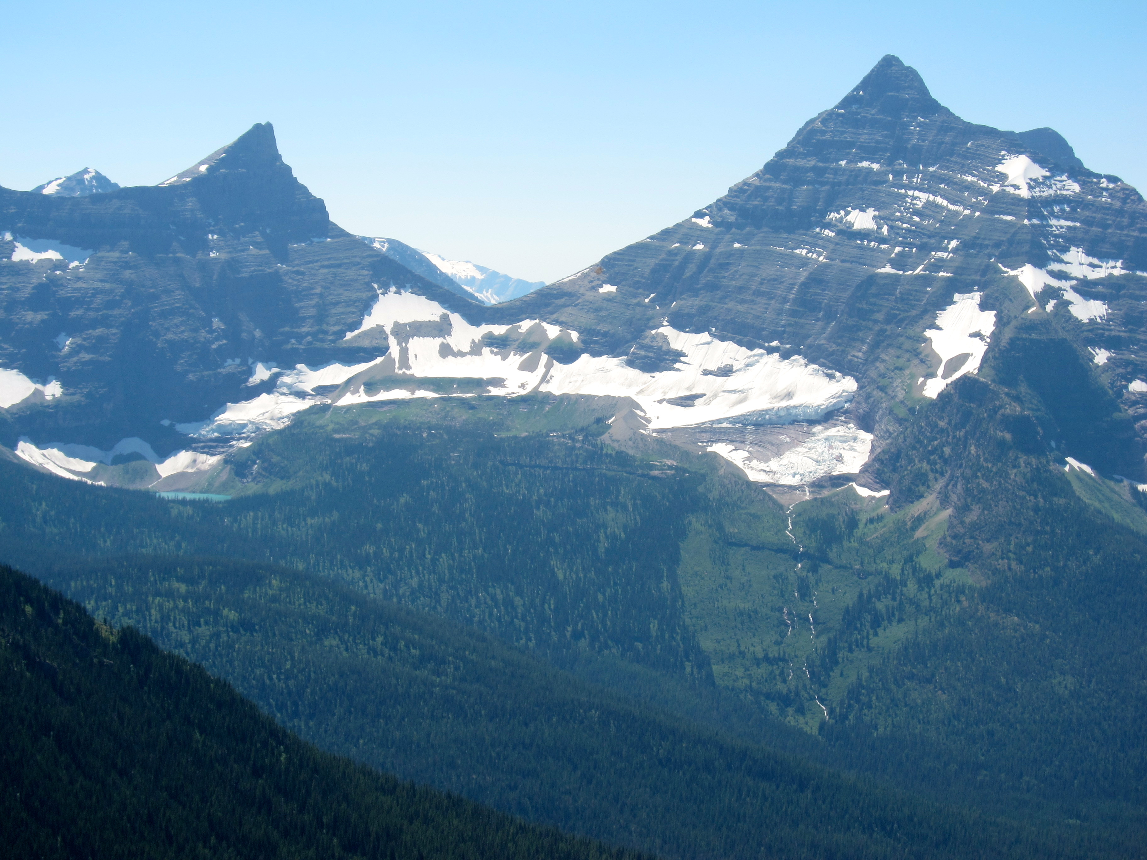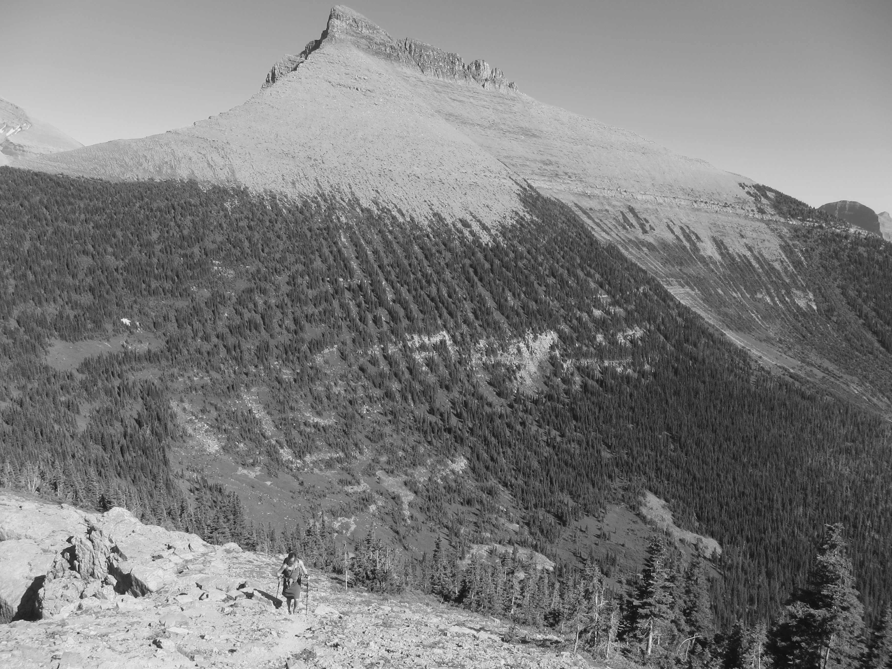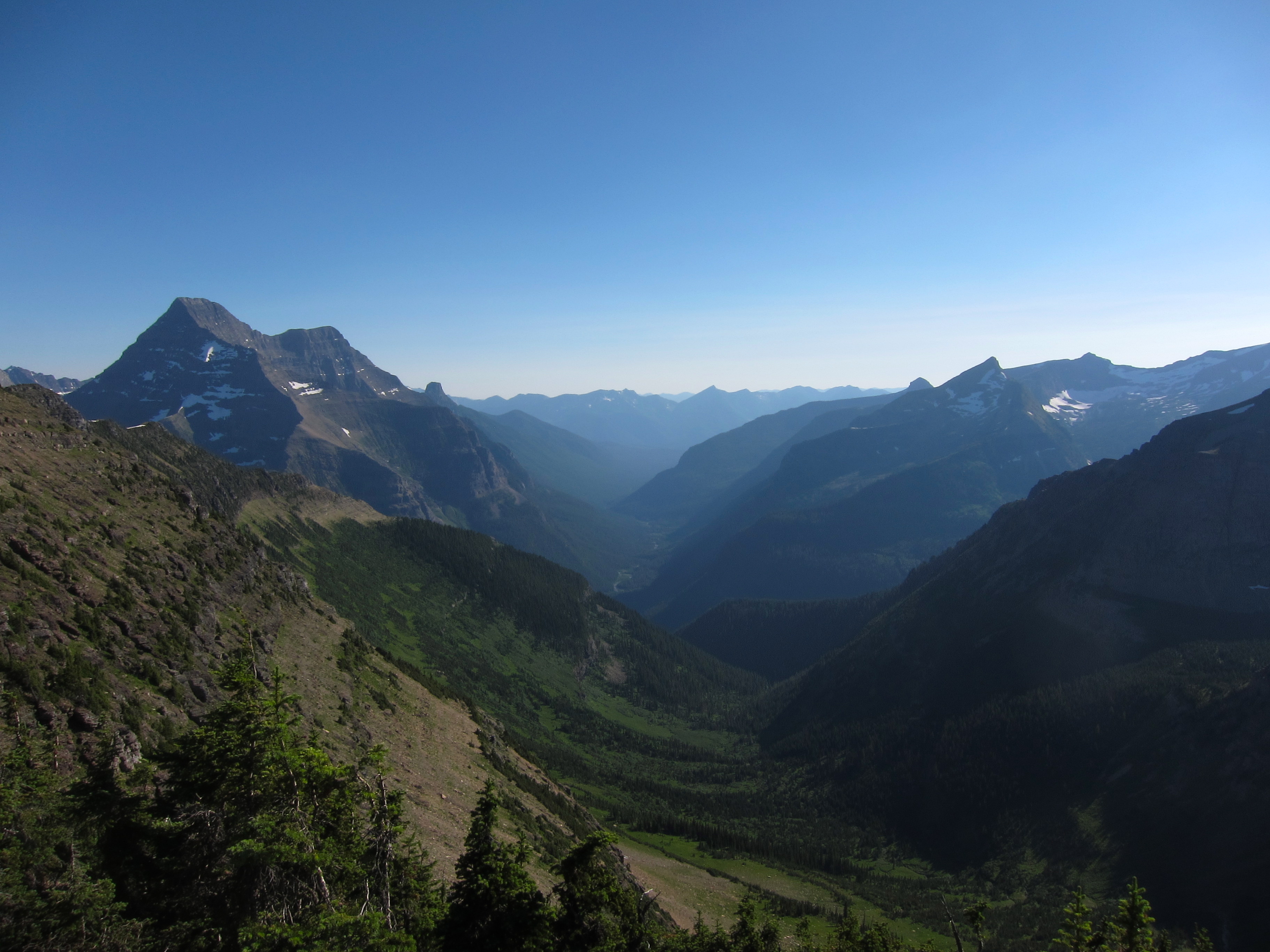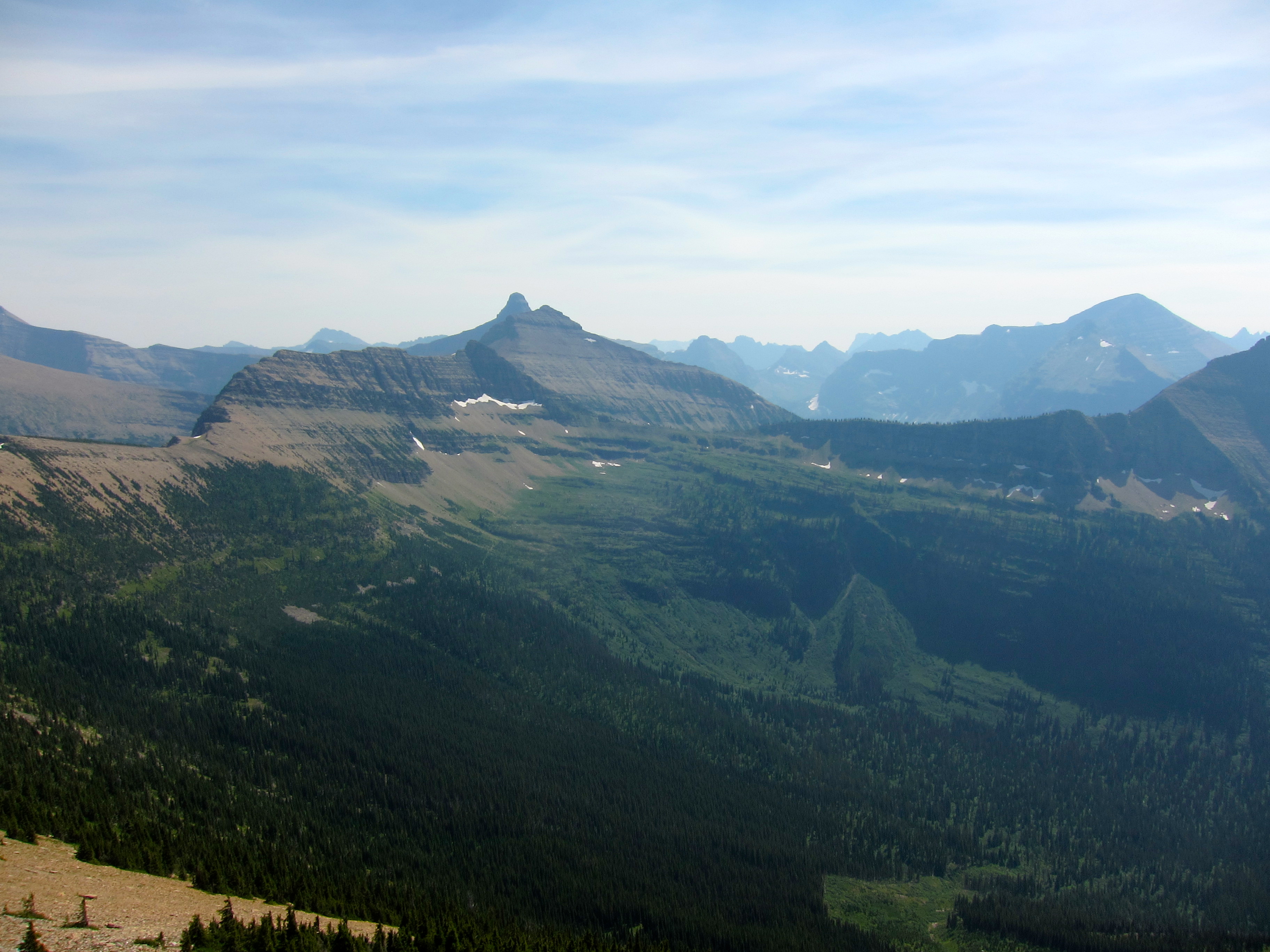This photo was taken from the east shoulder of Razoredge and looks south across the basin towards McClintock. The Cutbank Pass trail descends the far wall, and later that day we saw a big group of bighorn rams in the meadow just left of center. All of the forest pictured is presumably on fire.