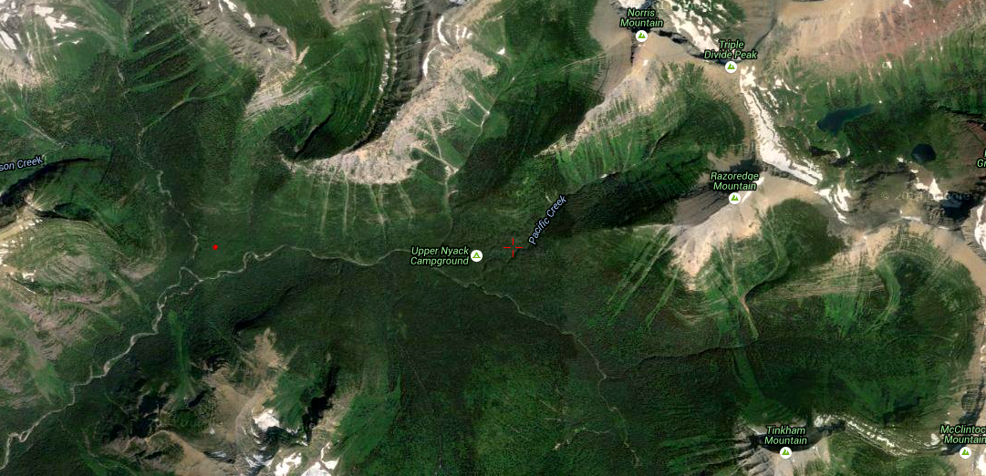 The red dot denotes the probable starting location, and the fire has spread east along the slopes of Nyack Creek into all the immediately associated basins show above. The Upper Nyack campground and the nearby patrol cabin are most likely toast, along with vast tracts of oldish growth pine forest, subalpine forest, and plenty of slide alder hellholes.