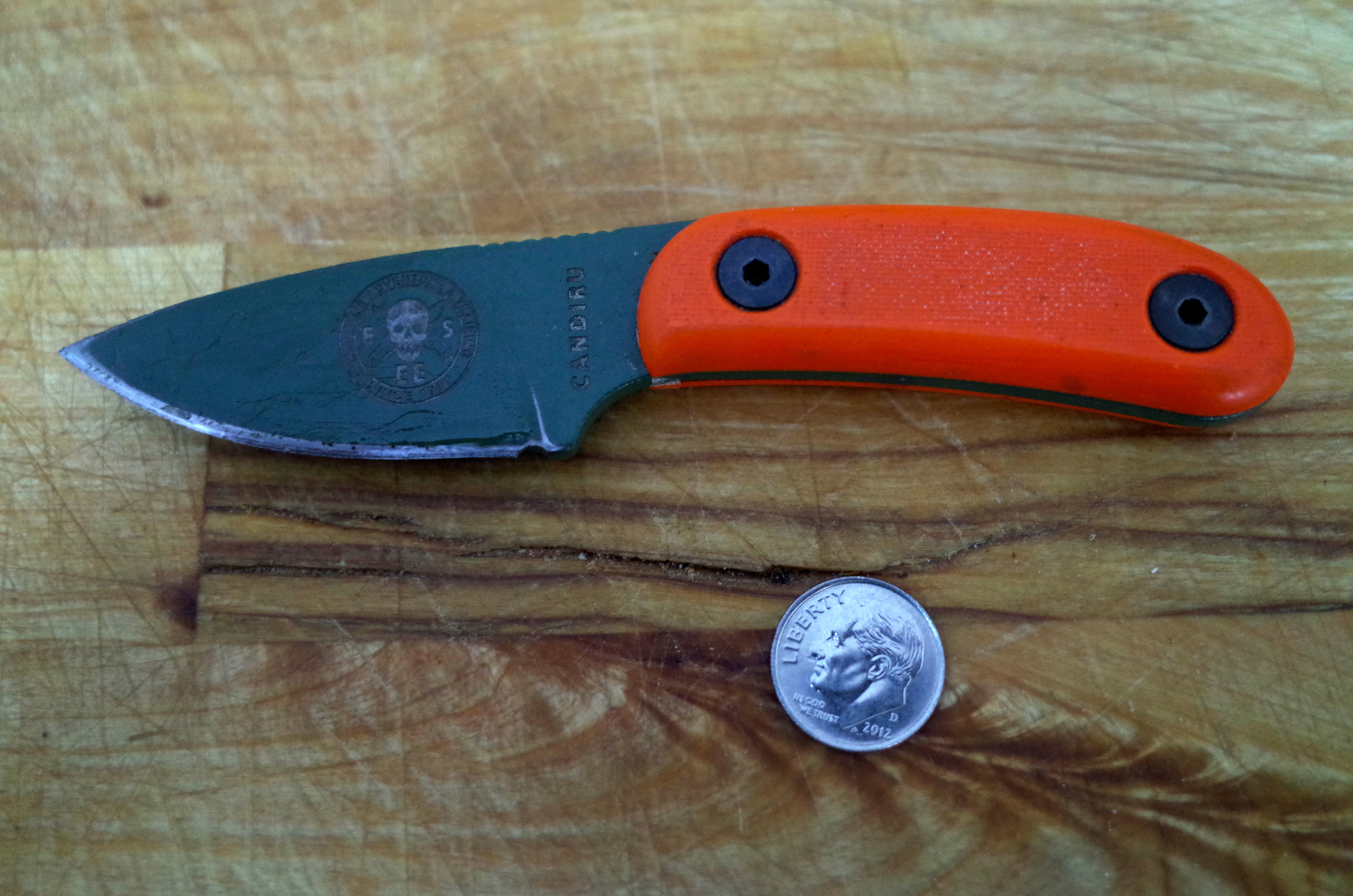 The Candiru is a very small fixed blade. It’s a hair over 5 inches long, with a 2 inch long, .125 inch (or 3.2mm) thick blade, and is made from powder coated carbon steel. Handles (“scales”) are available, which attach with bolts. The steel is powder coated for rust resistance, in a variety of colors (had purple been available last year I would have bought that). You can buy the Candiru as pictured here for about 65 dollars. A year ago this included a nylon and velcro belt sheath; today it includes a kydex (molded plastic) sheath.