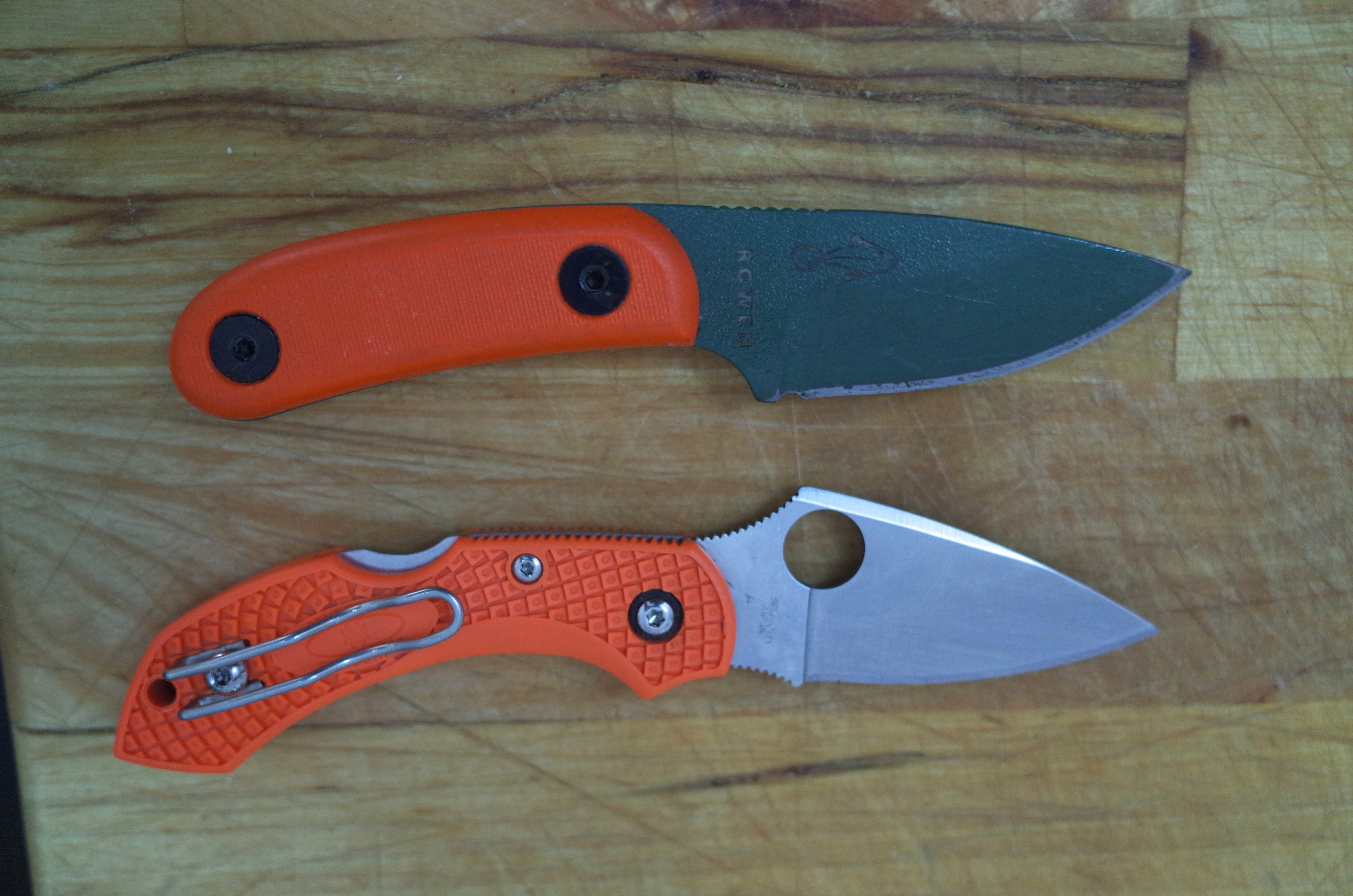 The Candiru is similar in many ways to my “normal” knife, the Spyderco Dragonfly 2 pictured above. Both have similarly dimensioned blades, and handles which work bigger than they measure. Both are very handy. The Spyderco comes sharper from the factory, and slices better due to this and being much thinner. Would I want to beat on in way back in the woods during a tricky situation? Not really.